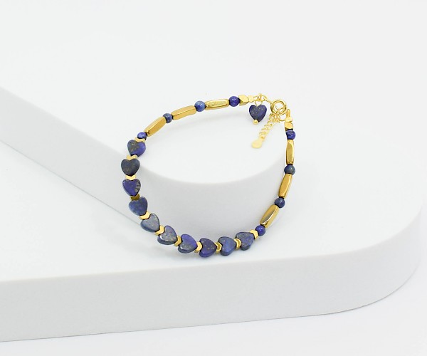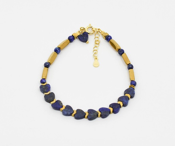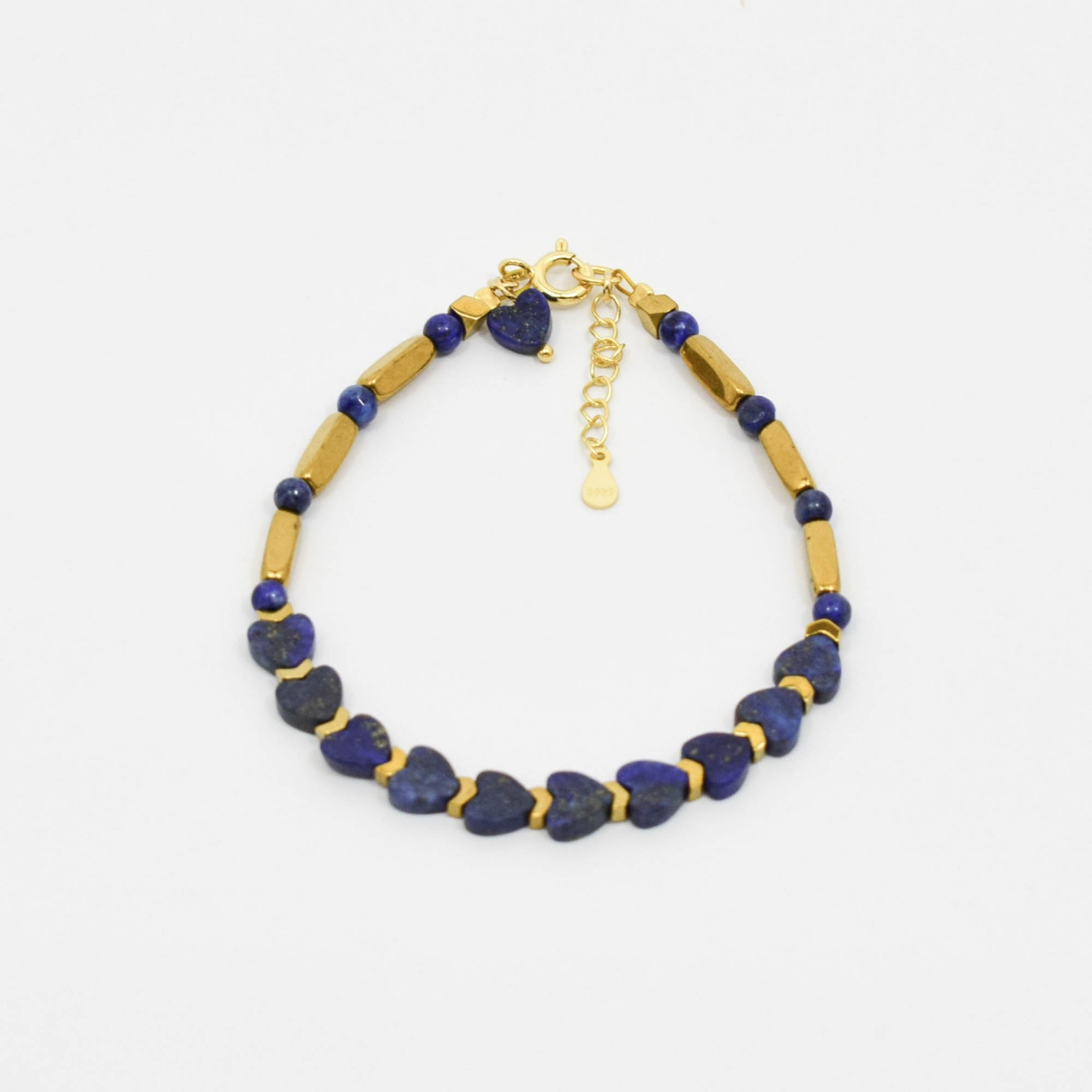 Bratara cu lapis lazuli, hematit electroplacat si argint 925 aurit. Fiecare piatra semipretioasa este unica si exista posibilitatea sa apara mici diferente fata de modelul prototip din imagine.