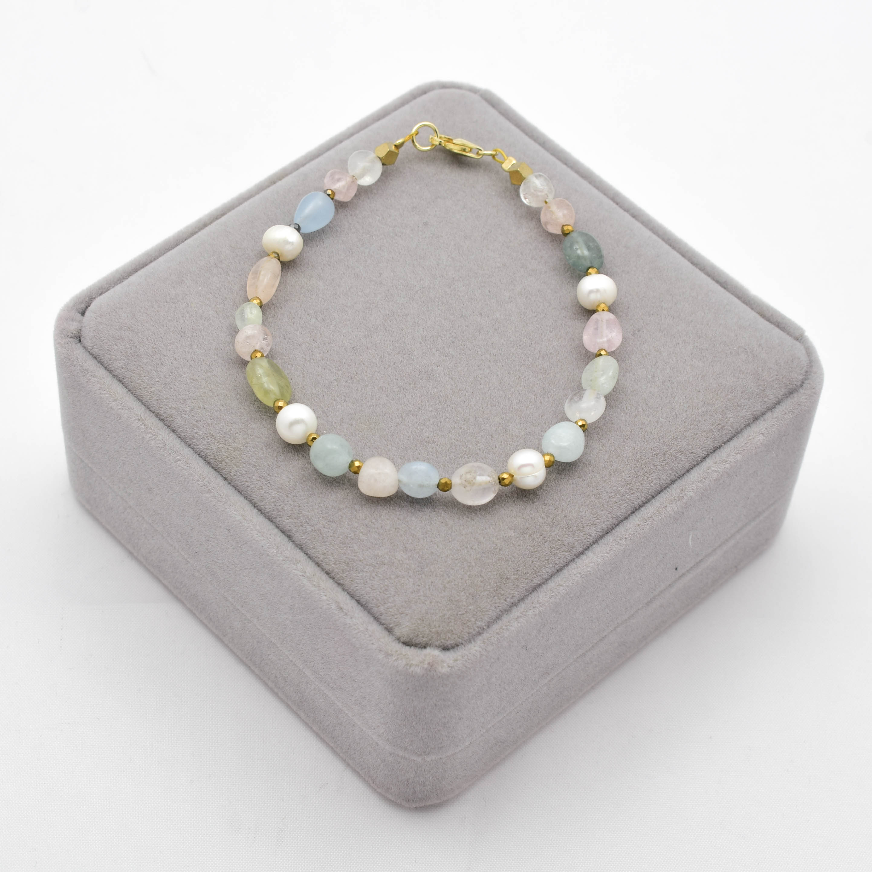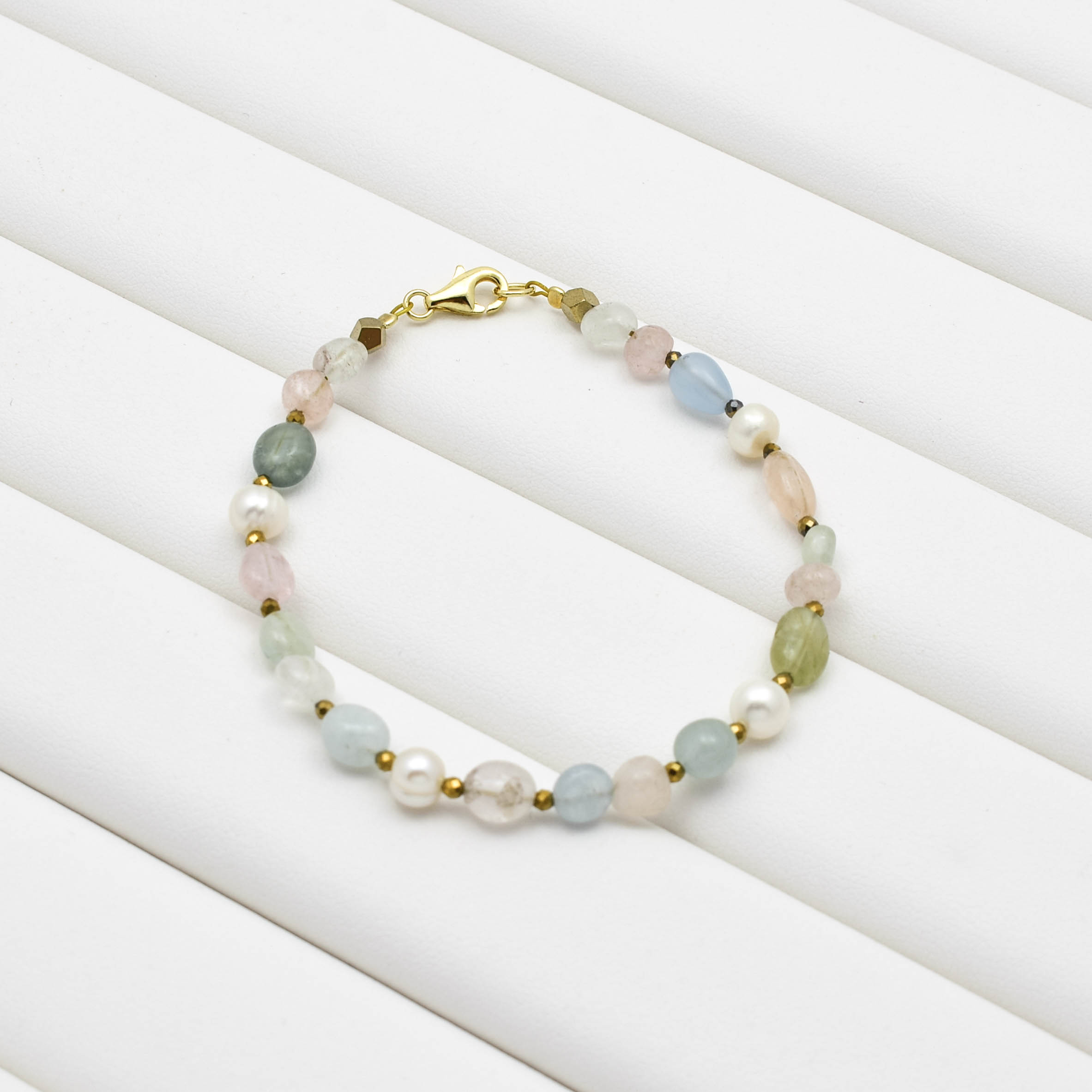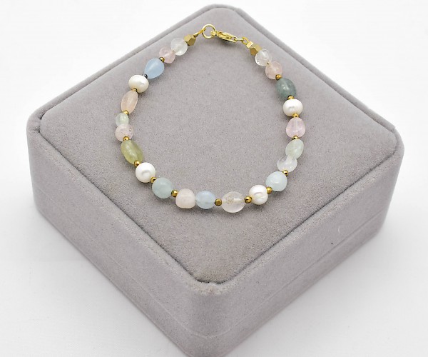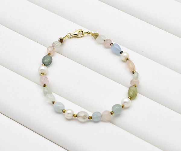 Bratara din morganit, perle de cultura, hematit electroplacat si argint 925 aurit.