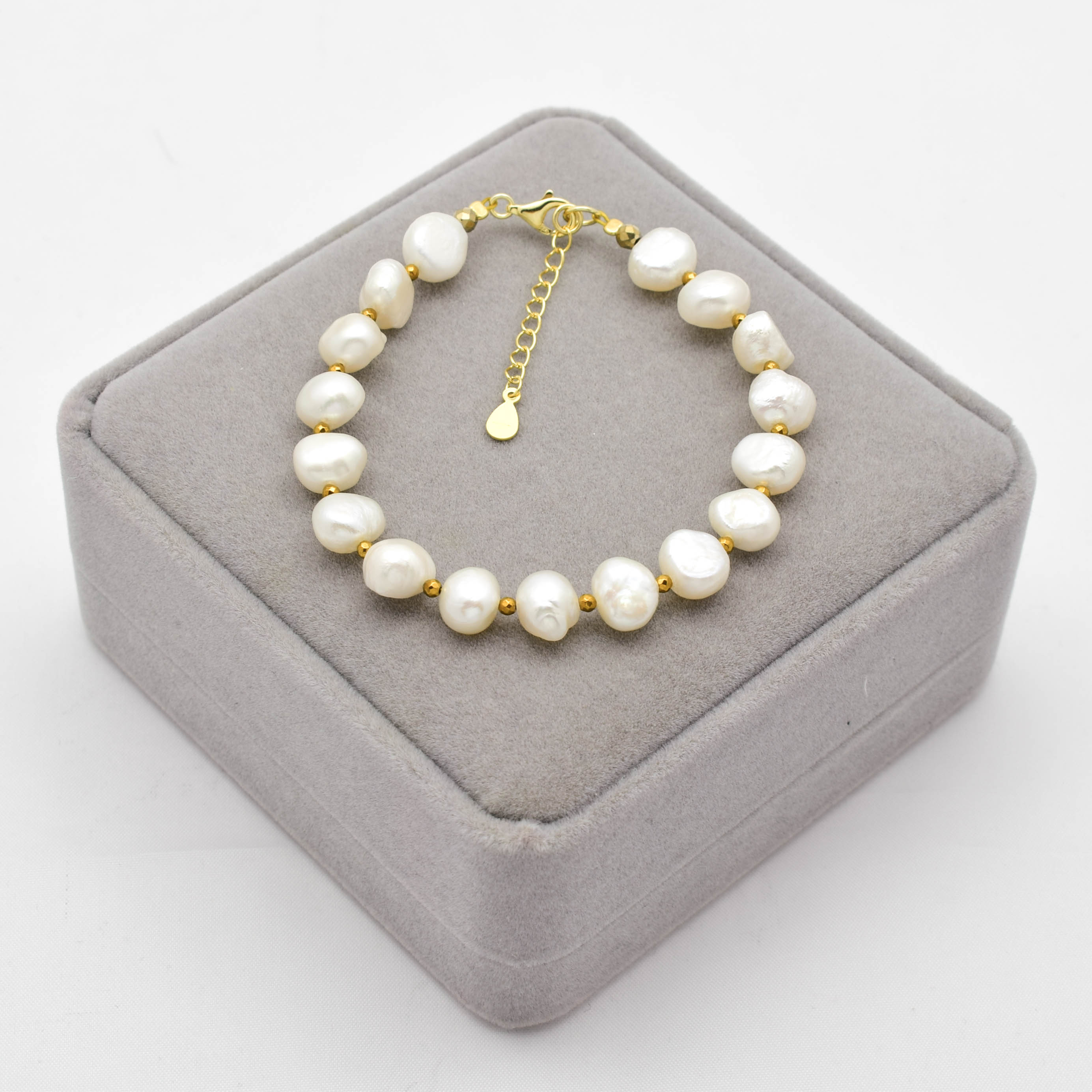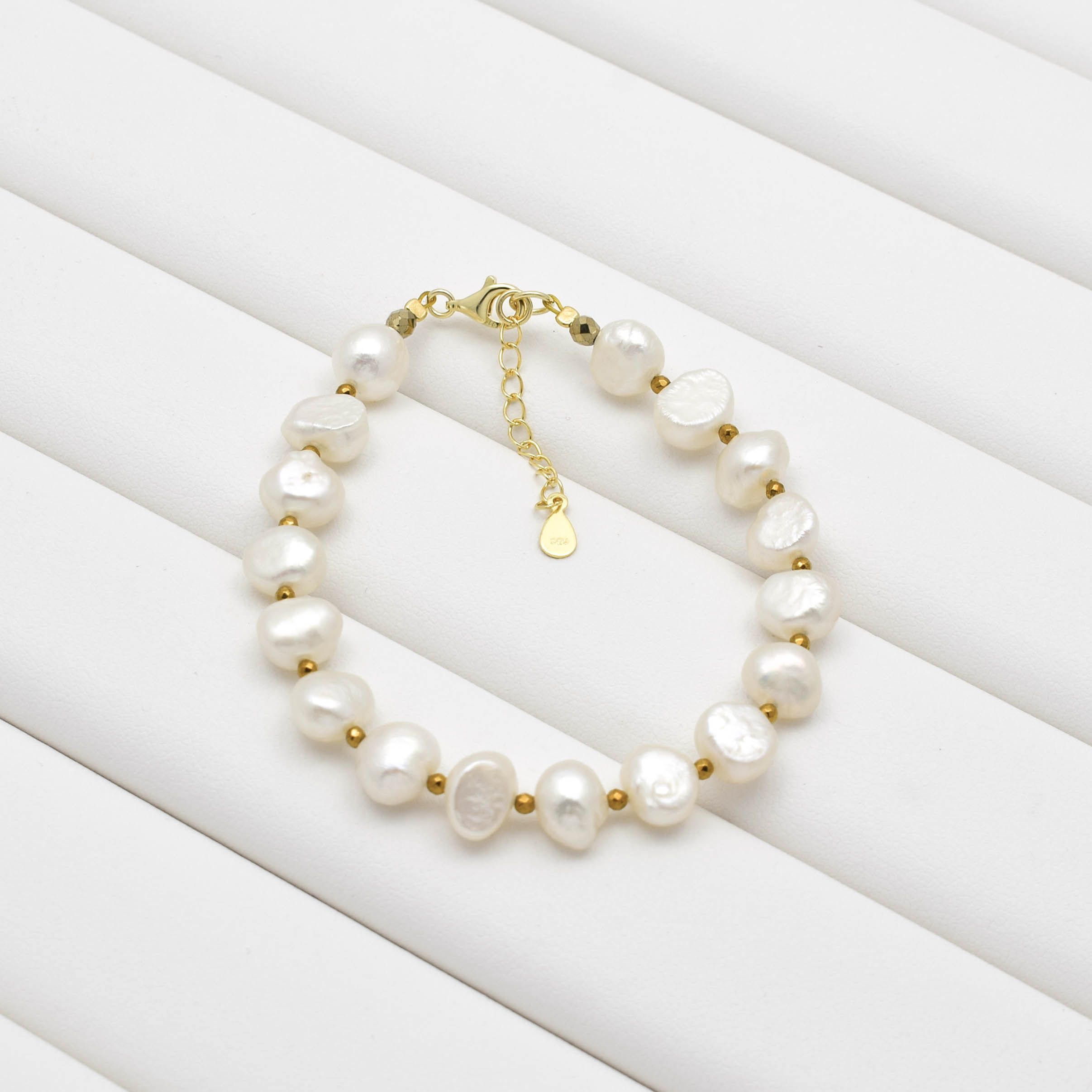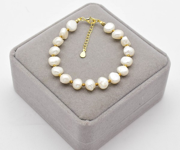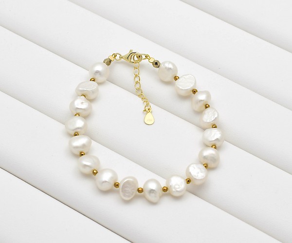 Bratara cu perle de cultura albe, hematit electroplacat si argint 925 aurit.