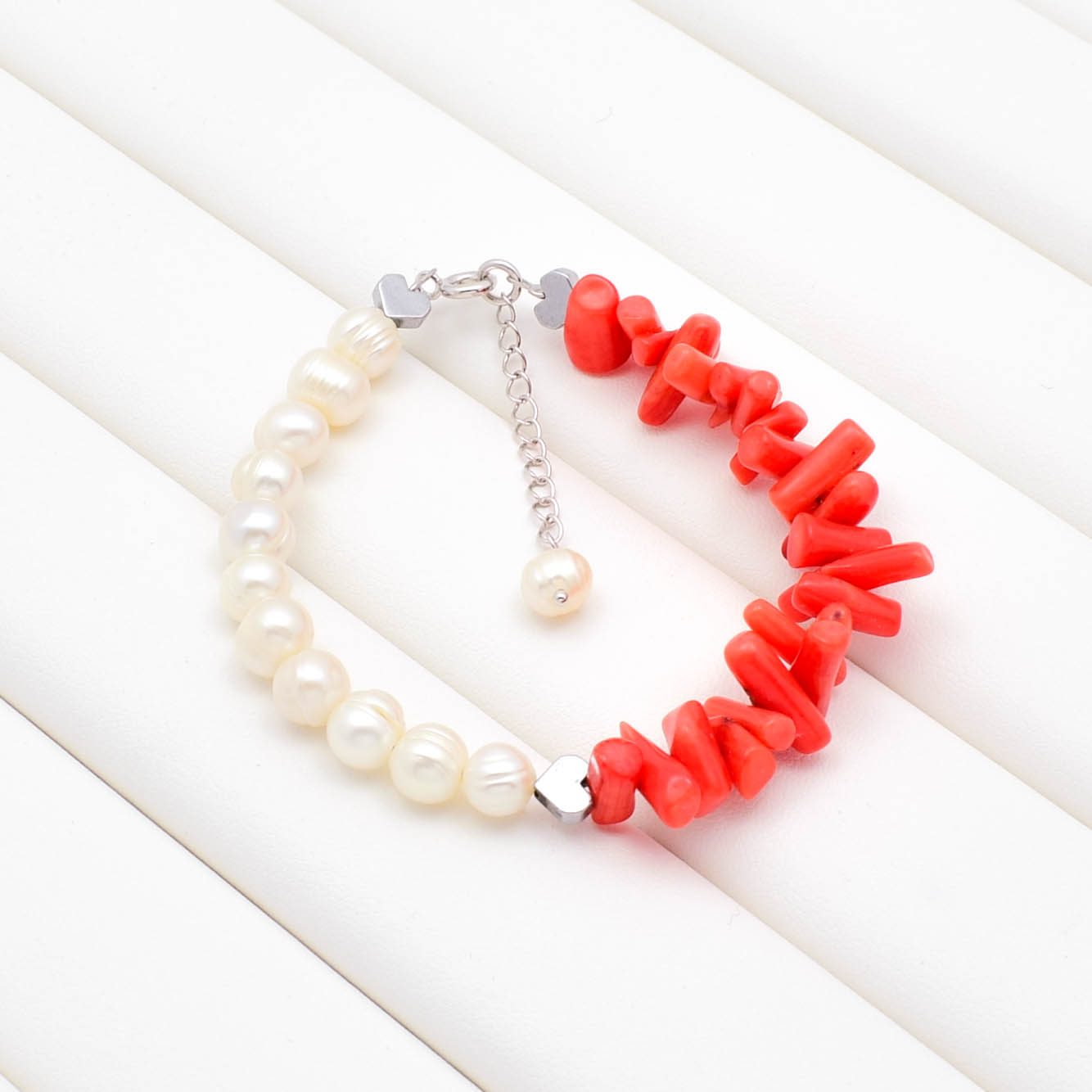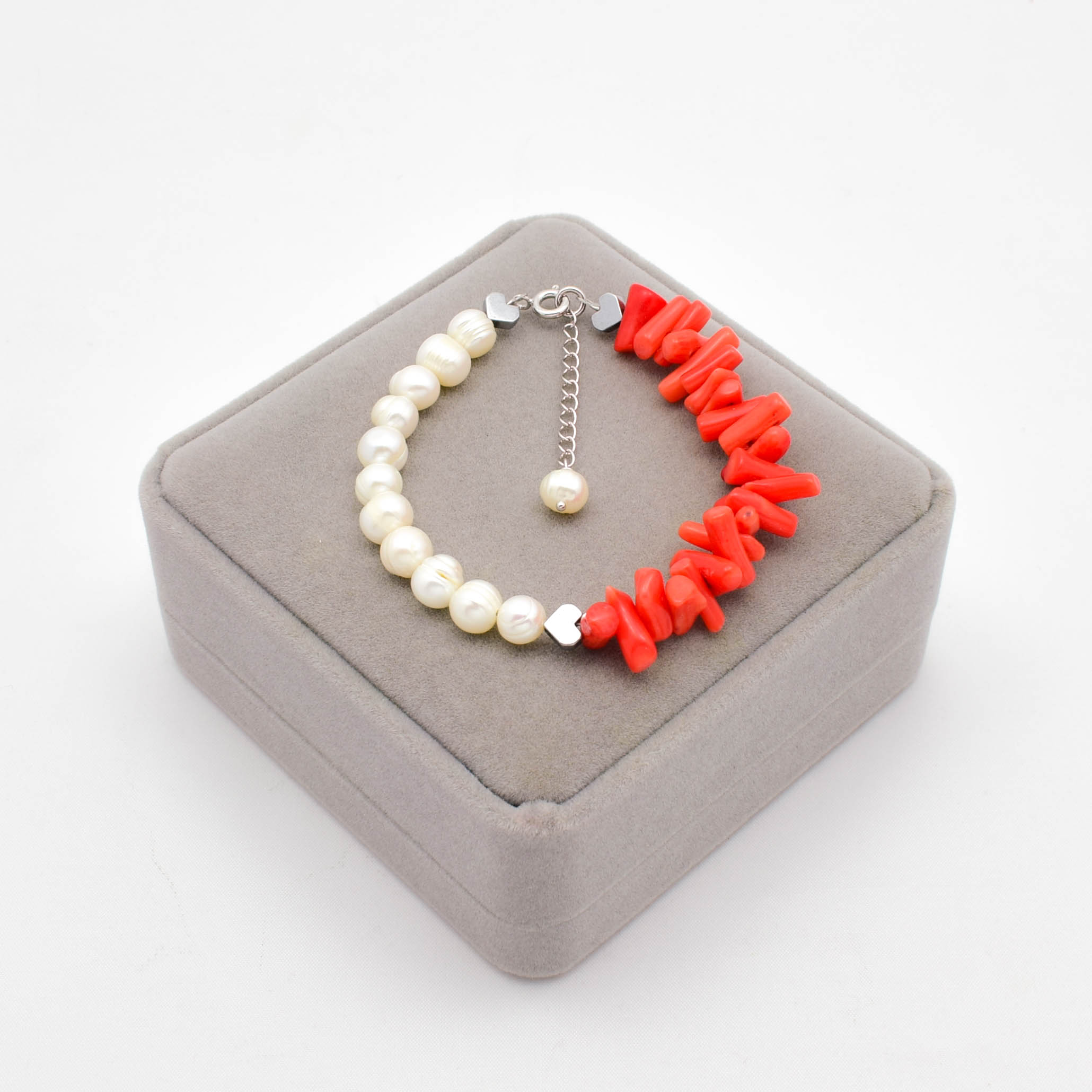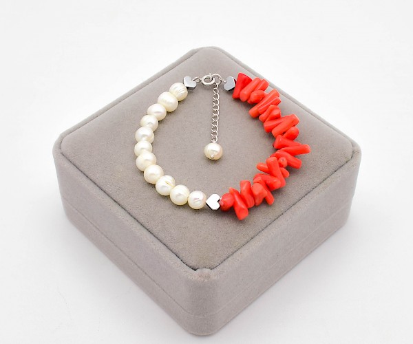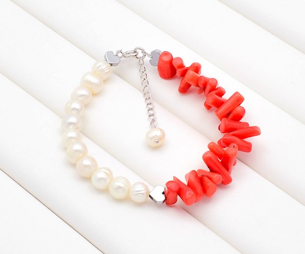 Bratara din argint 925, perle de cultura, coral portocaliu si hematit electroplacat.