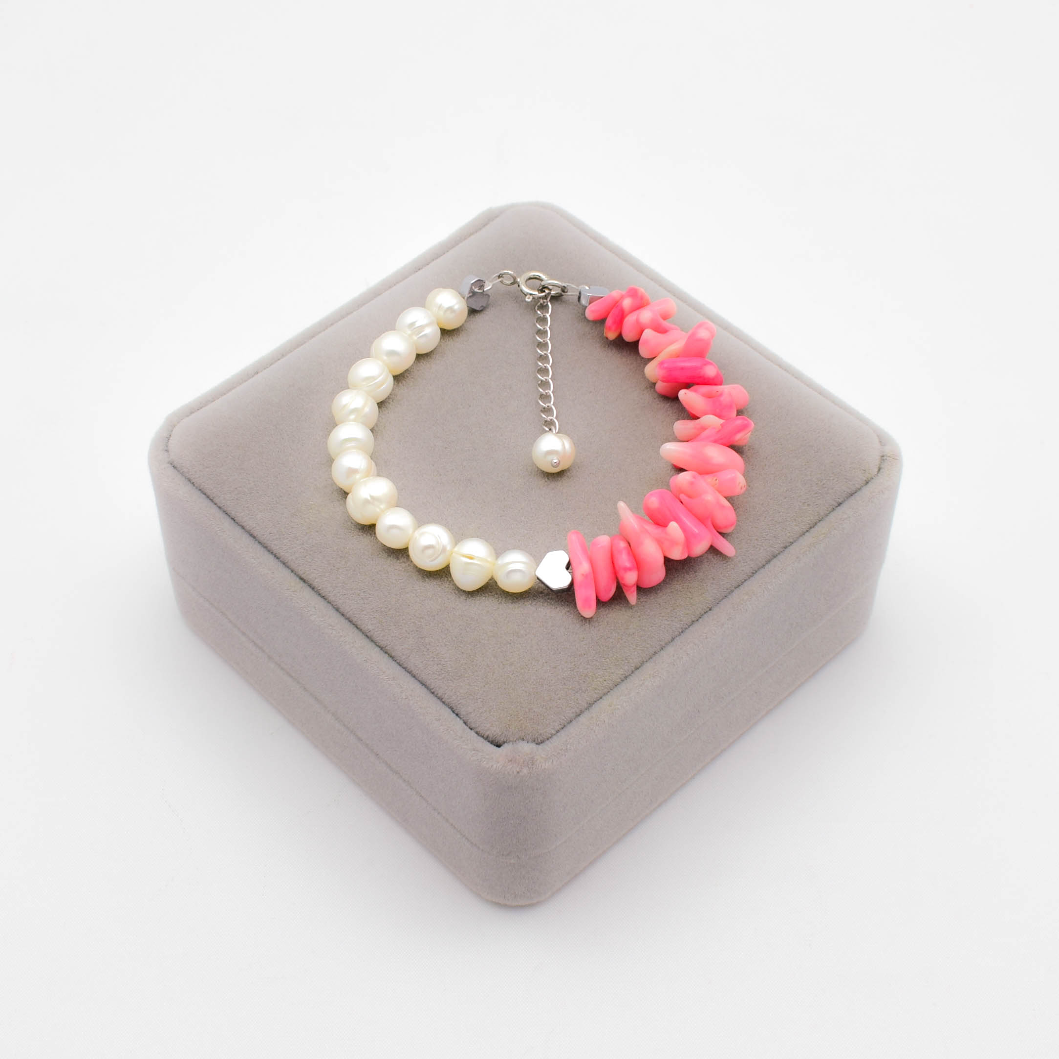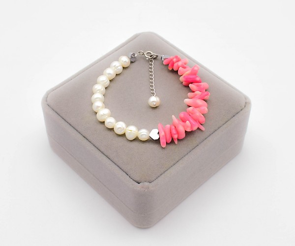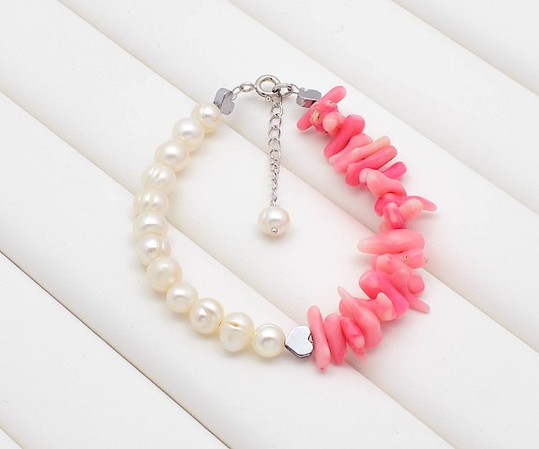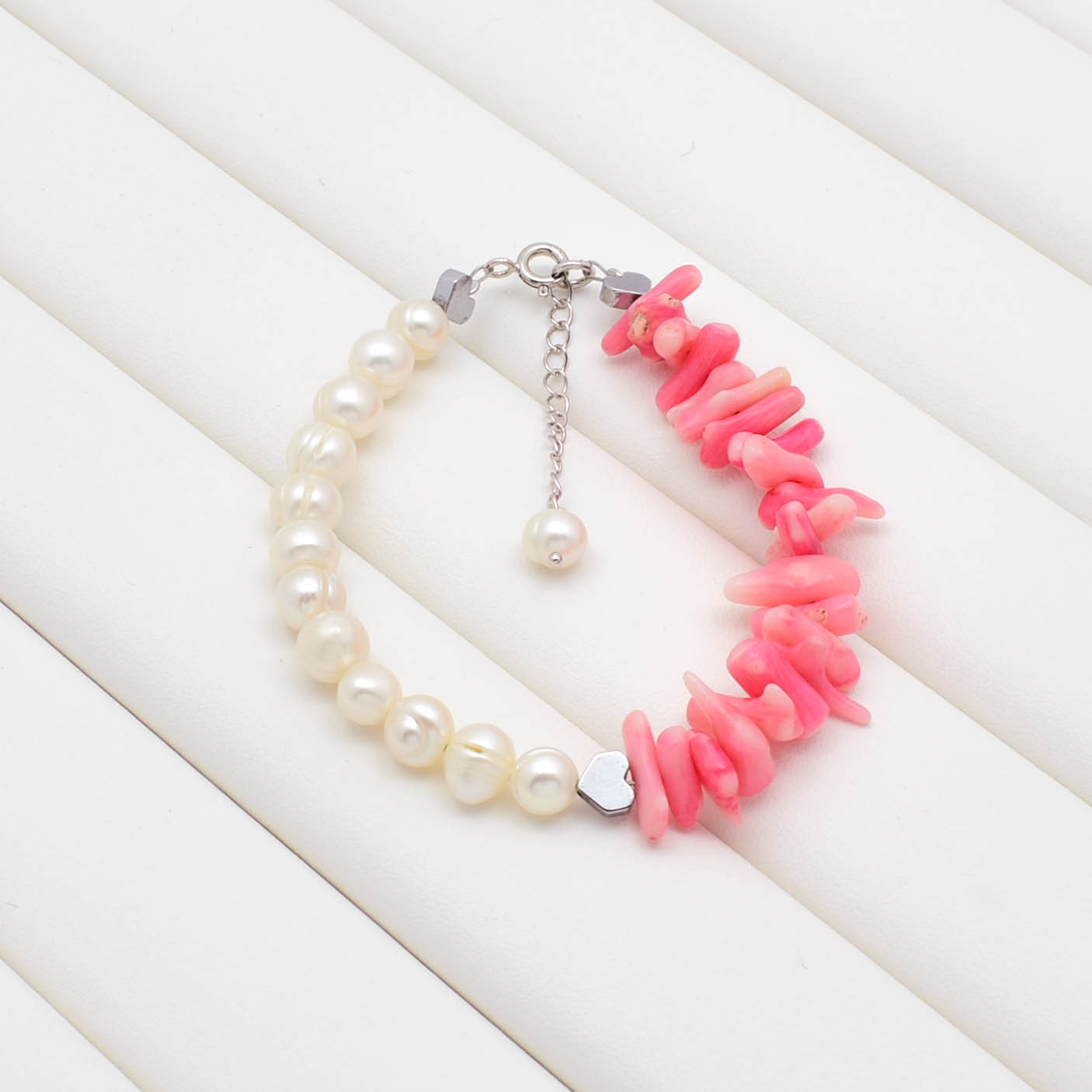 Bratara din argint 925, perle de cultura, coral roz si hematit electroplacat.