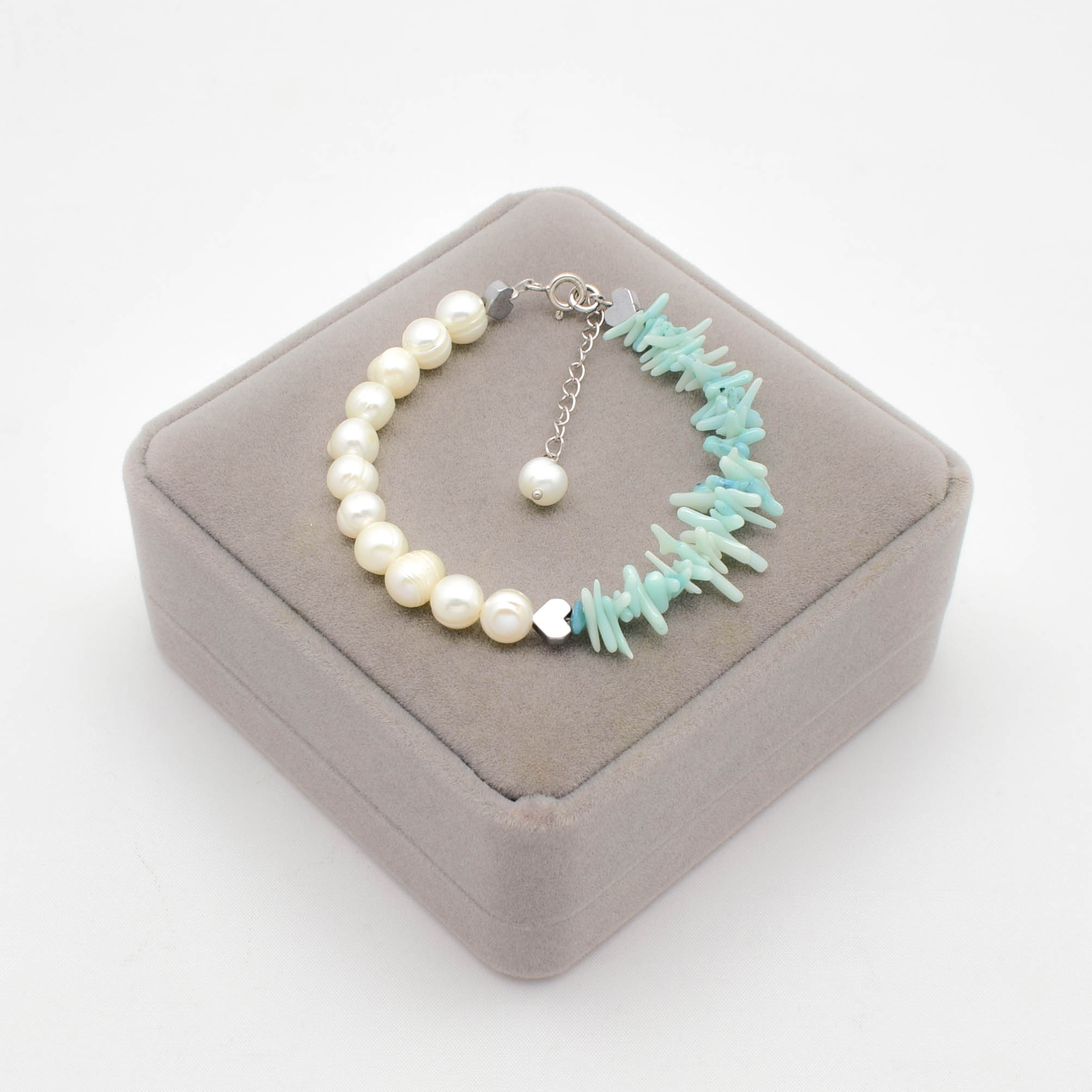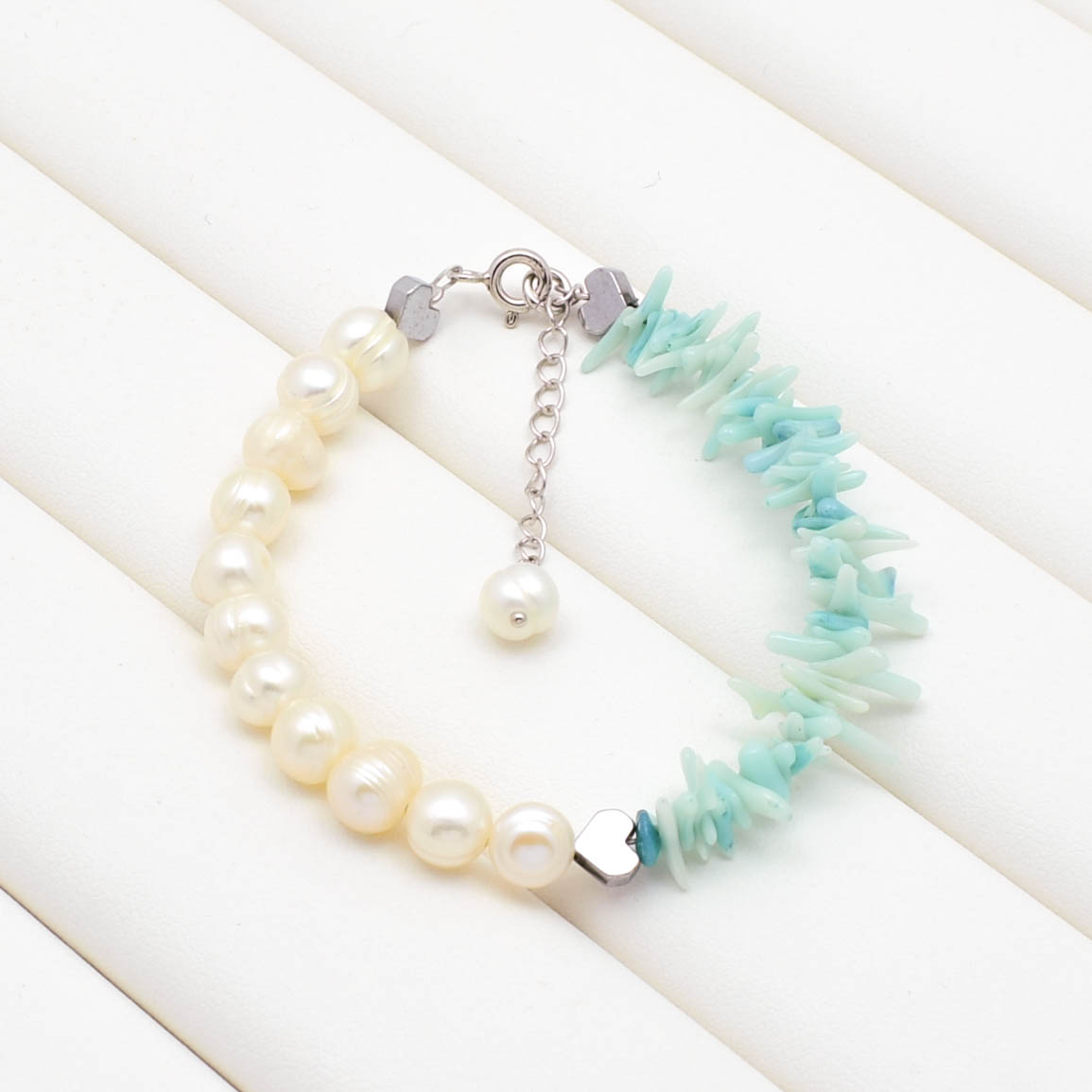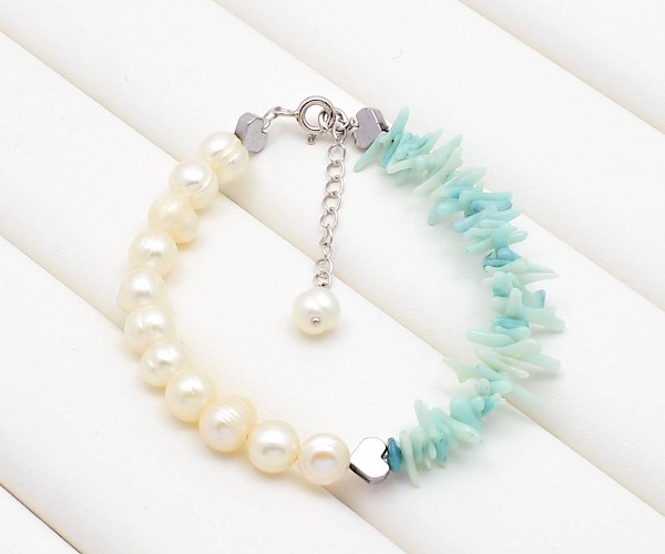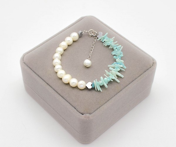 Bratara din argint 925, perle de cultura, coral turcoaz si hematit electroplacat.