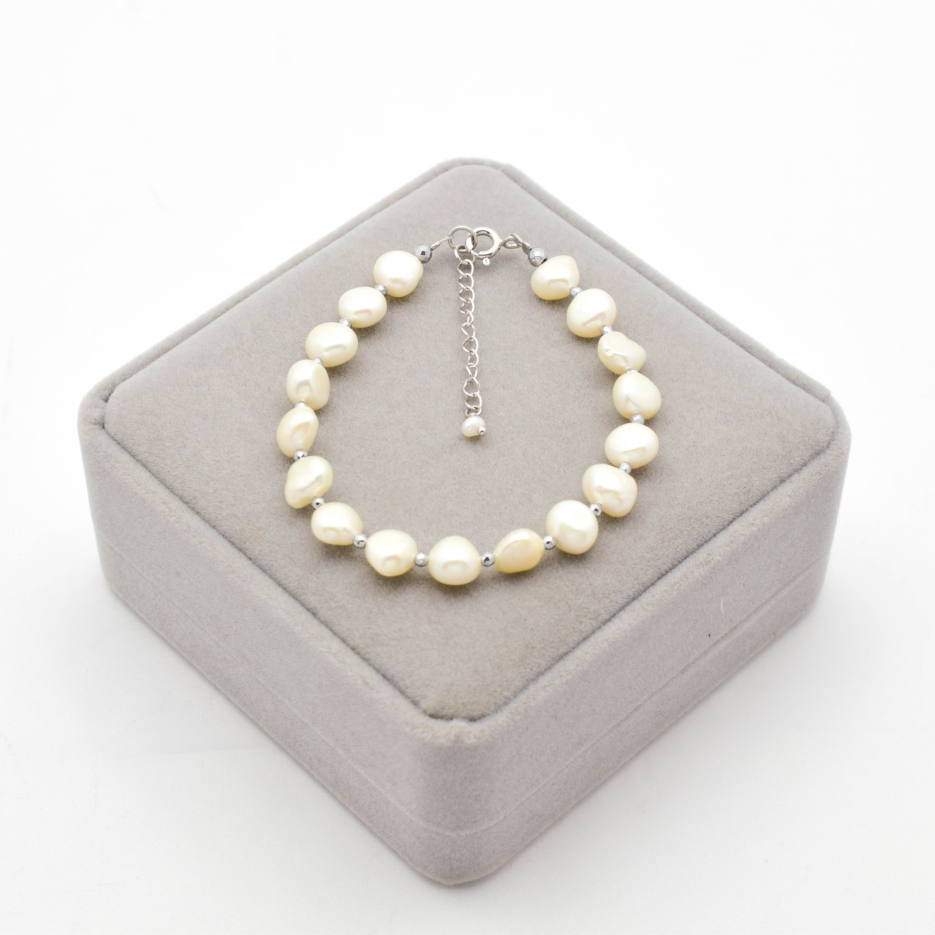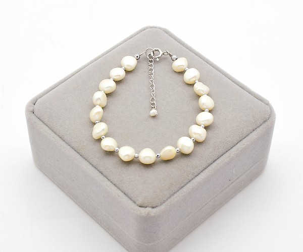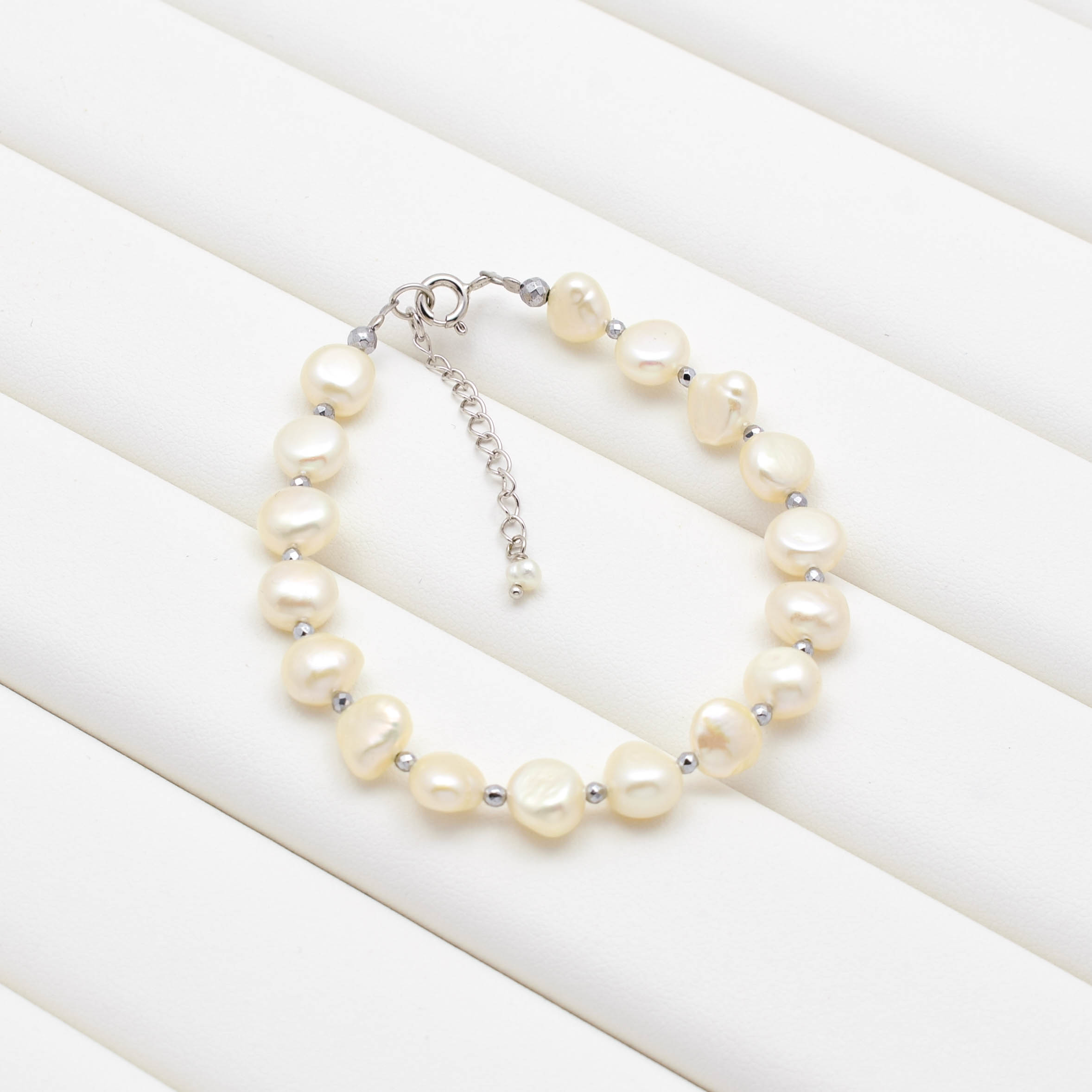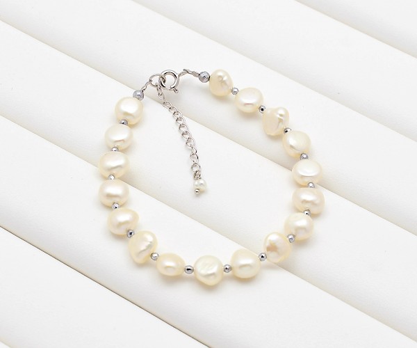 Bratara cu perle de cultura albe, hematit electroplacat si argint 925.