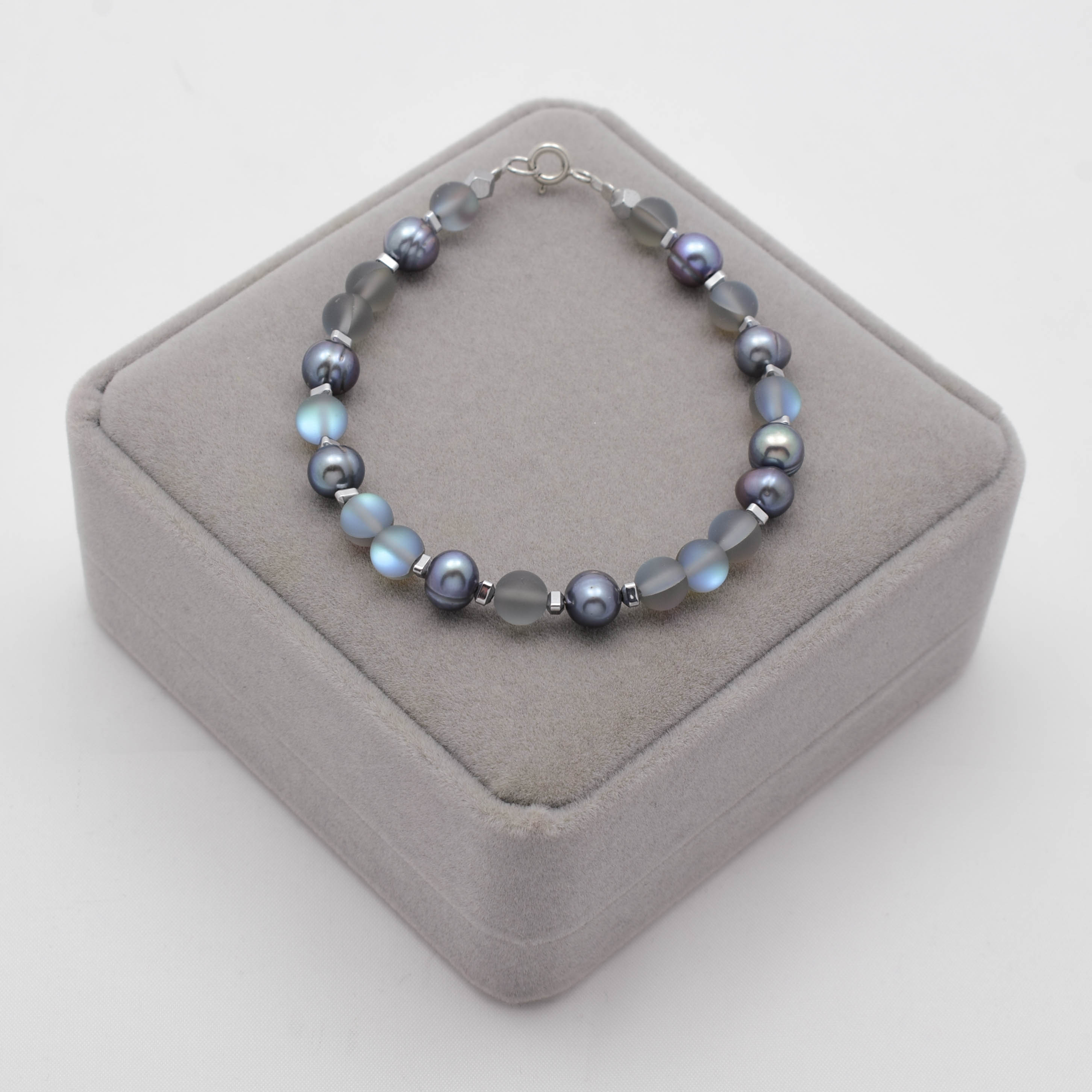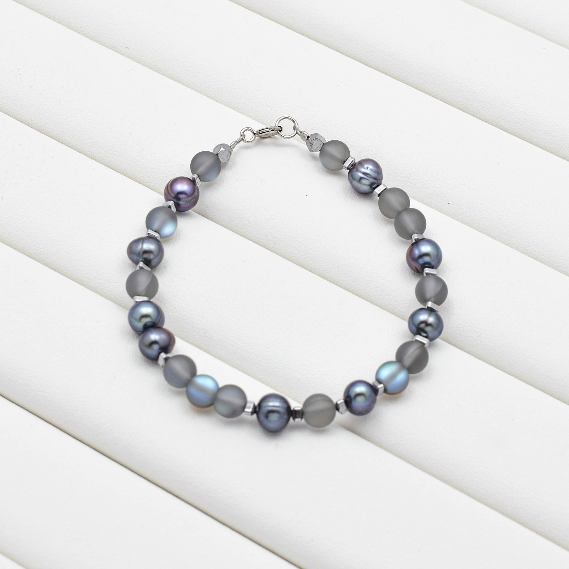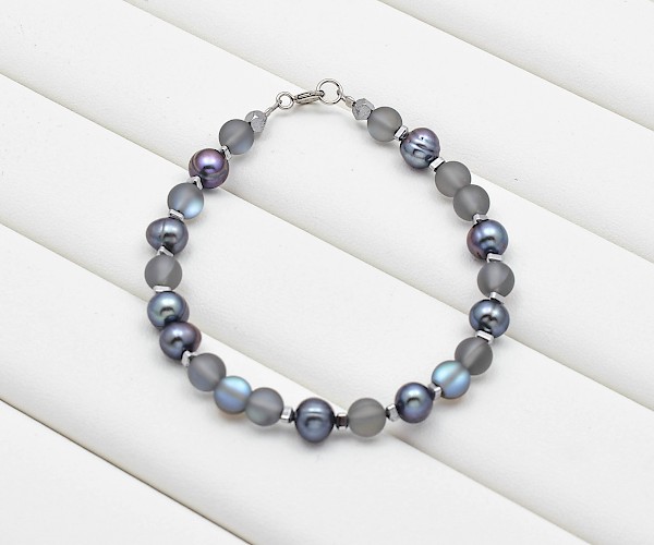 Bratara cu perle de cultura gri, sticla, hematit electroplacat si argint 925.