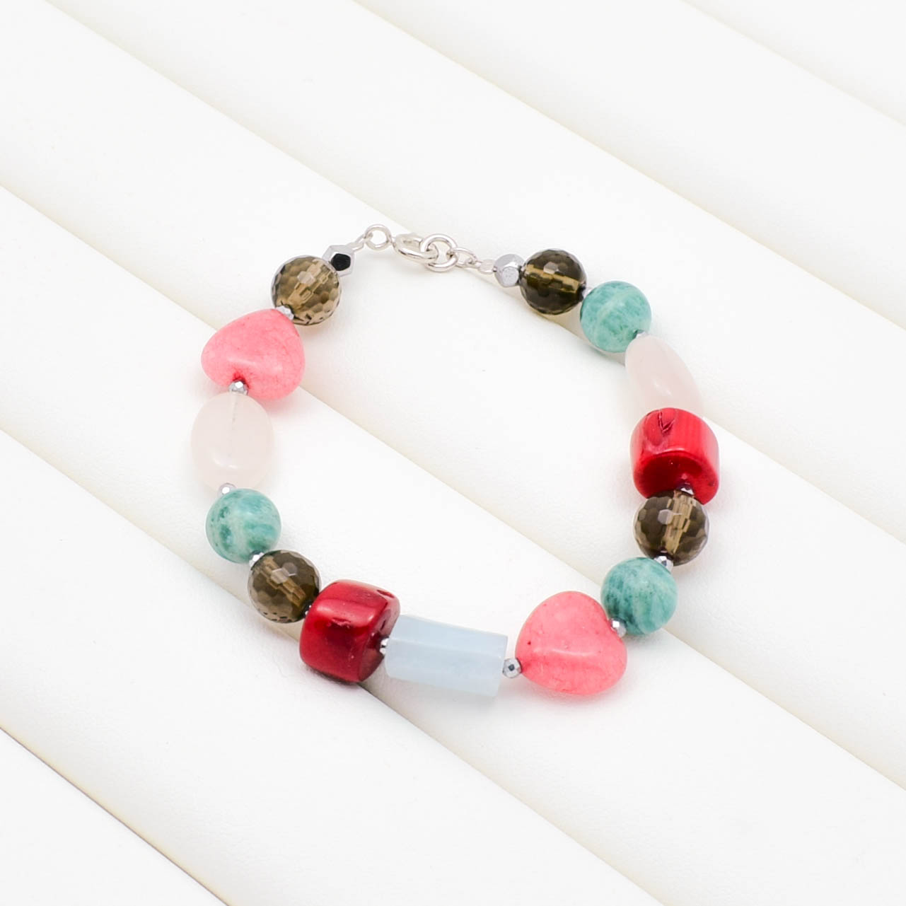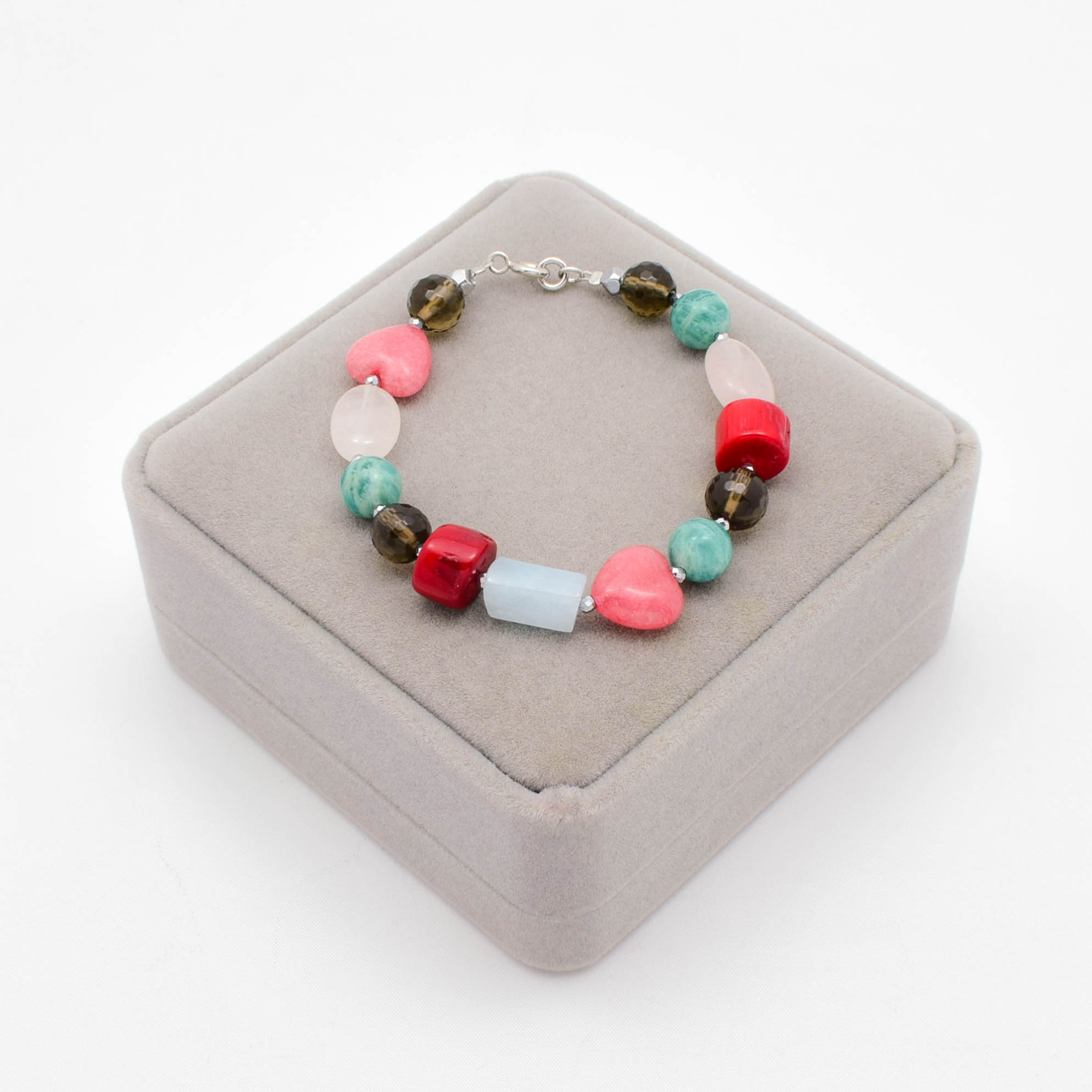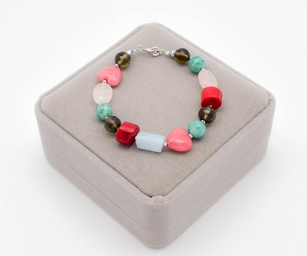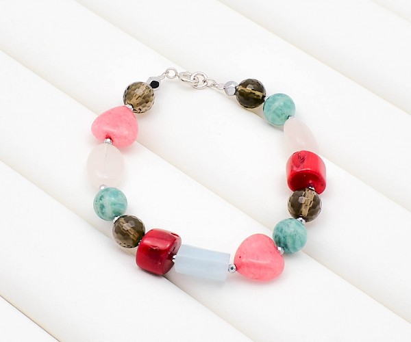 Bratara din amazonit, coral, cuart fumuriu, cuart roz, jad roz, acvamarin, hematit electroplacat si argint 925. Fiecare piatra semipretioasa (perla de cultura), este unica si exista posibilitatea sa apara mici diferente fata de modelul prototip din imagine.