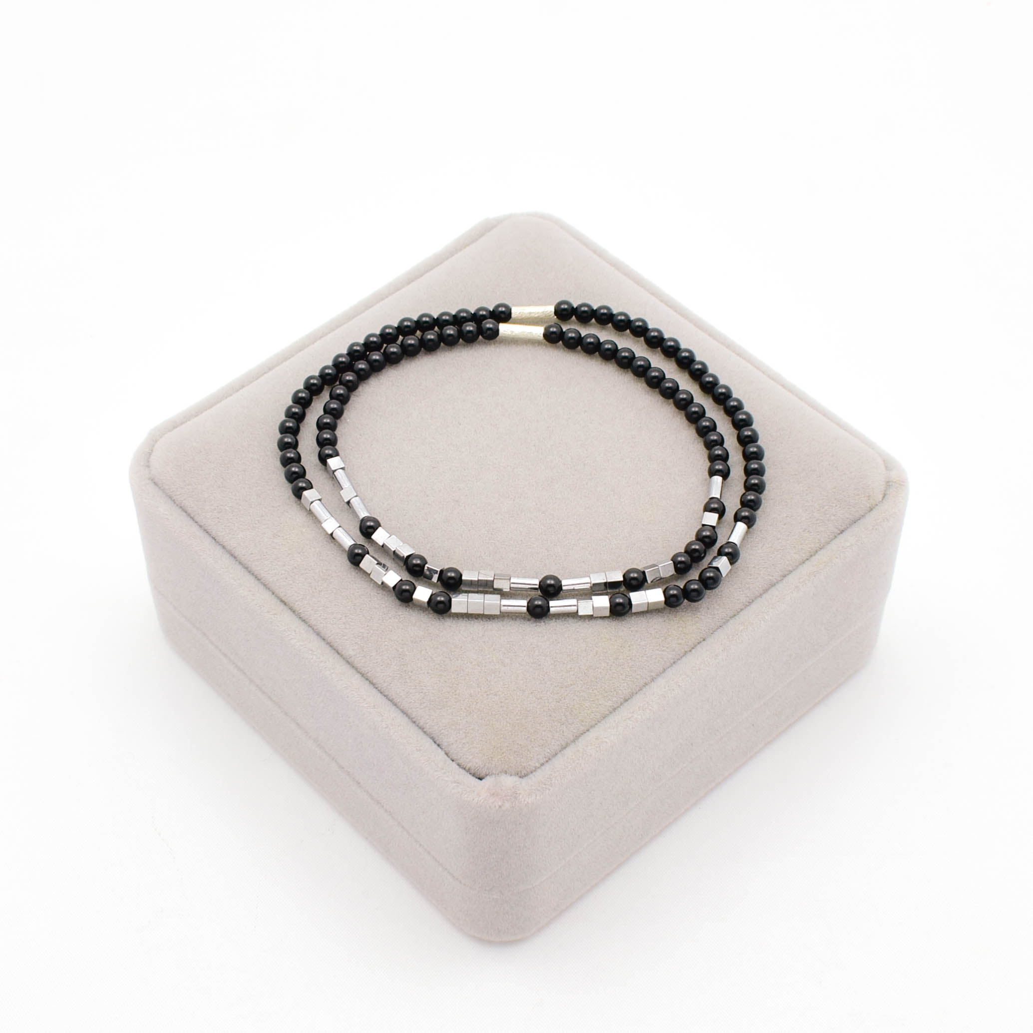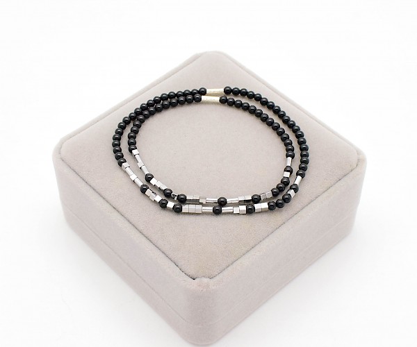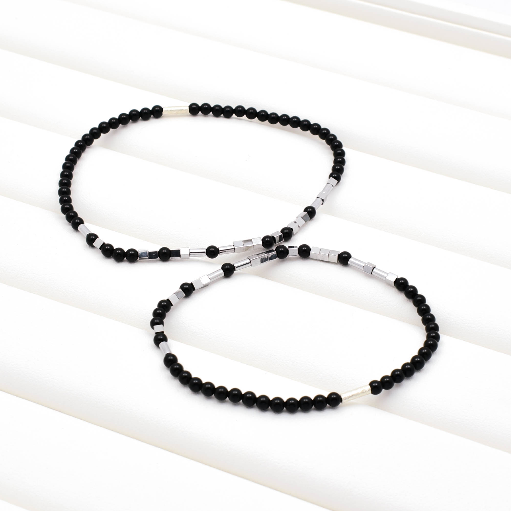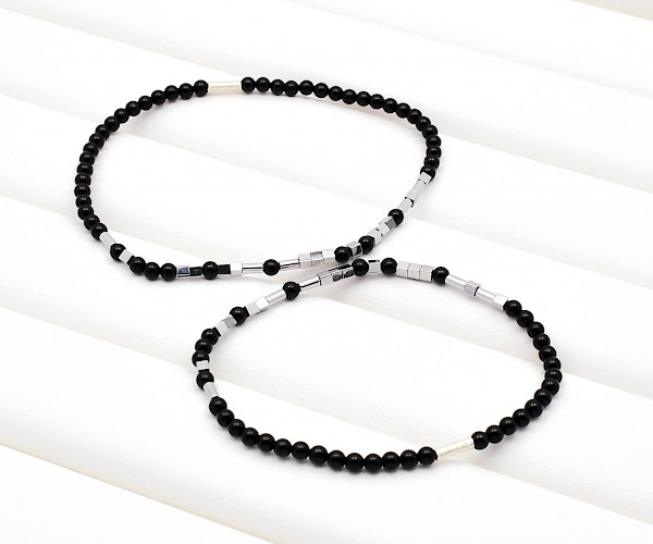 Set doua bratari pentru cuplu, pe guta elastica, din onix (3 mm), hematit electroplacat si argint 925.
