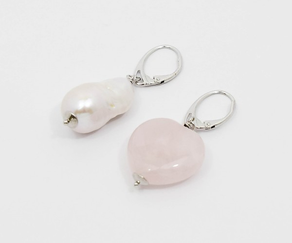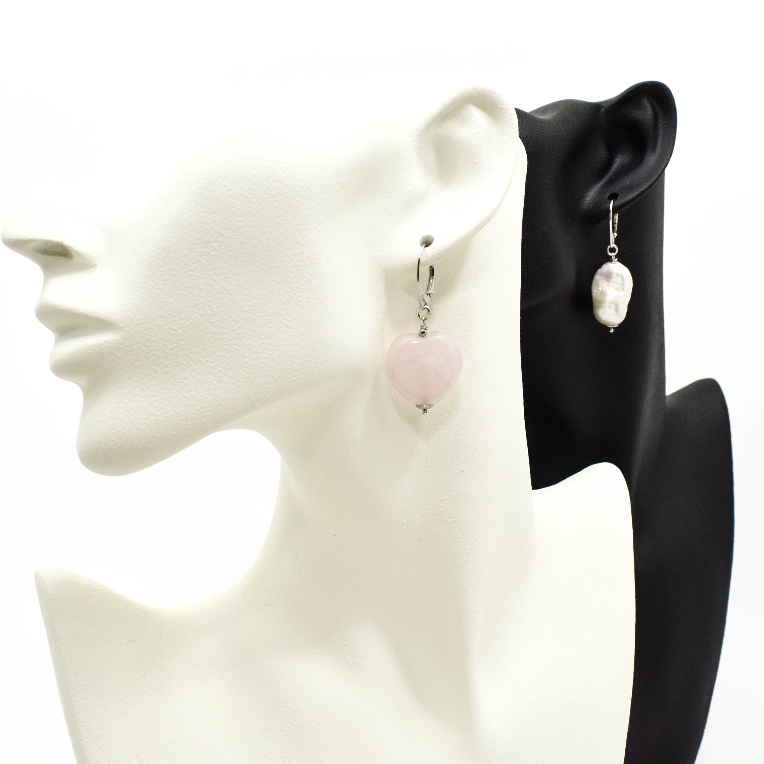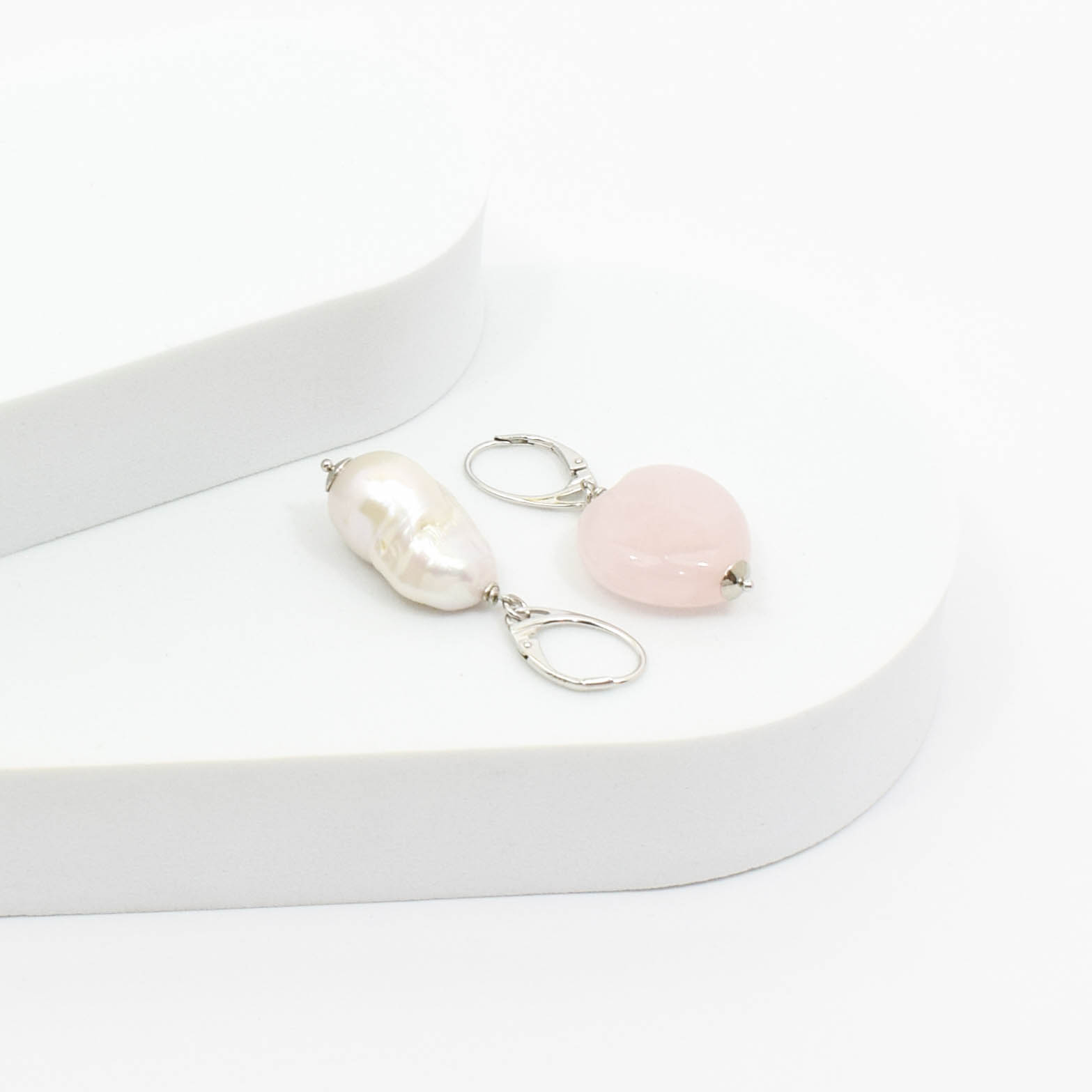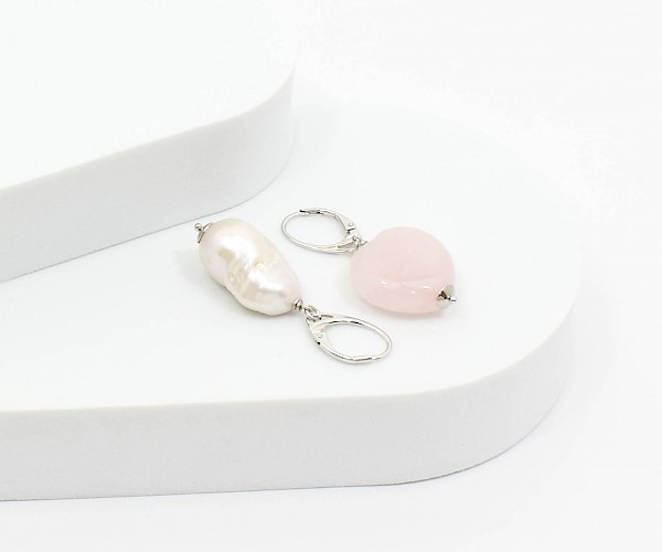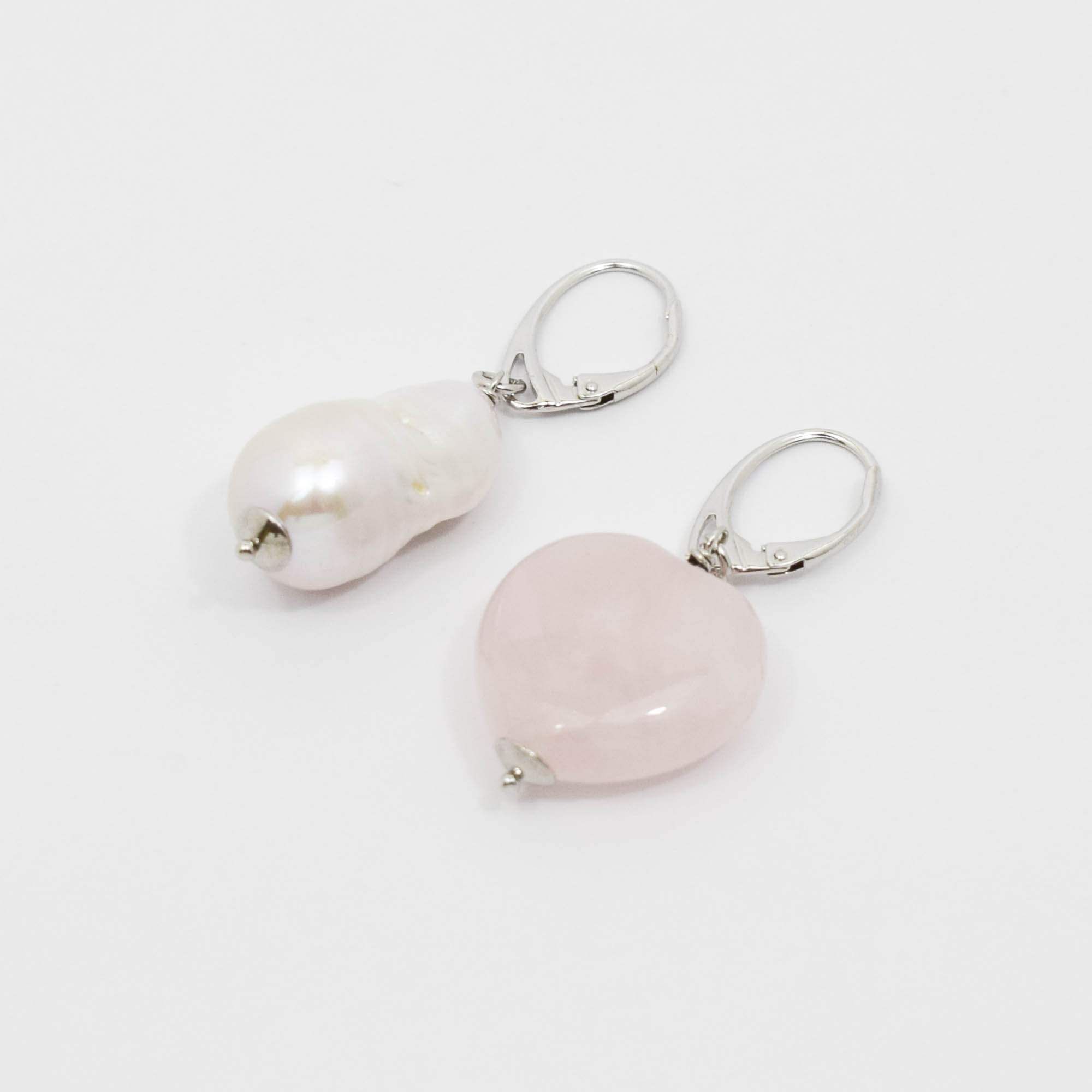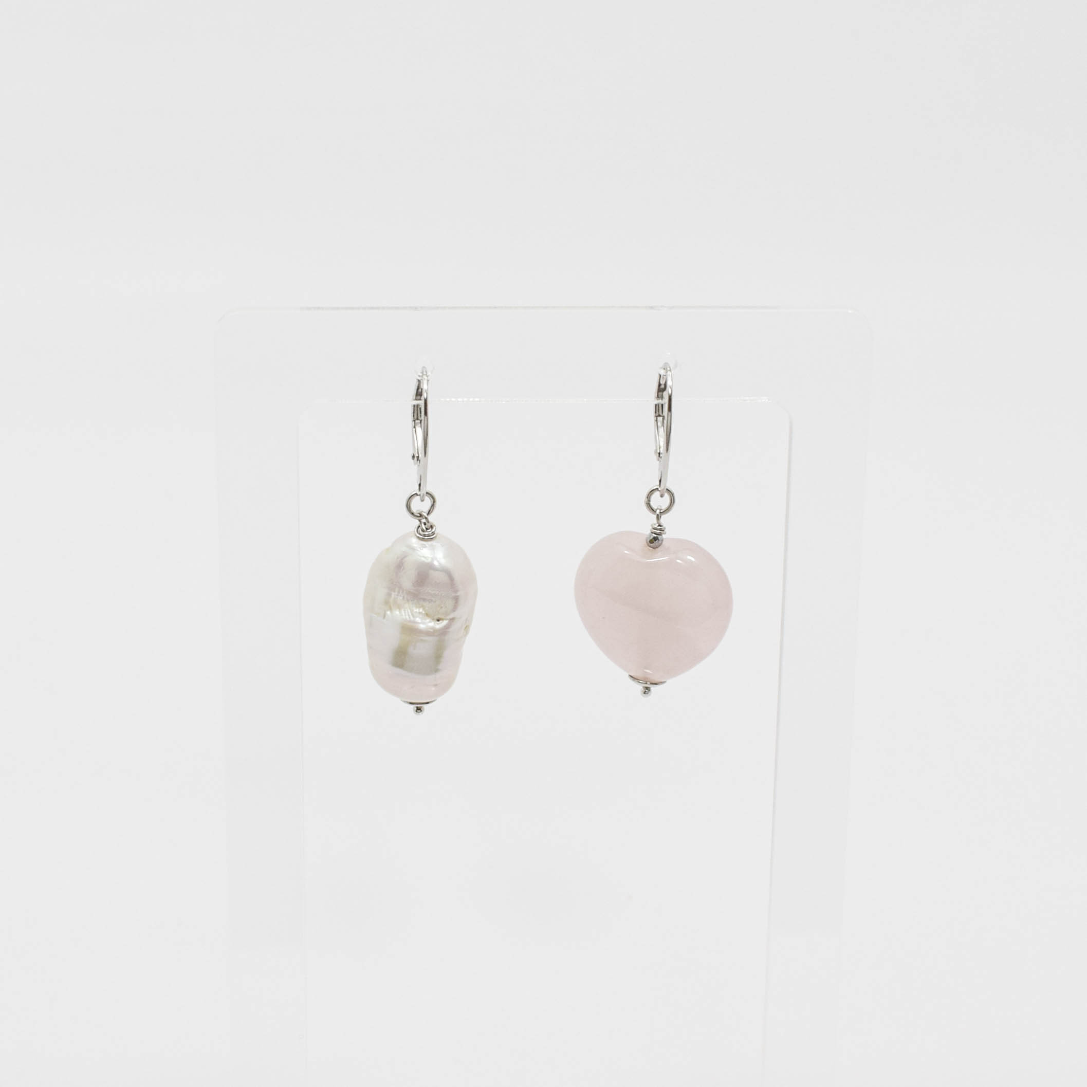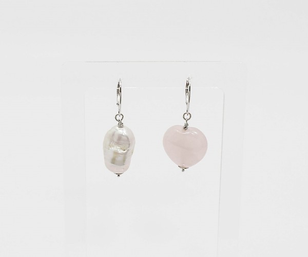 Cercei asimetrici cu perla baroque, inima din cuart roz si argint 925.