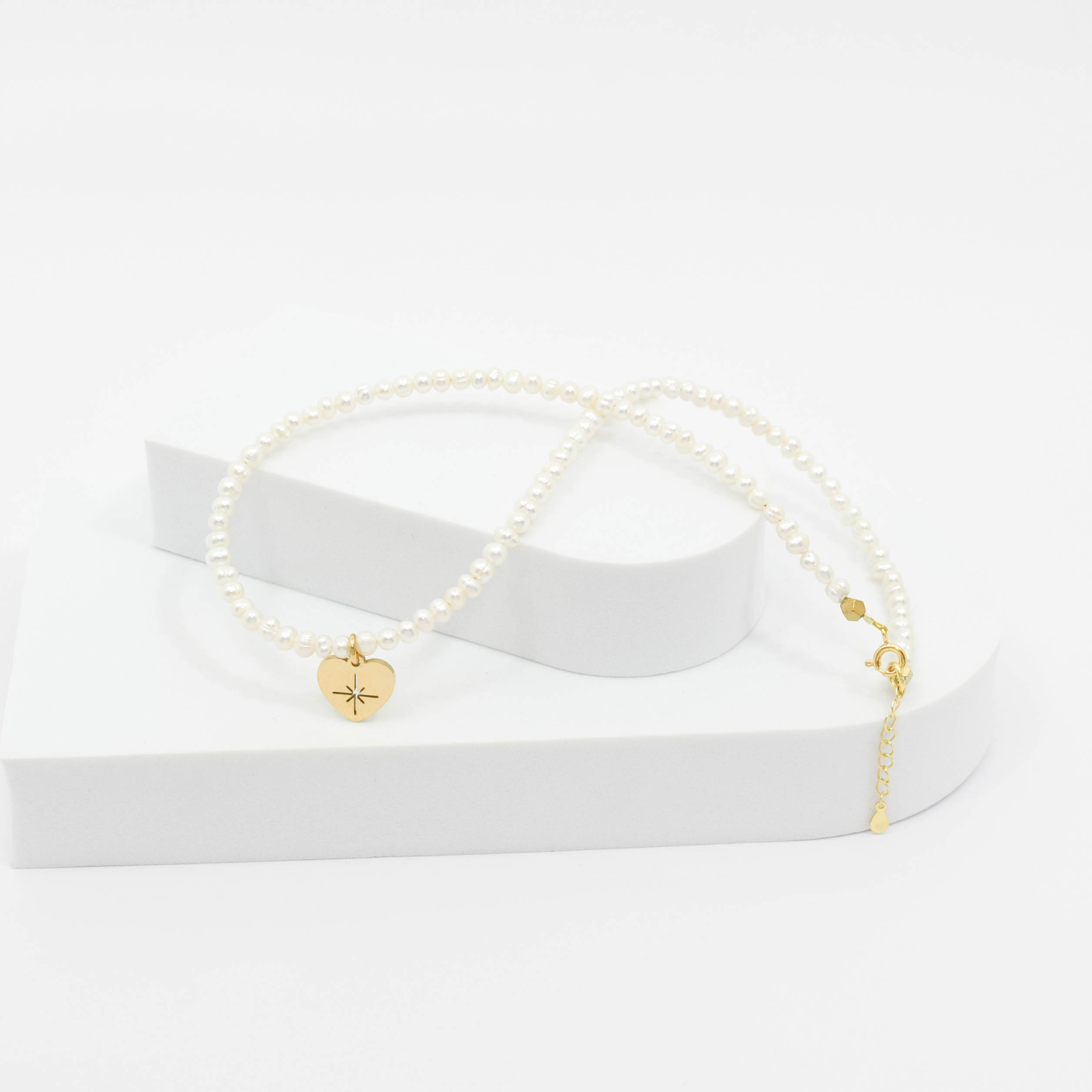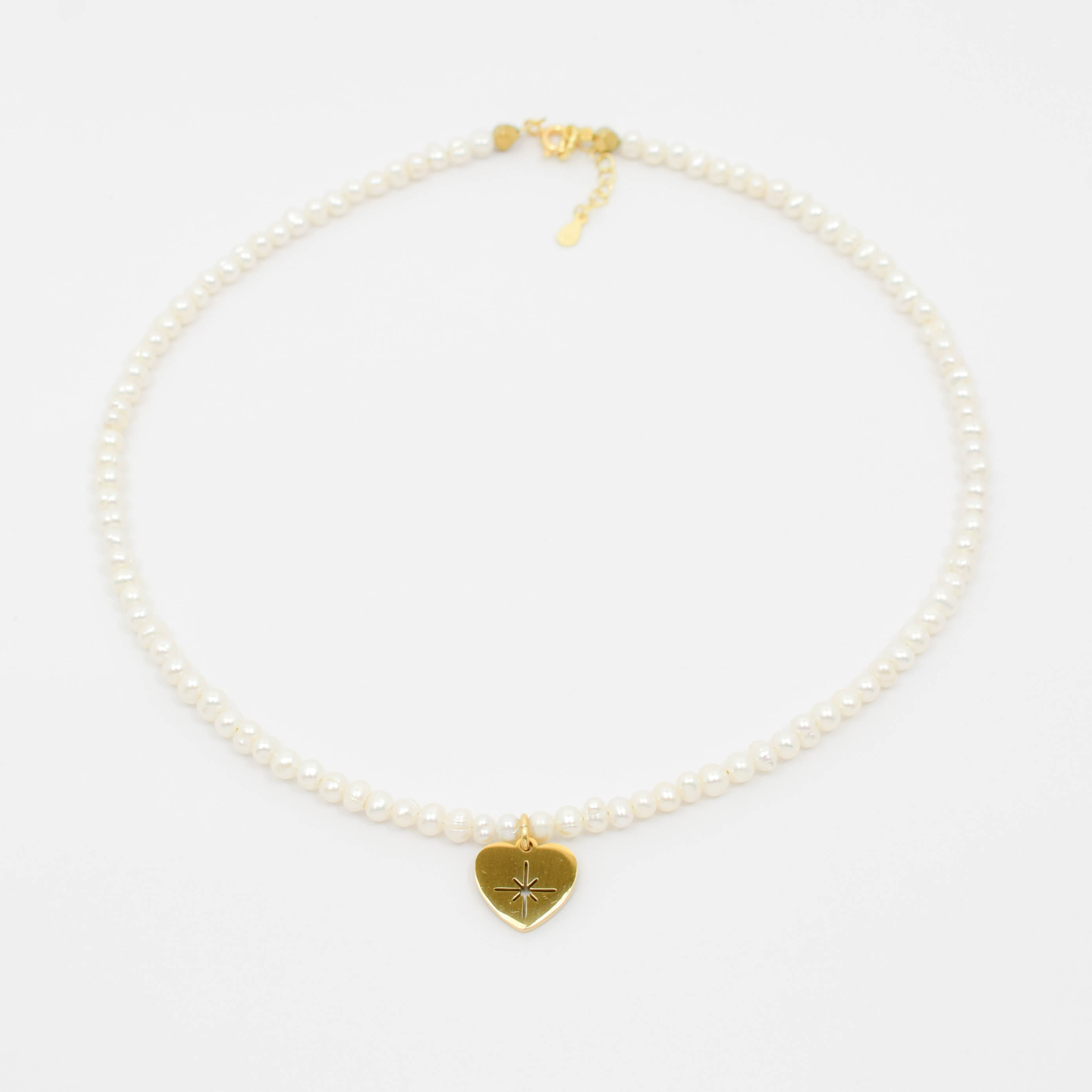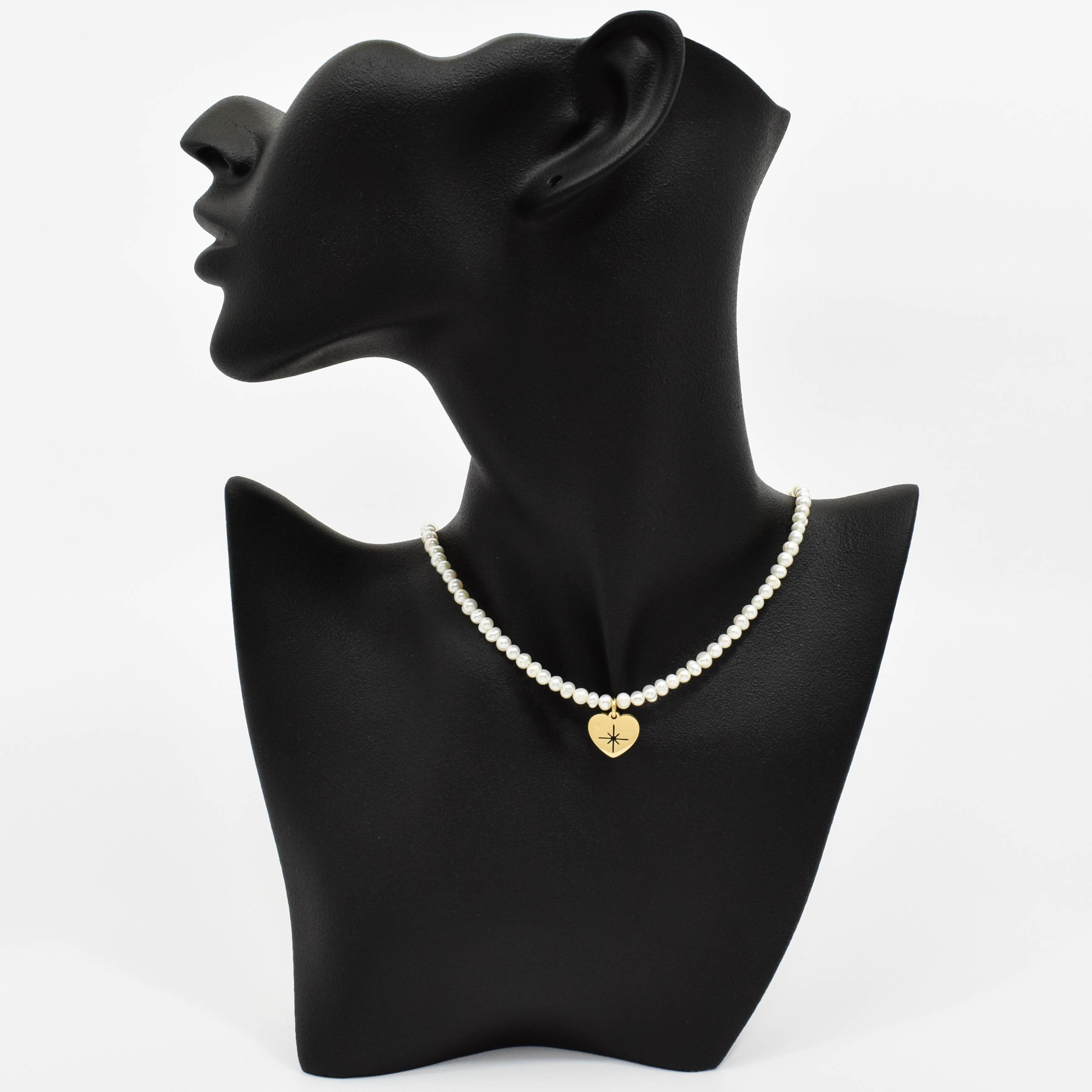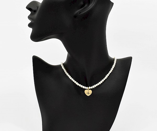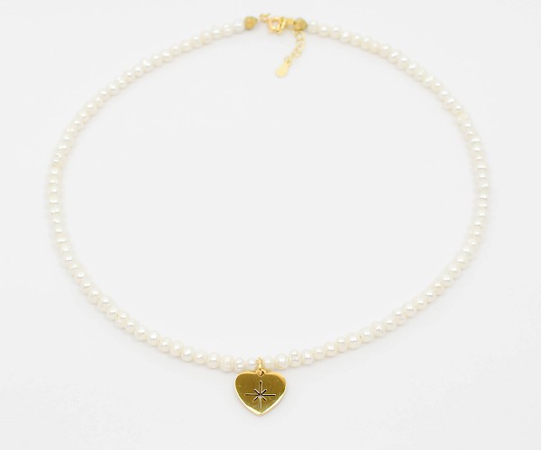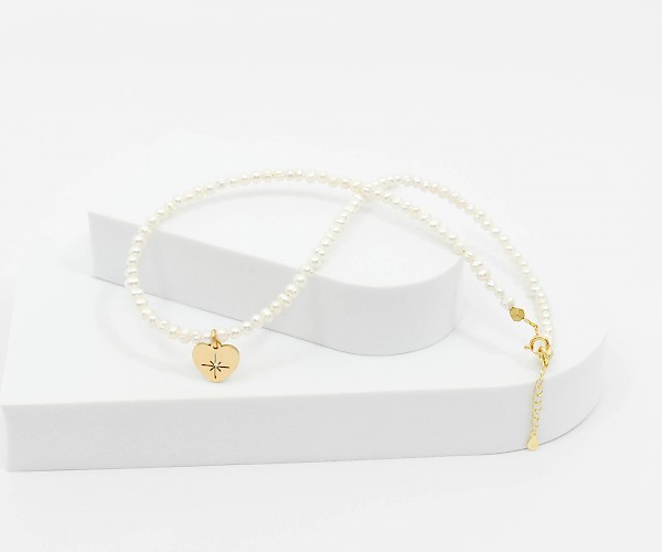 Colier din perle de cultura albe mici, pandantiv inima din inox, hematit electroplacat si argint 925 aurit.