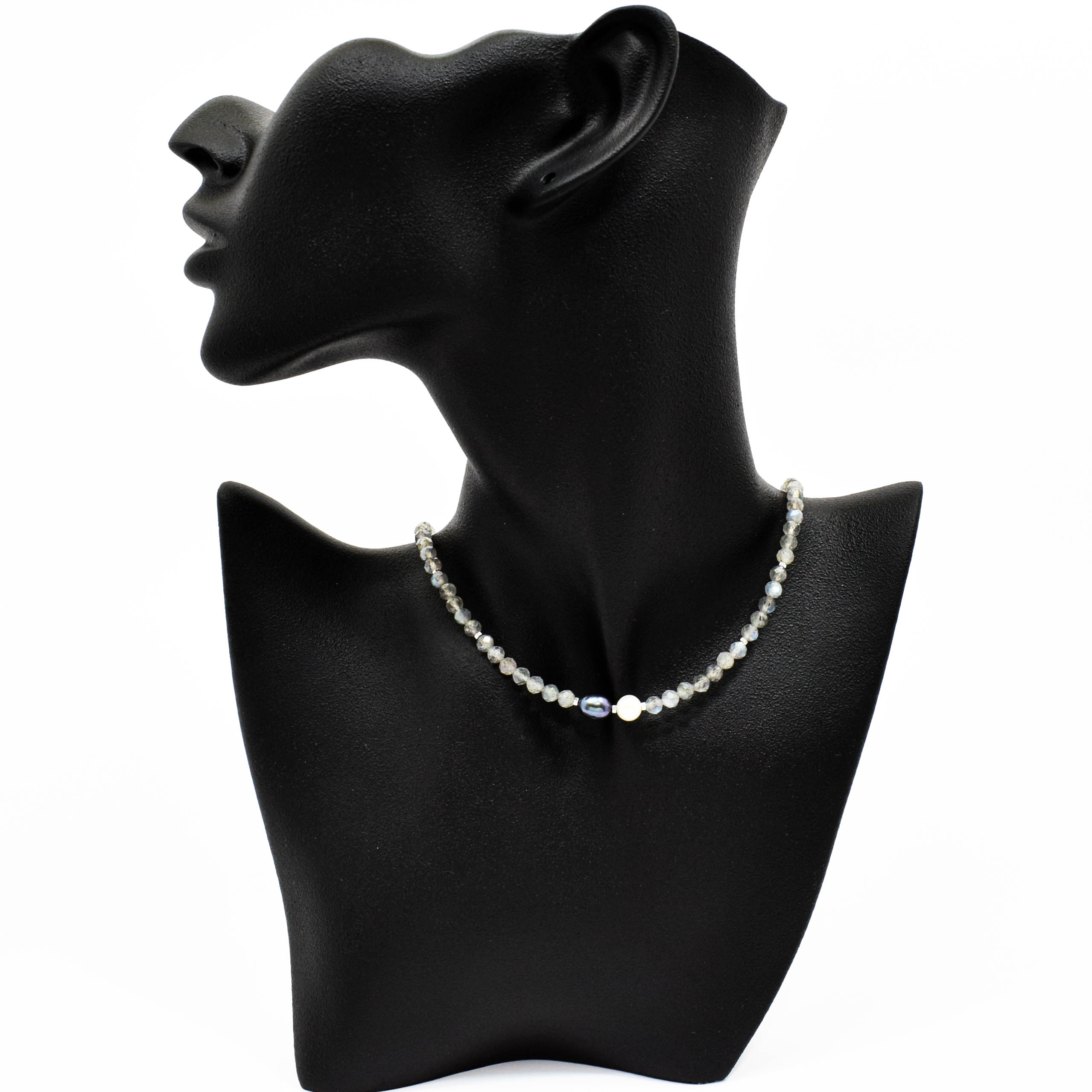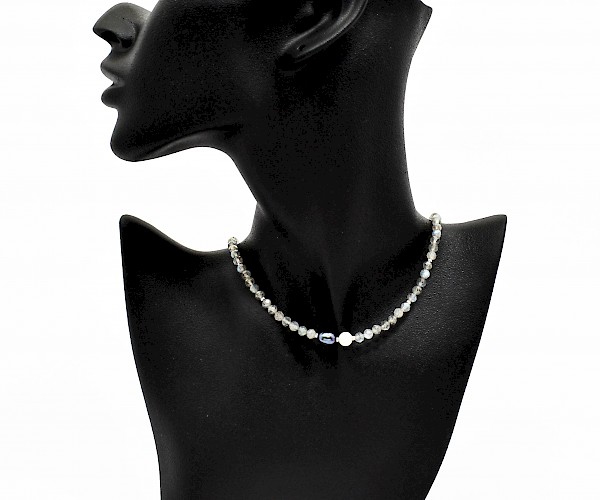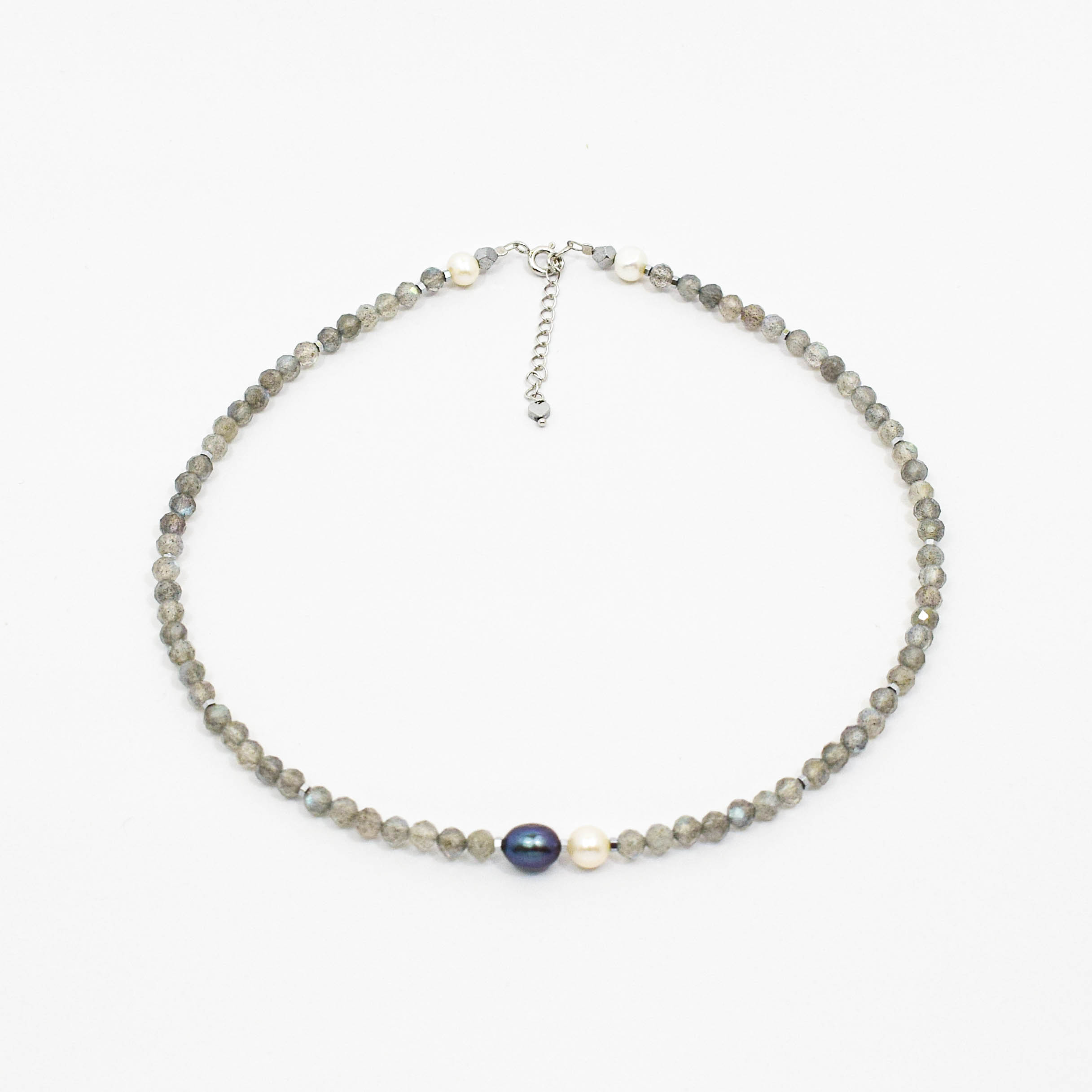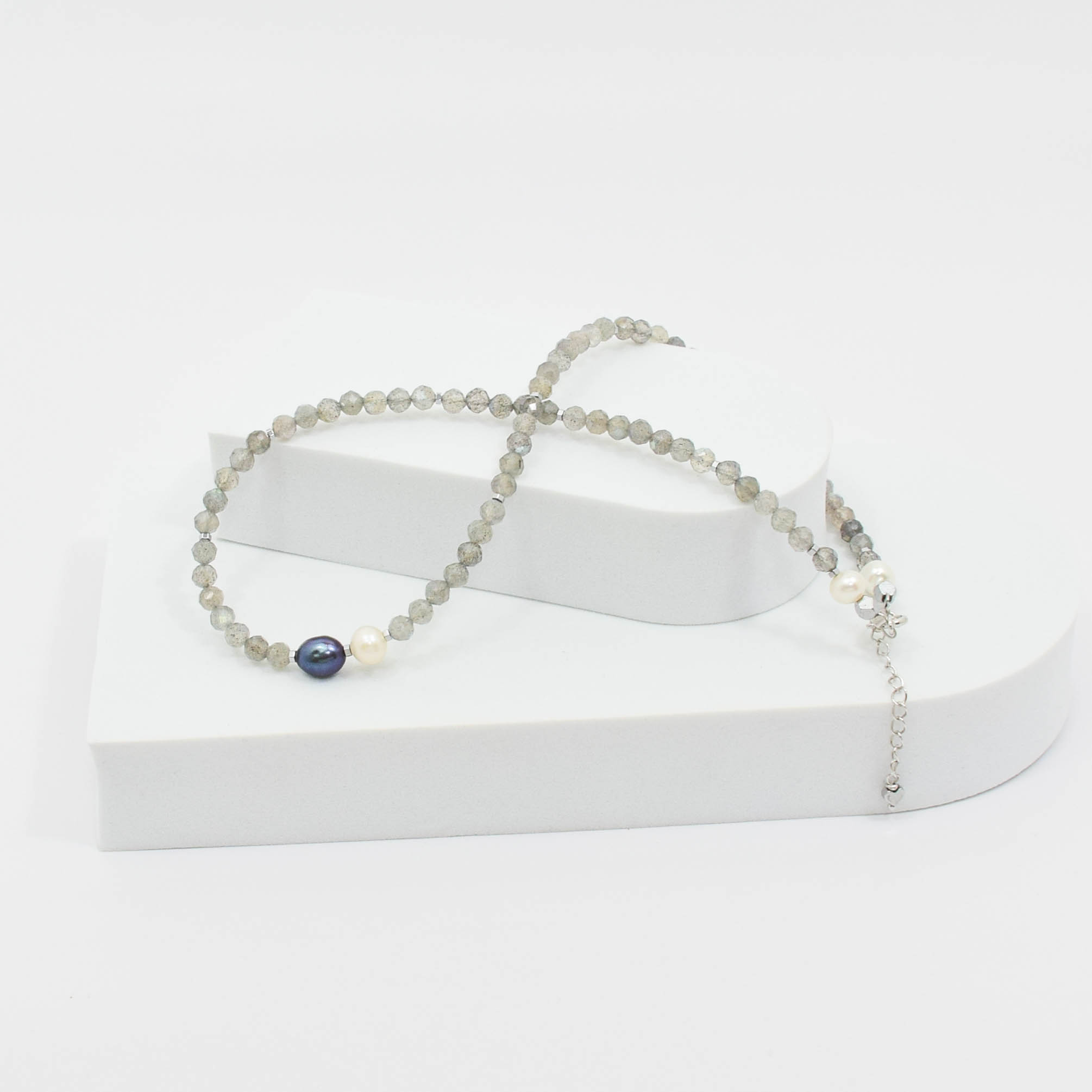 Colier din labradorit fatetat, perle de cultura, hematit electroplacat si argint 925. Fiecare piatra semipretioasa (perla de cultura), este unica si exista posibilitatea sa apara mici diferente fata de modelul prototip din imagine.