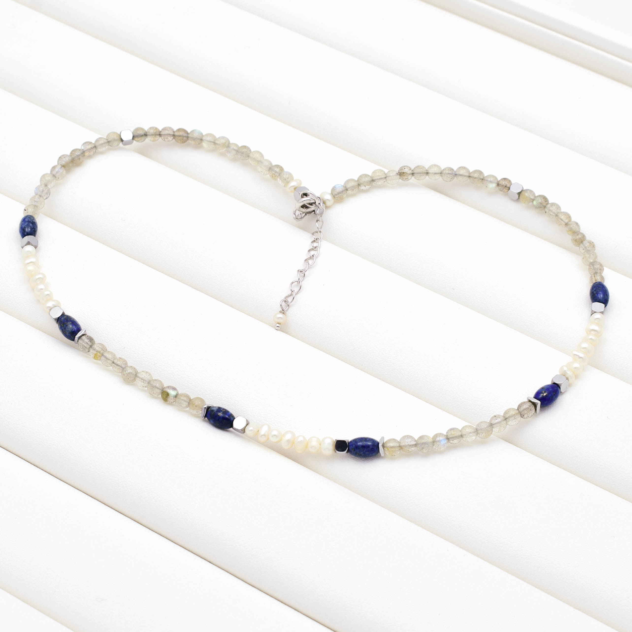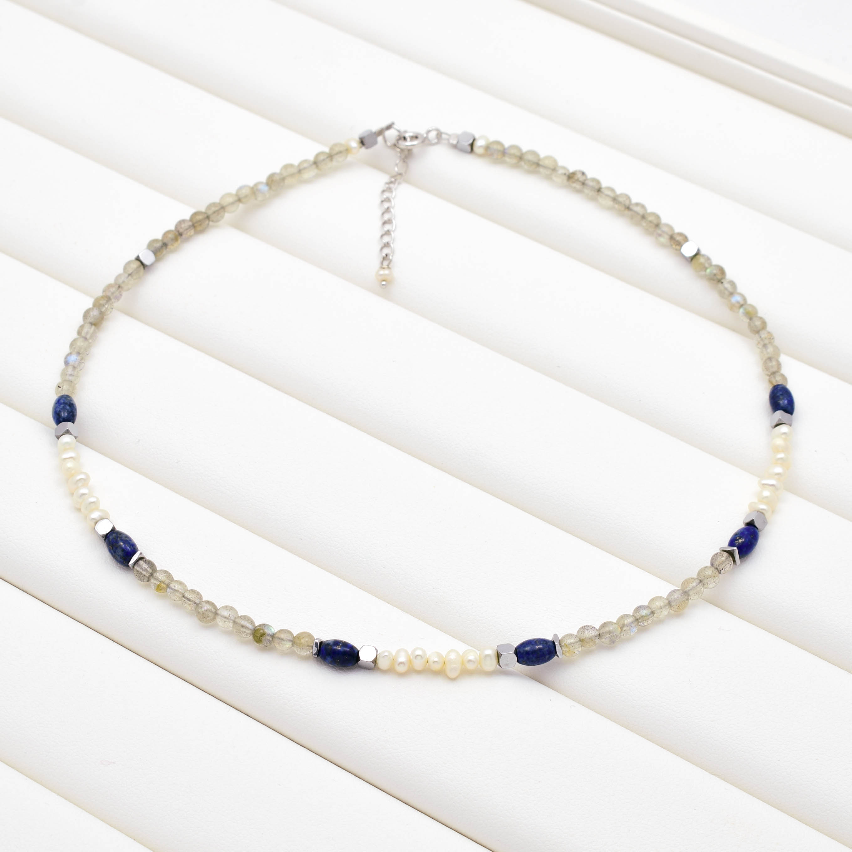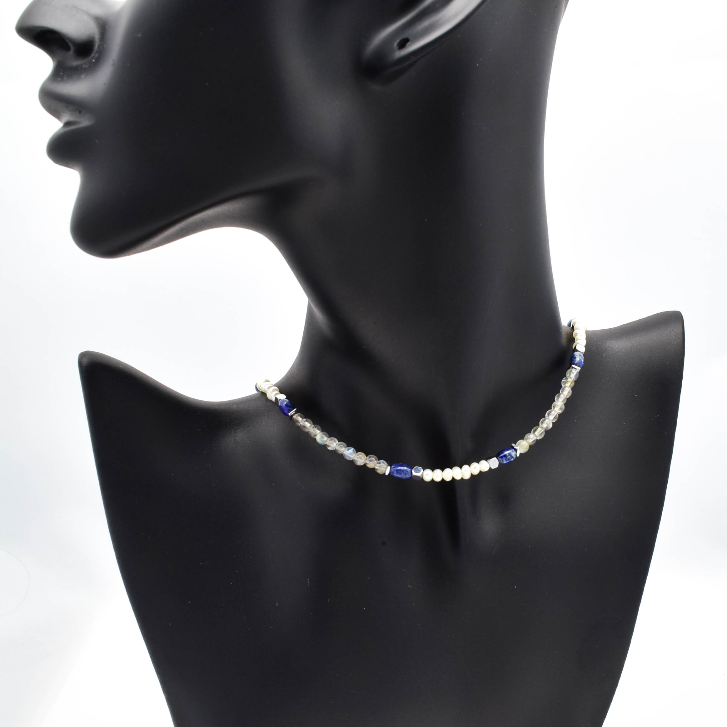 argint 925, labradorit, perle de cultura albe, lapis lazuli, hematit electroplacat