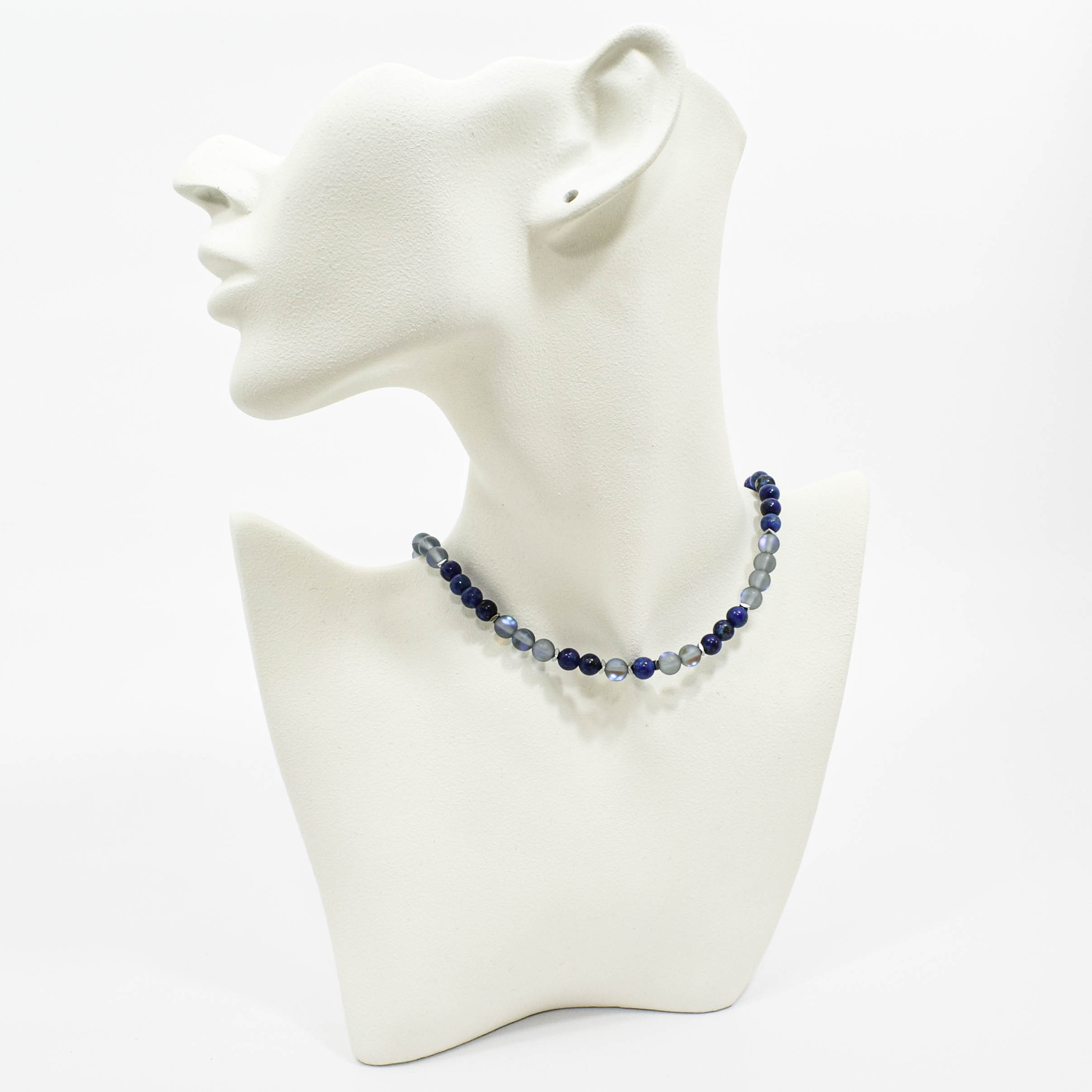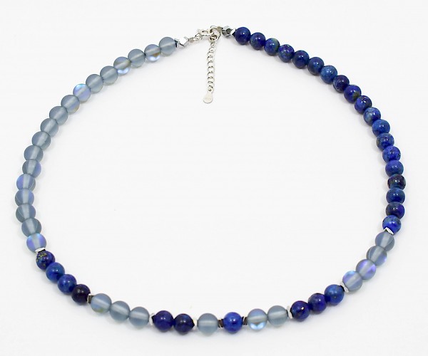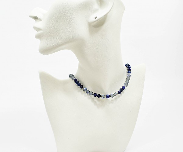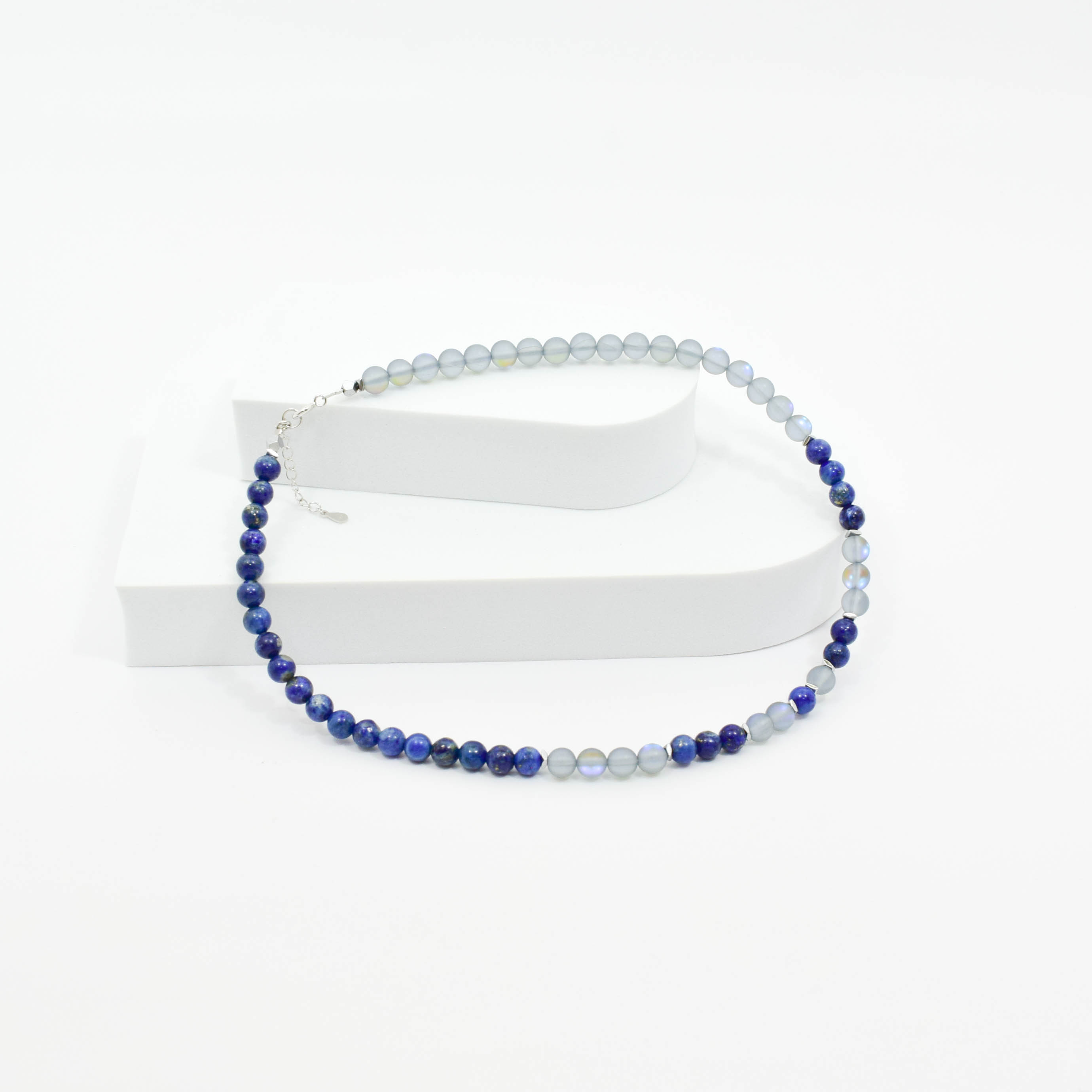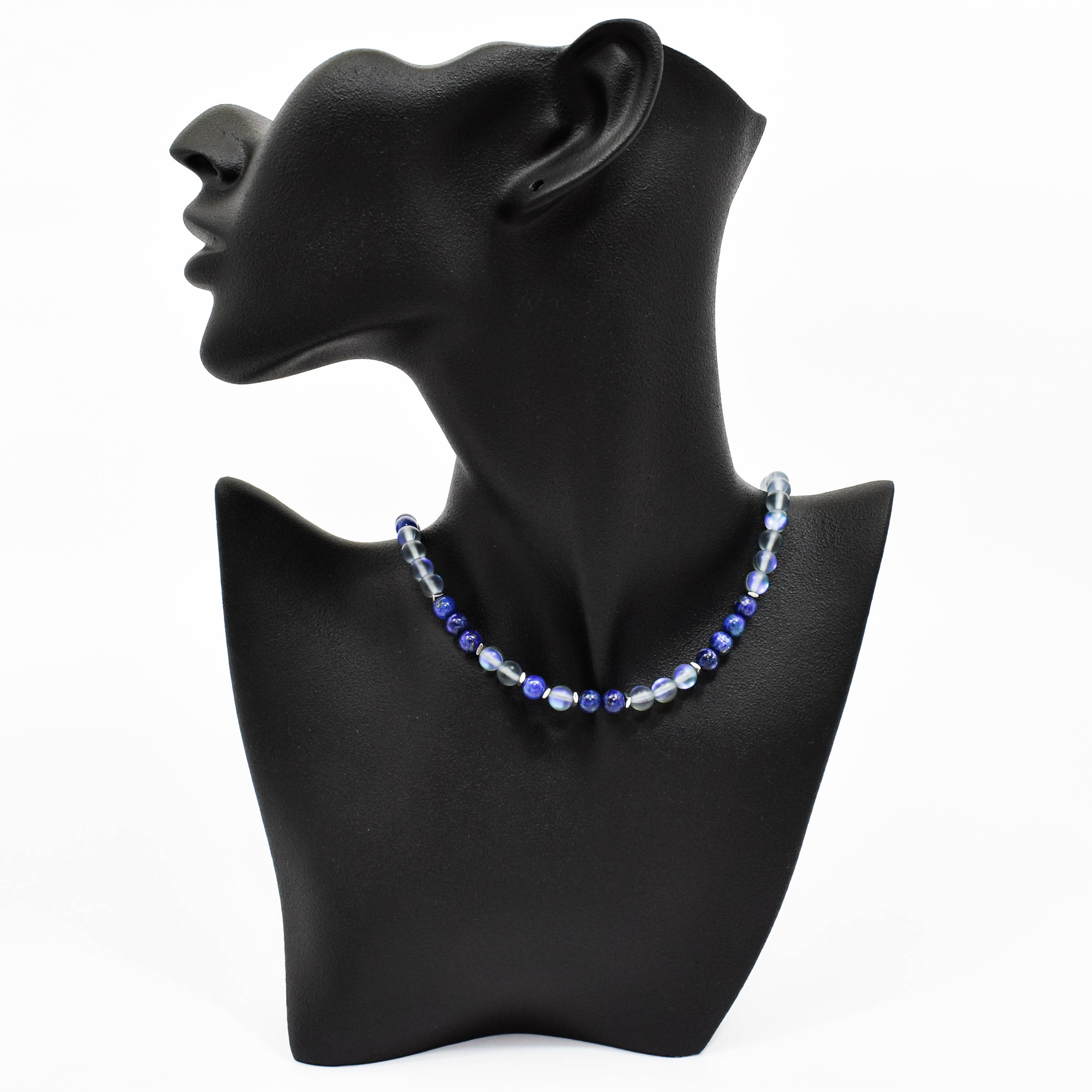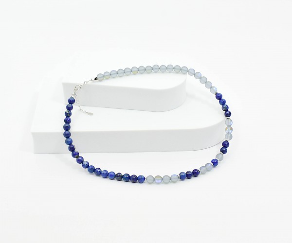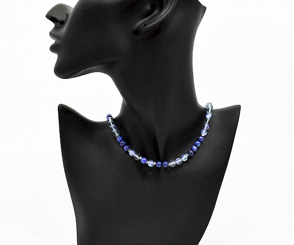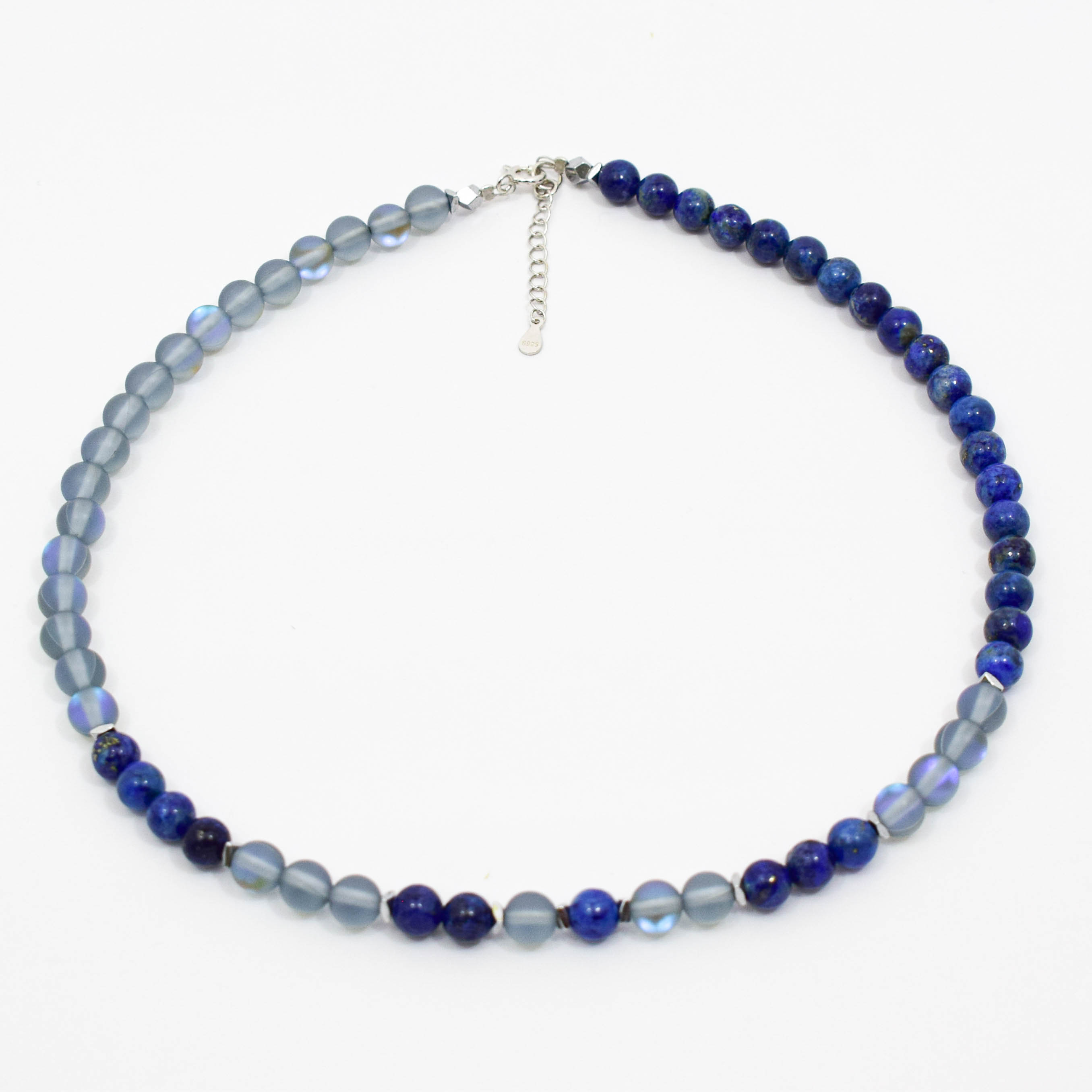 Colier cu lapis lazuli, sticla, hematit electroplacat si argint 925.
