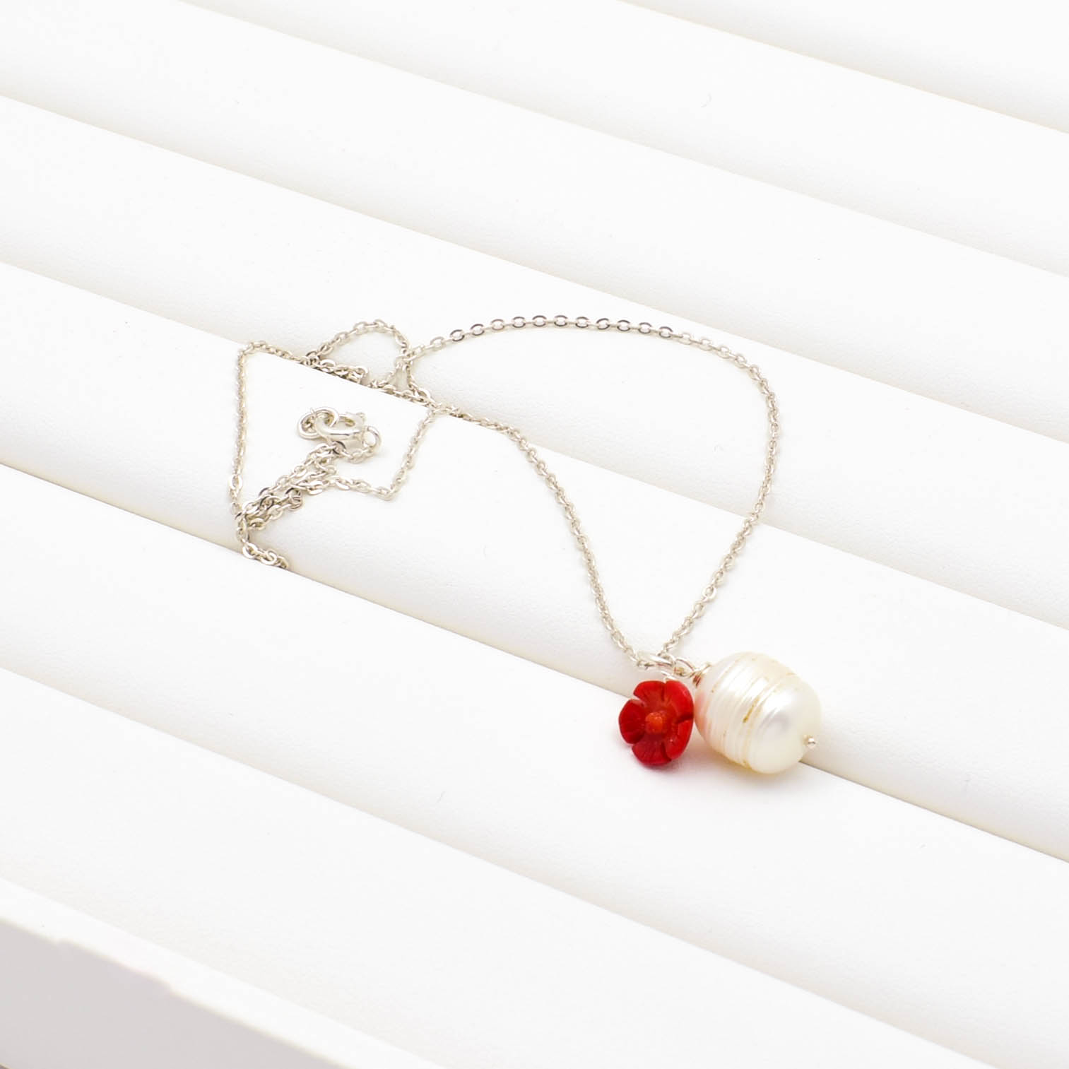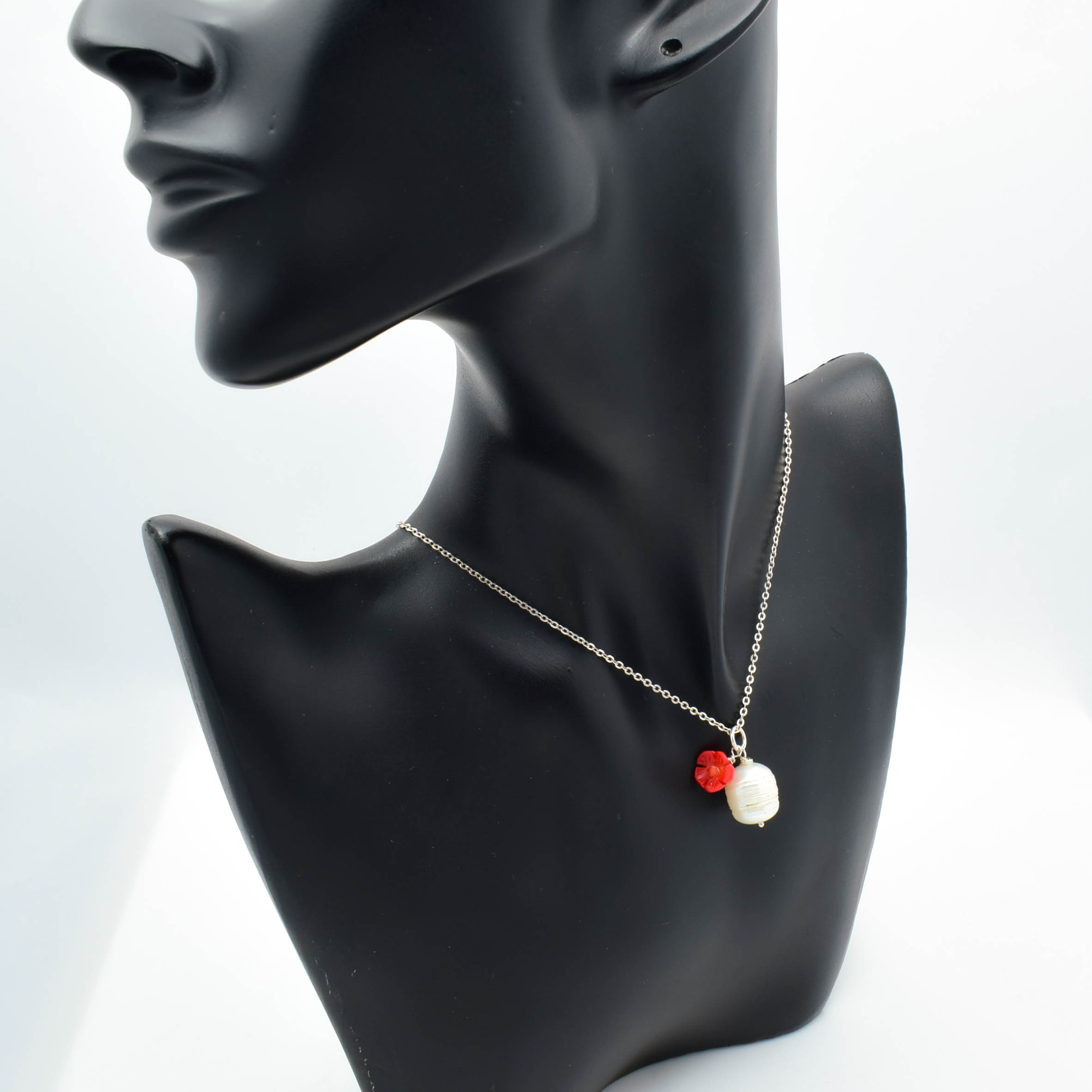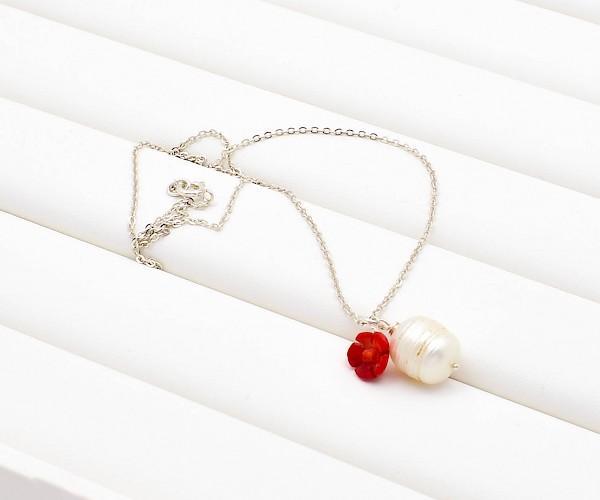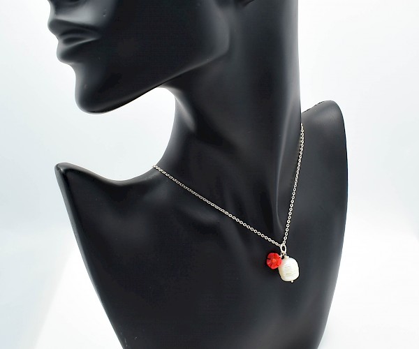 Colier din argint 925 cu pandantiv perla de cultura alba si trandafir din coral rosu.