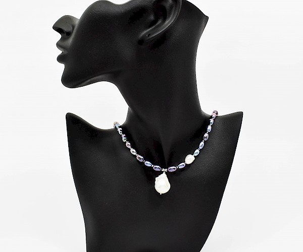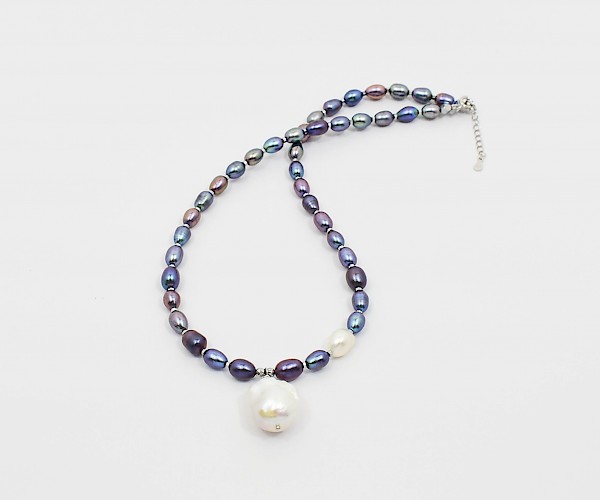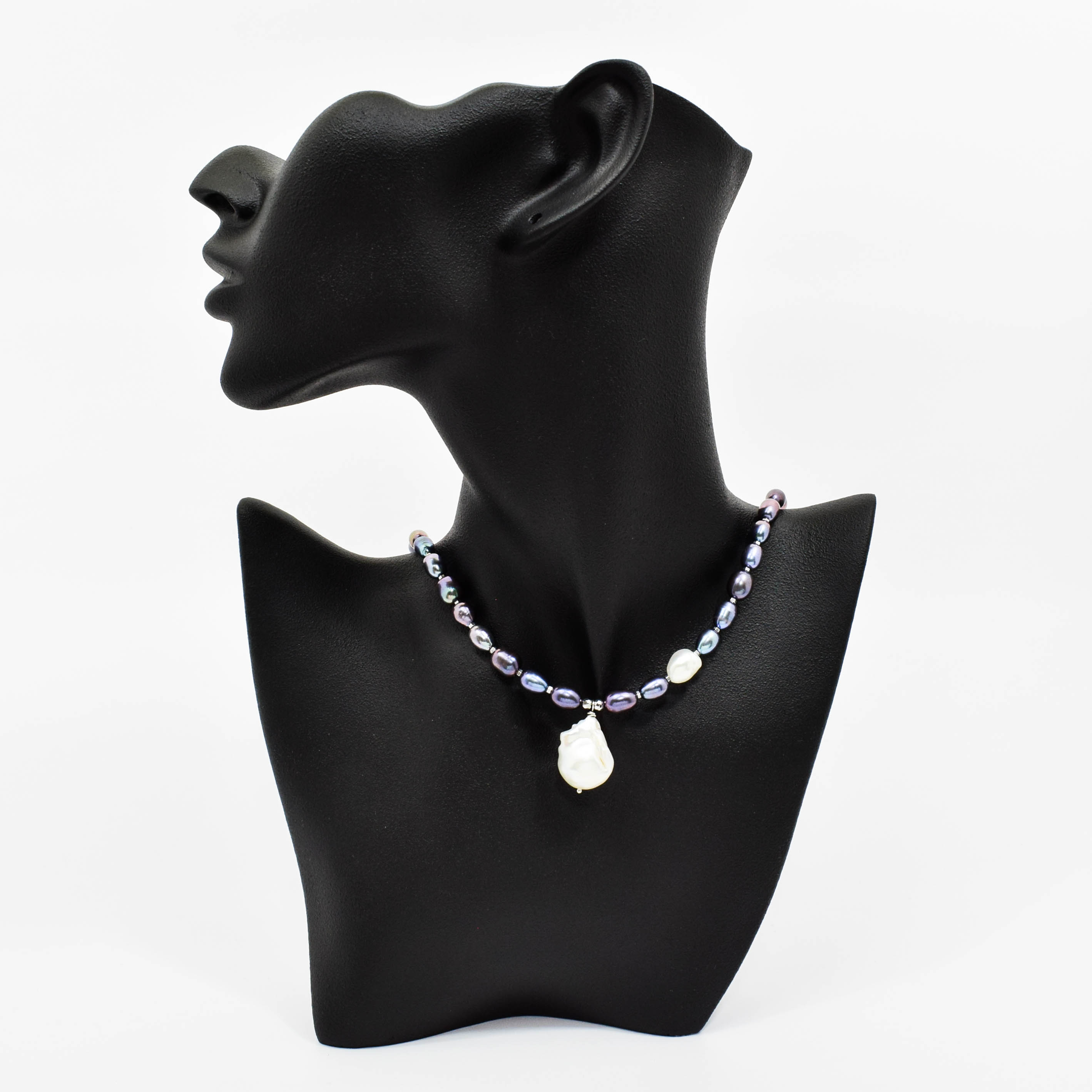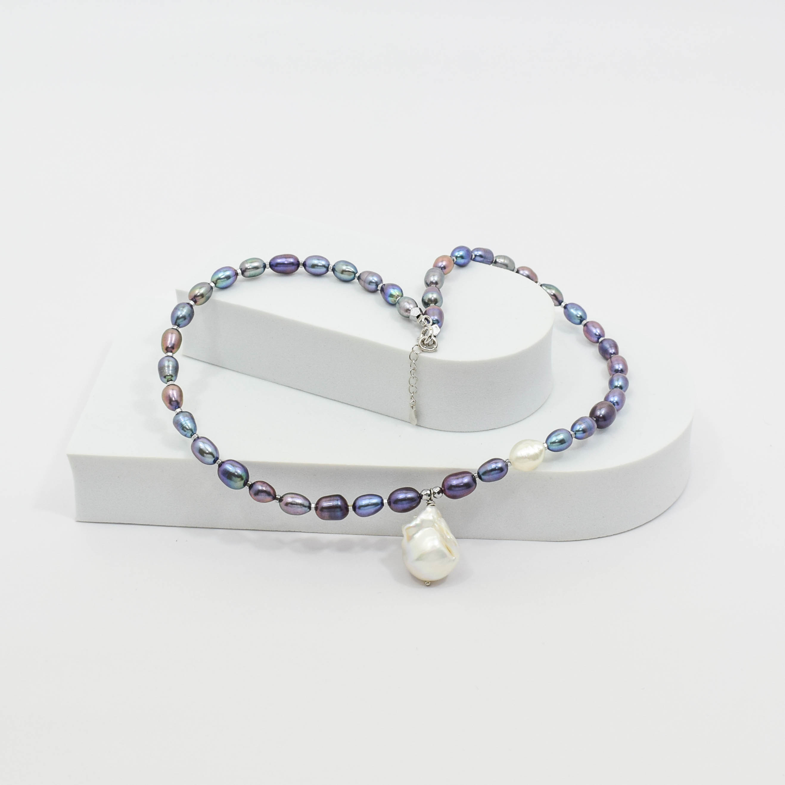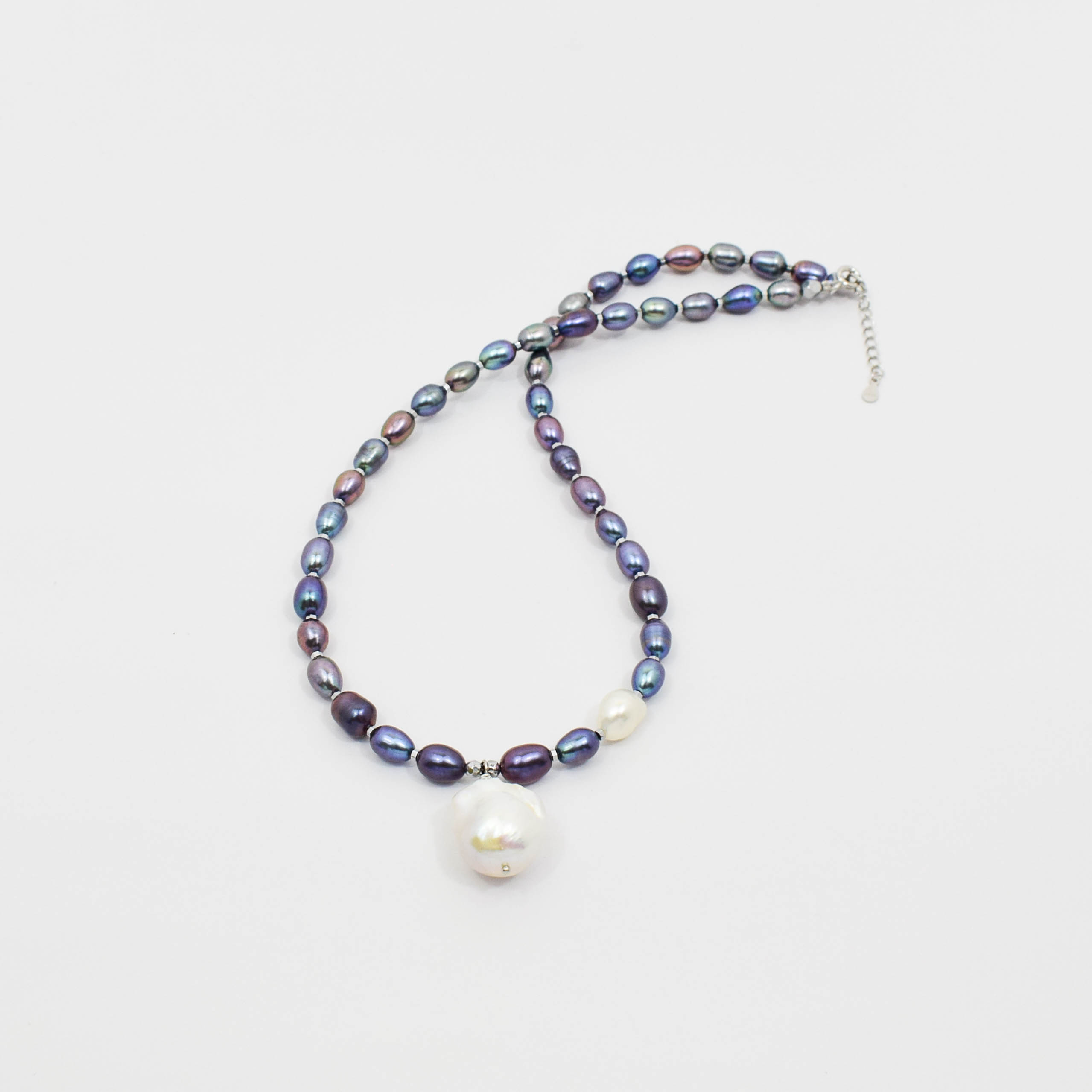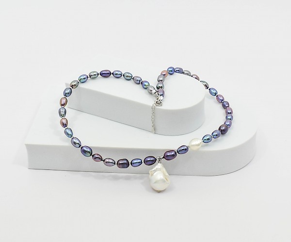 Colier din perle de cultura rainbow, perla baroque, pandantiv perla baroque, hematit electroplacat si argint 925.