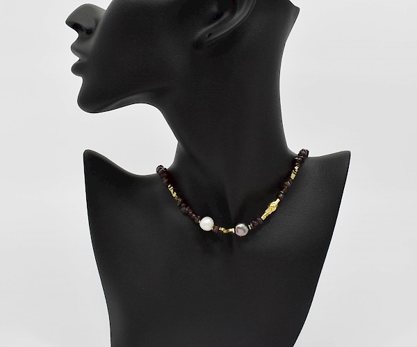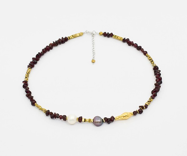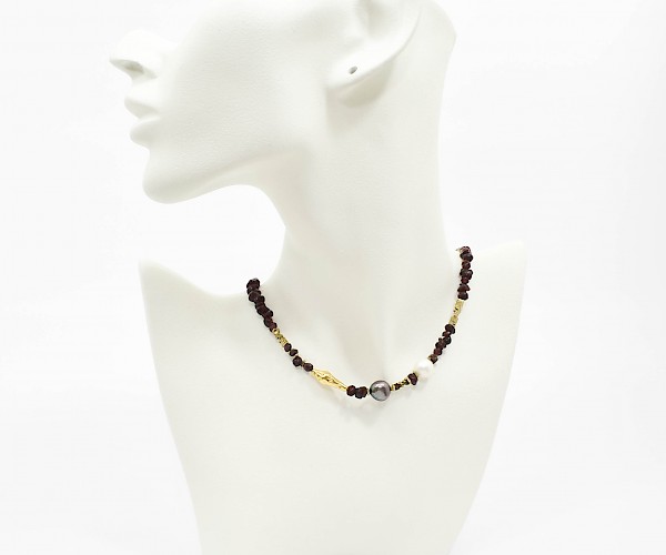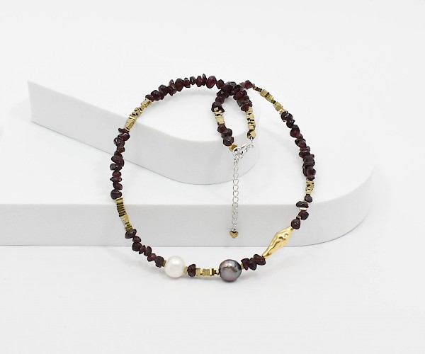 Colier din granat, perle de cultura, hematit electroplacat si argint 925.