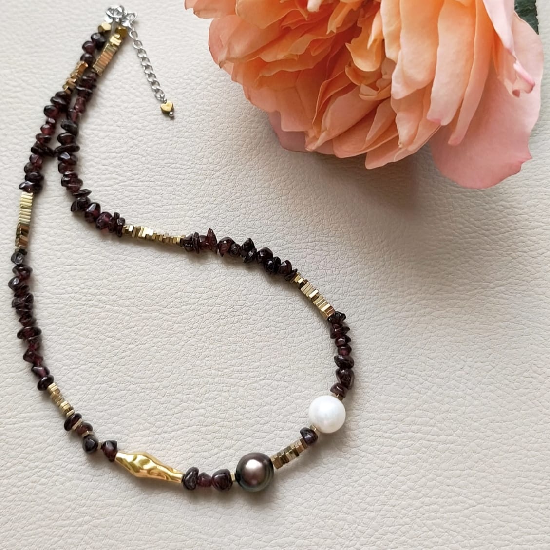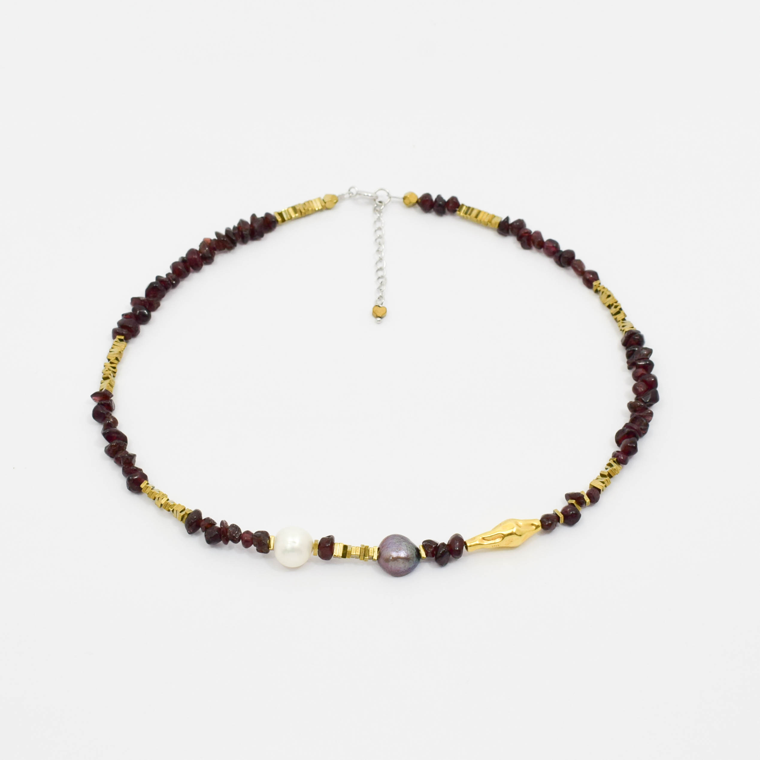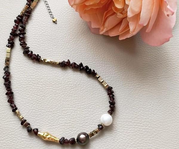 argint 925, granat, perle de cultura diferite nuante, hematit electroplacat