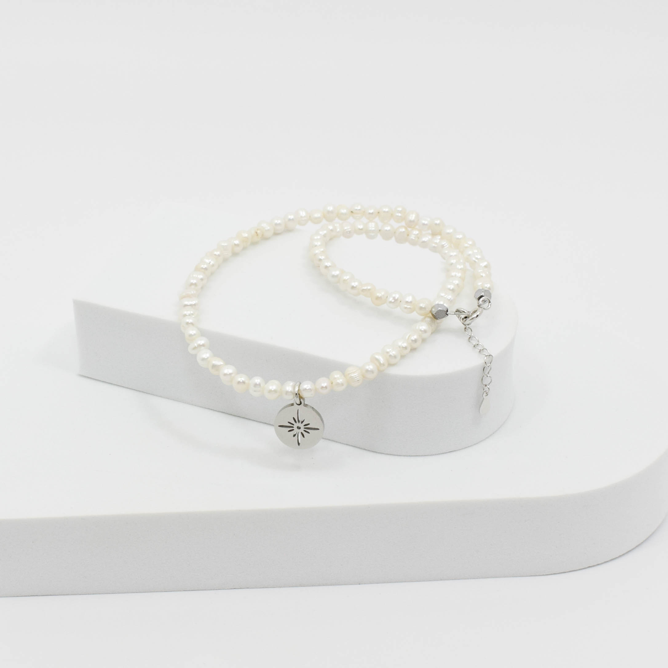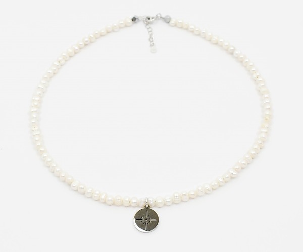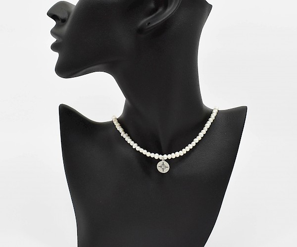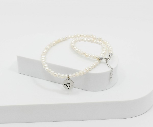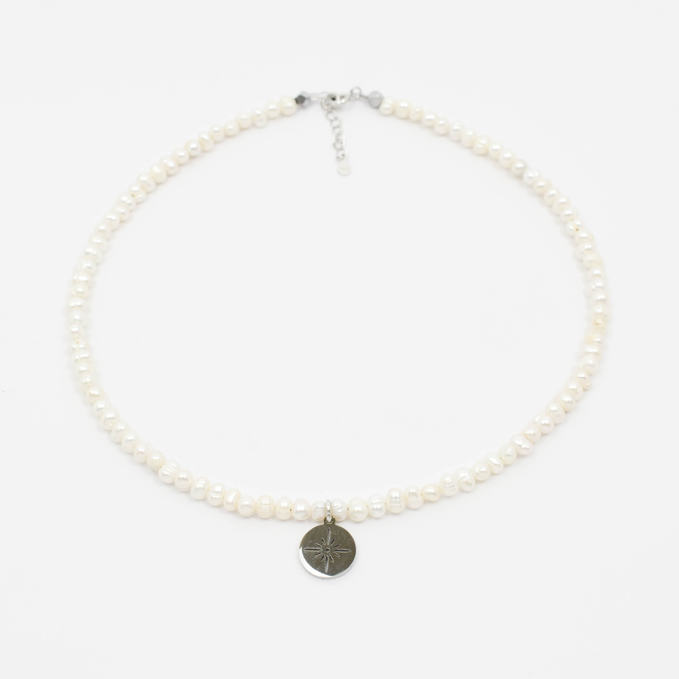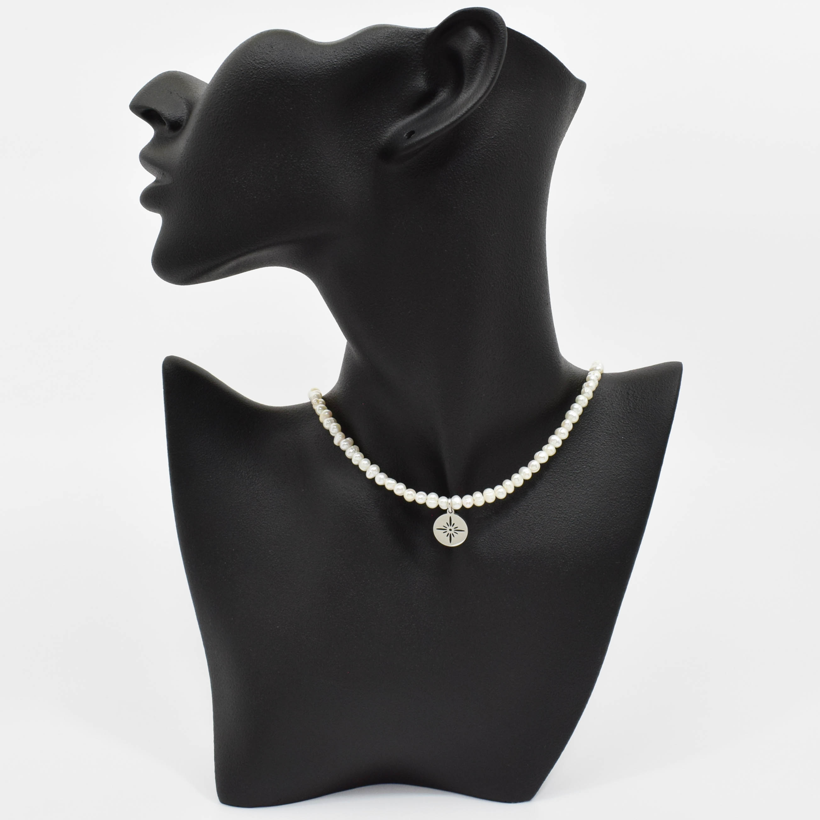Colier din perle de cultura albe mici, pandantiv banut din inox, hematit electroplacat si argint 925.