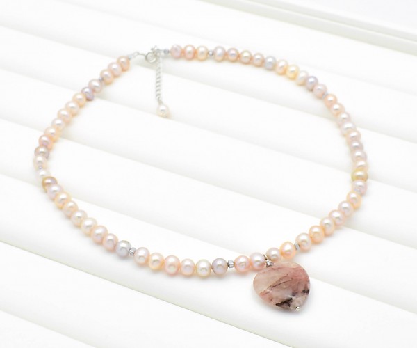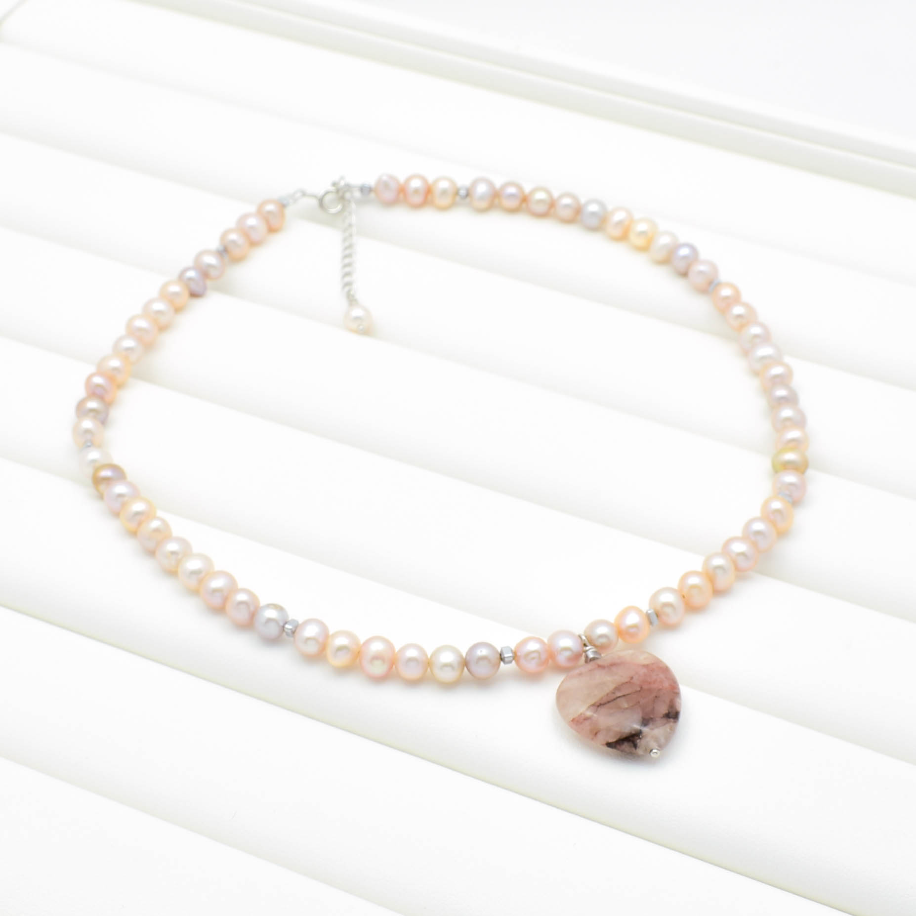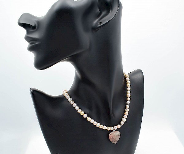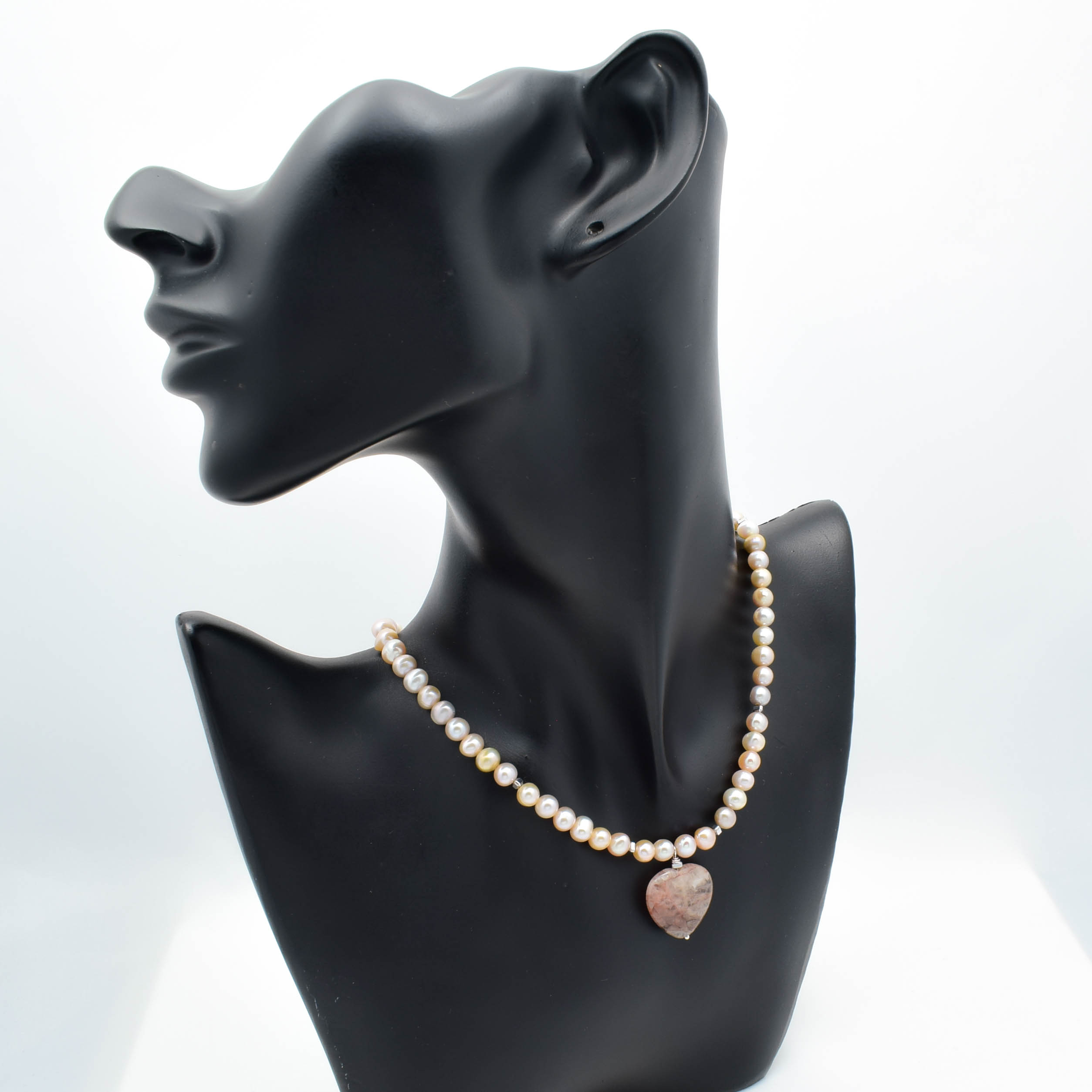Colier perle de cultura pastel, inima din lithium quartz, hematit electroplacat si argint 925.