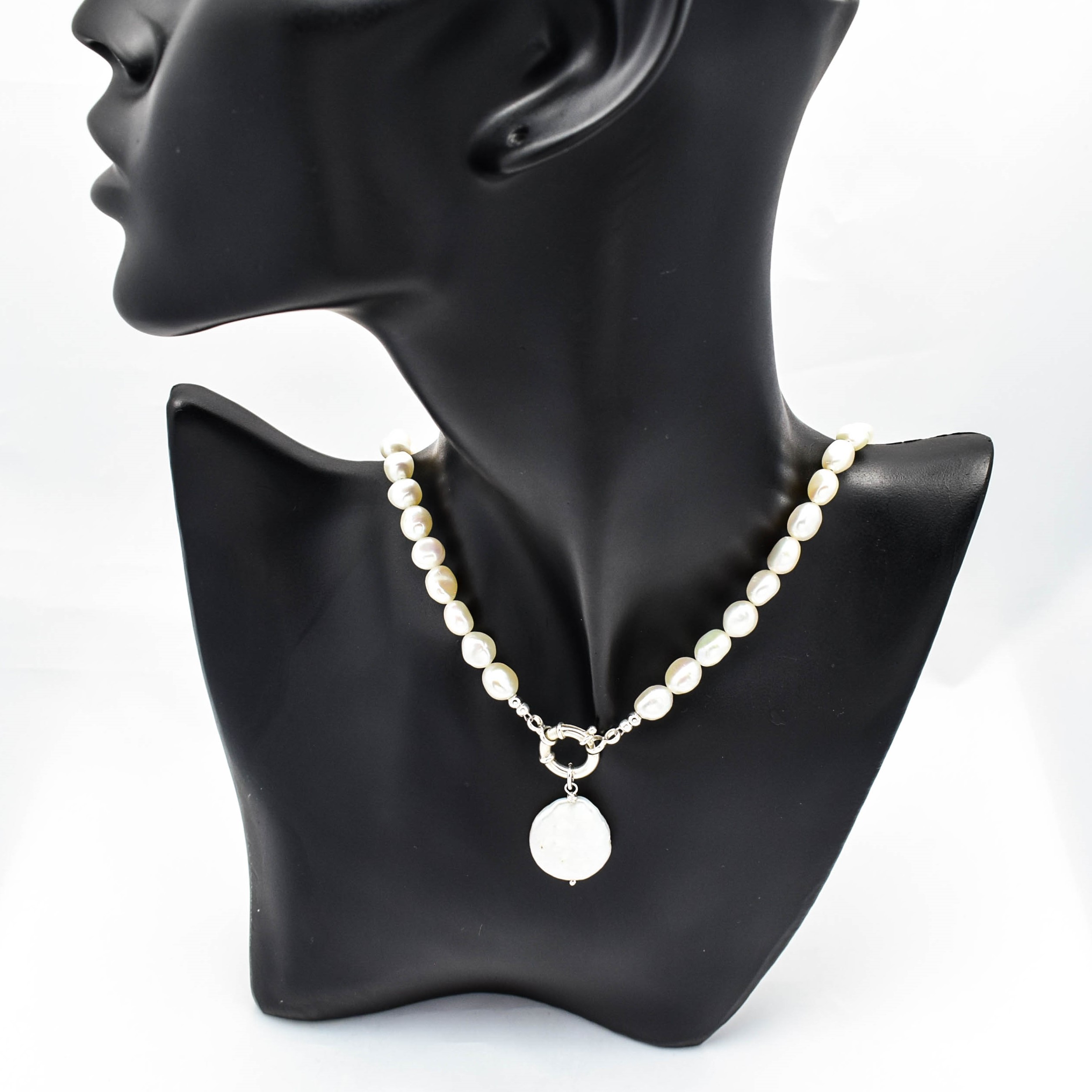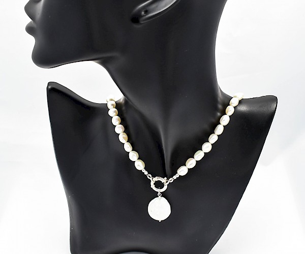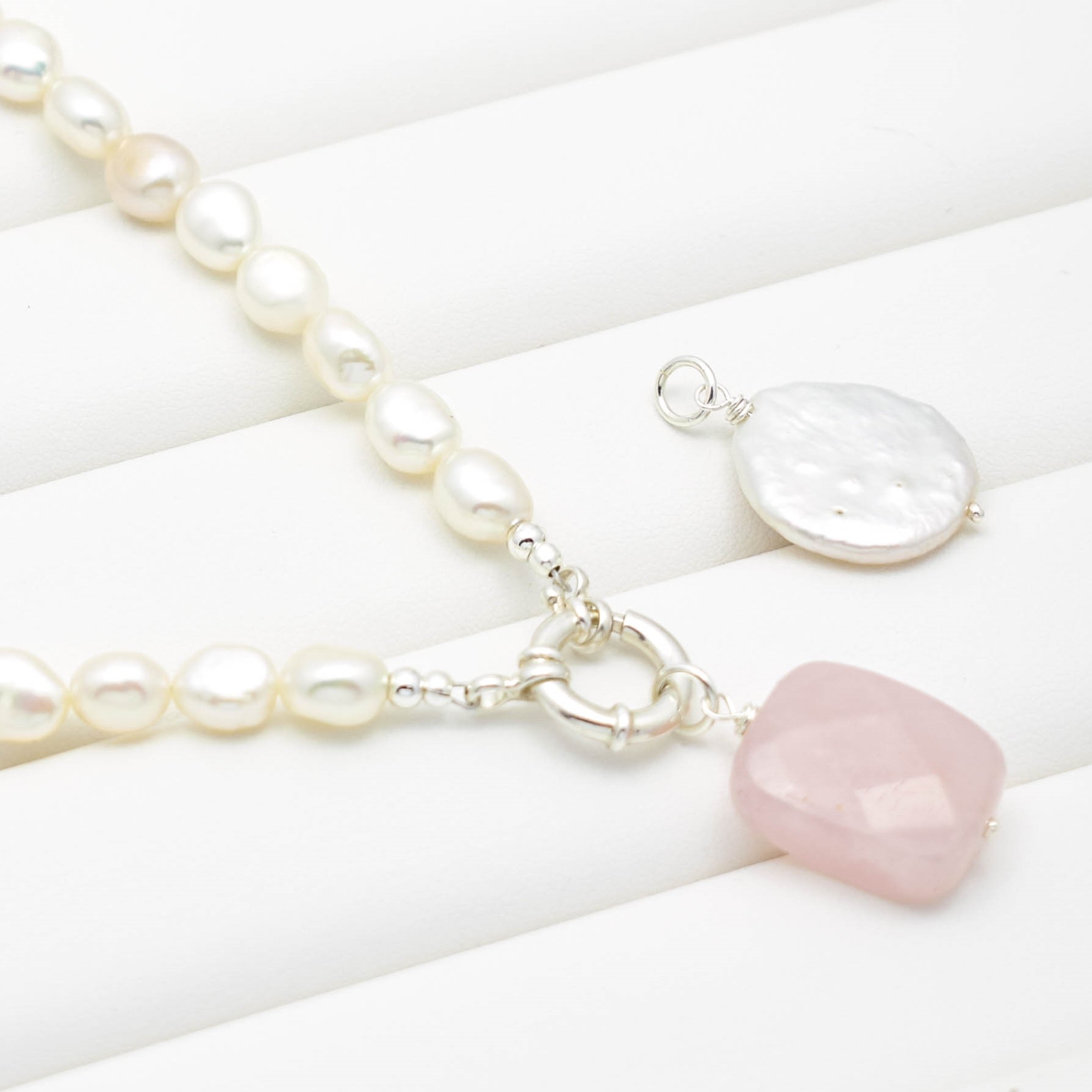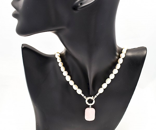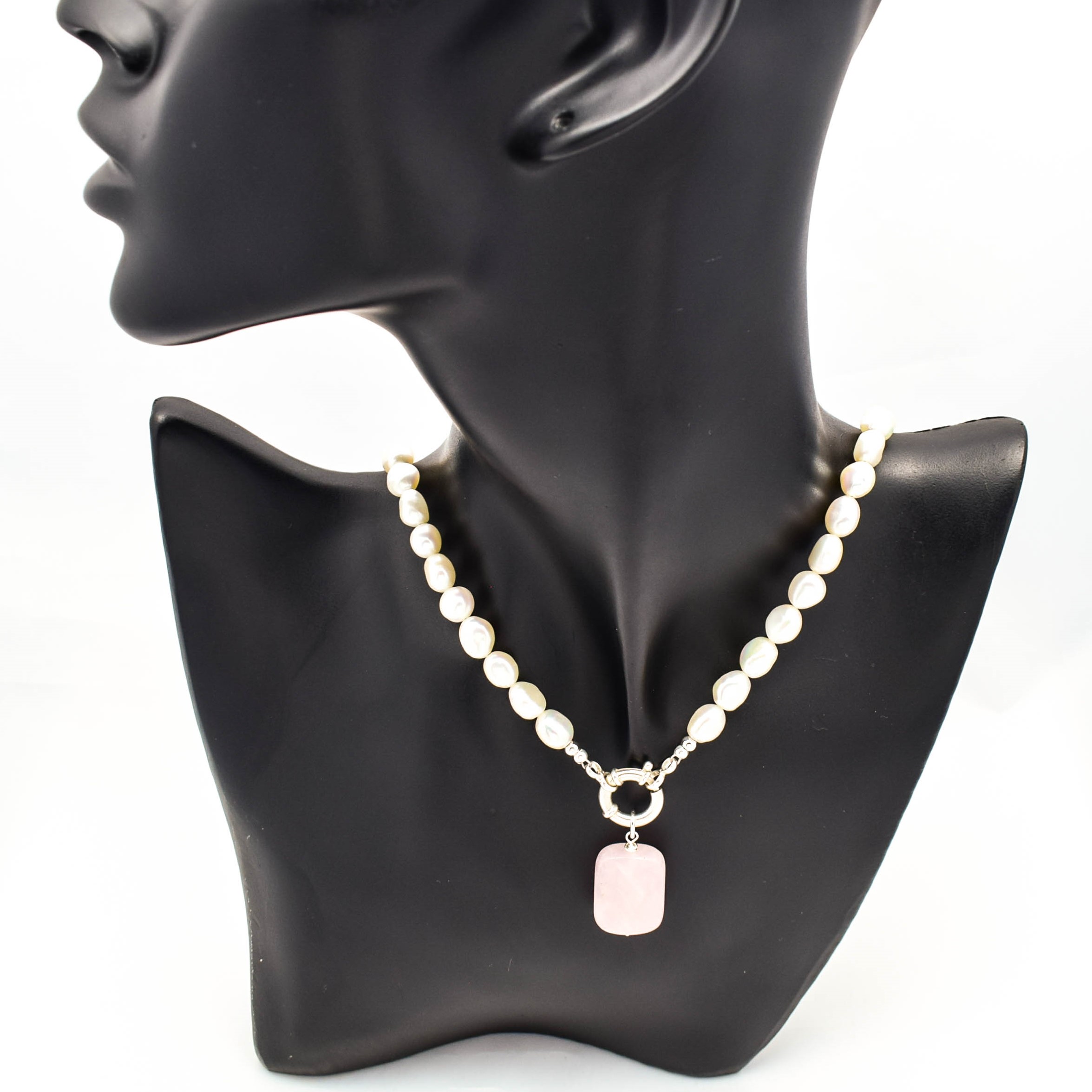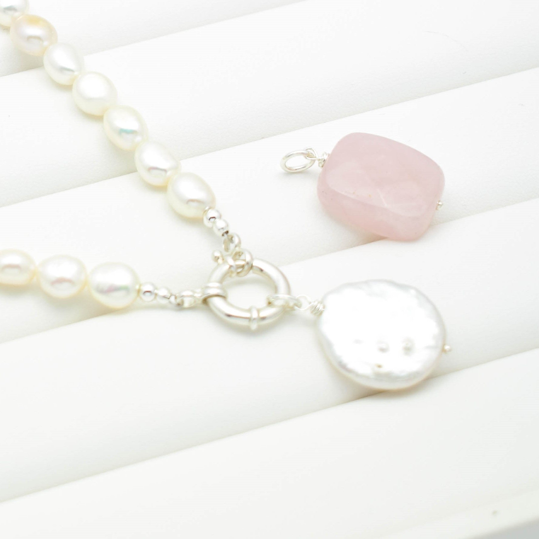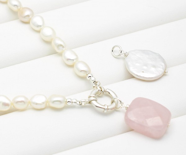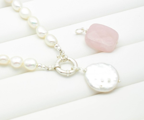 Colier din argint 925 si perle de cultura cu 2 pandantive detasabile, unul din cuart roz si unul cu o perla de cultura ban imensa.
