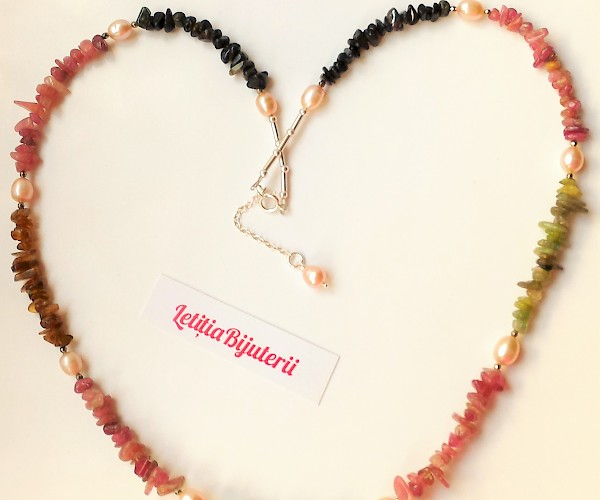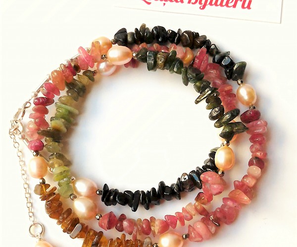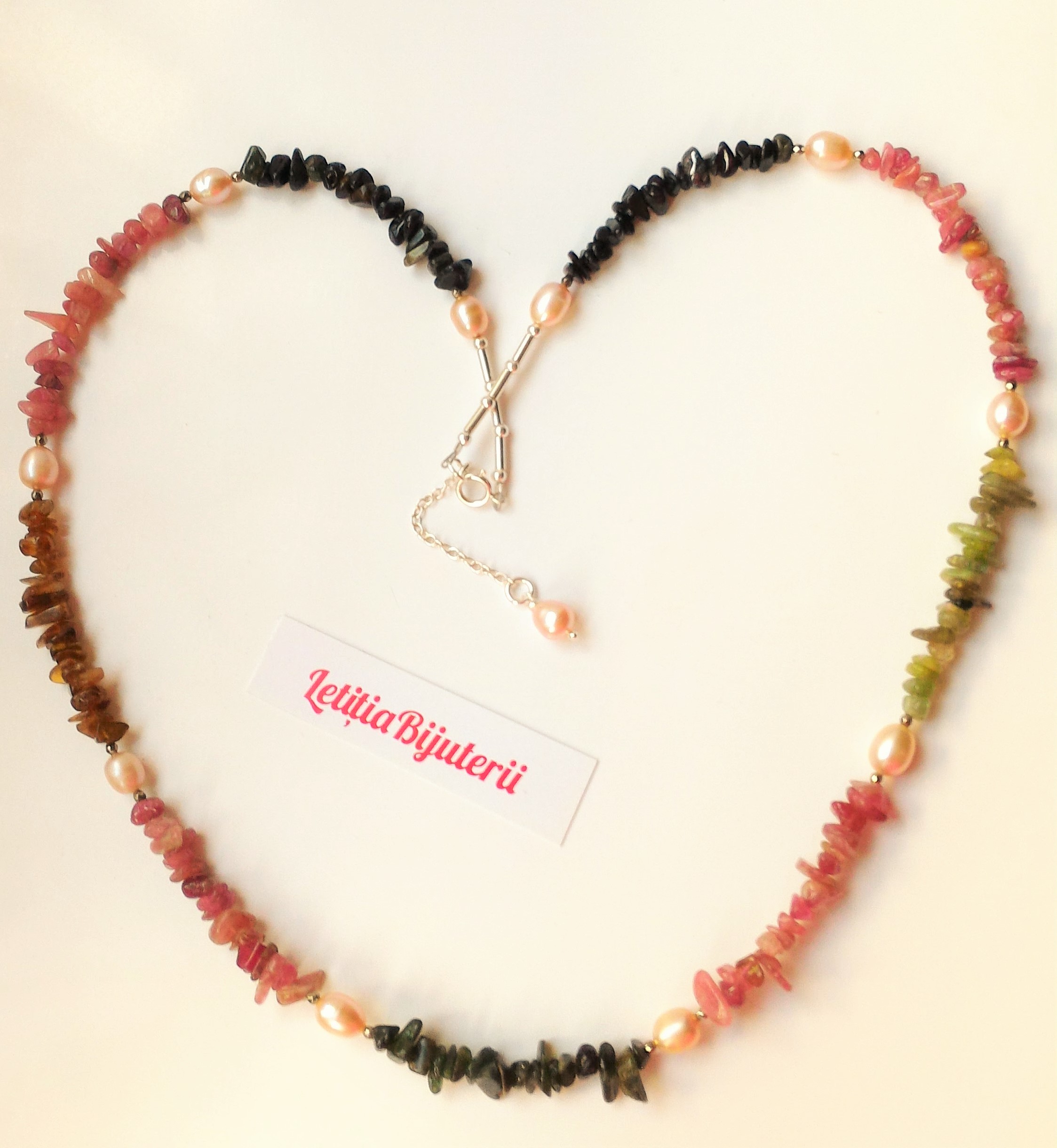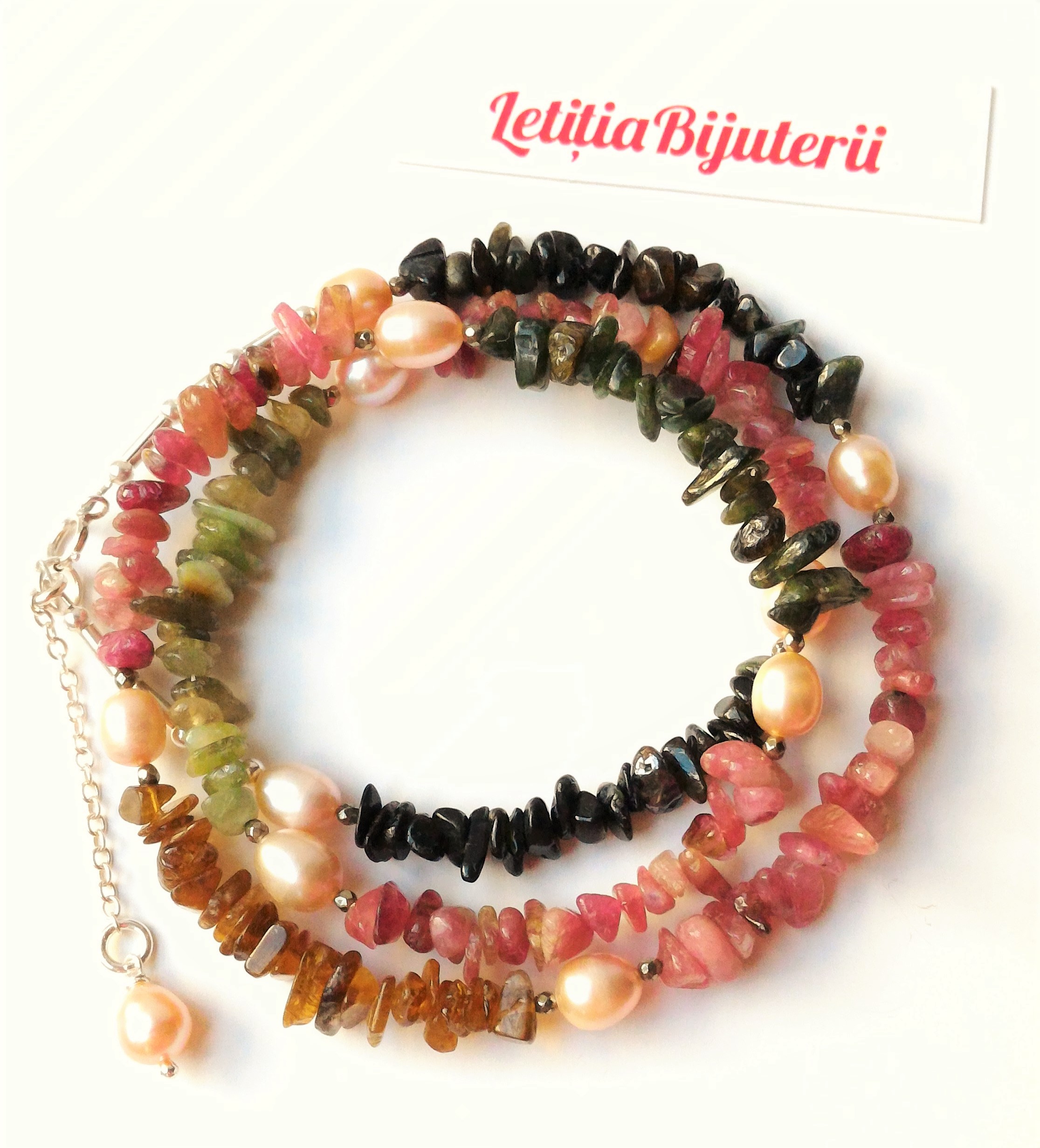 Colier din turmaline, perle de cultura, pirita si argint 925