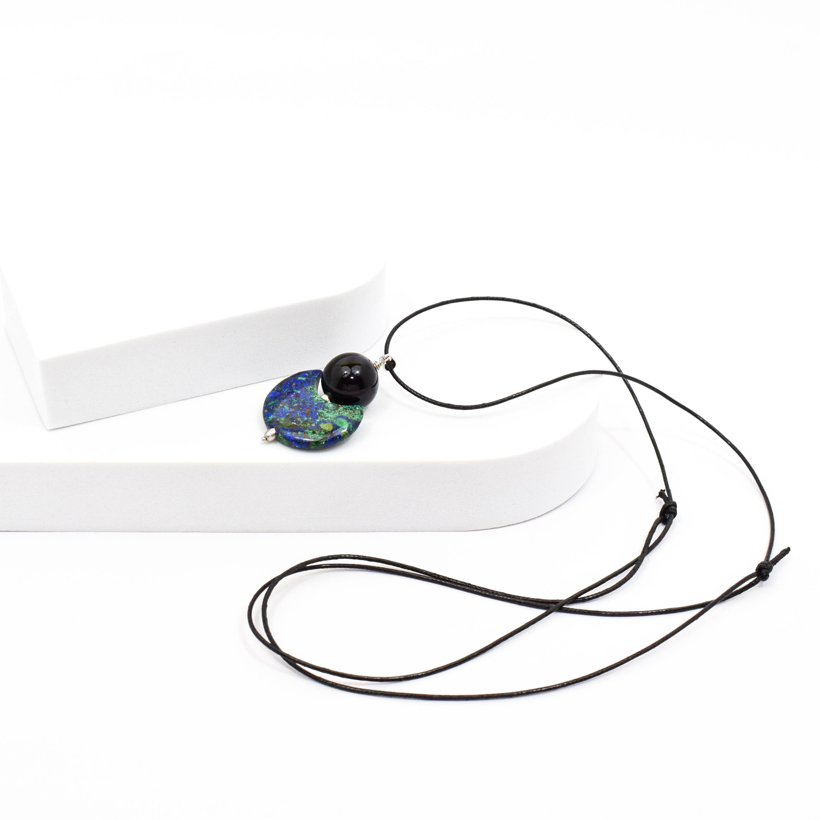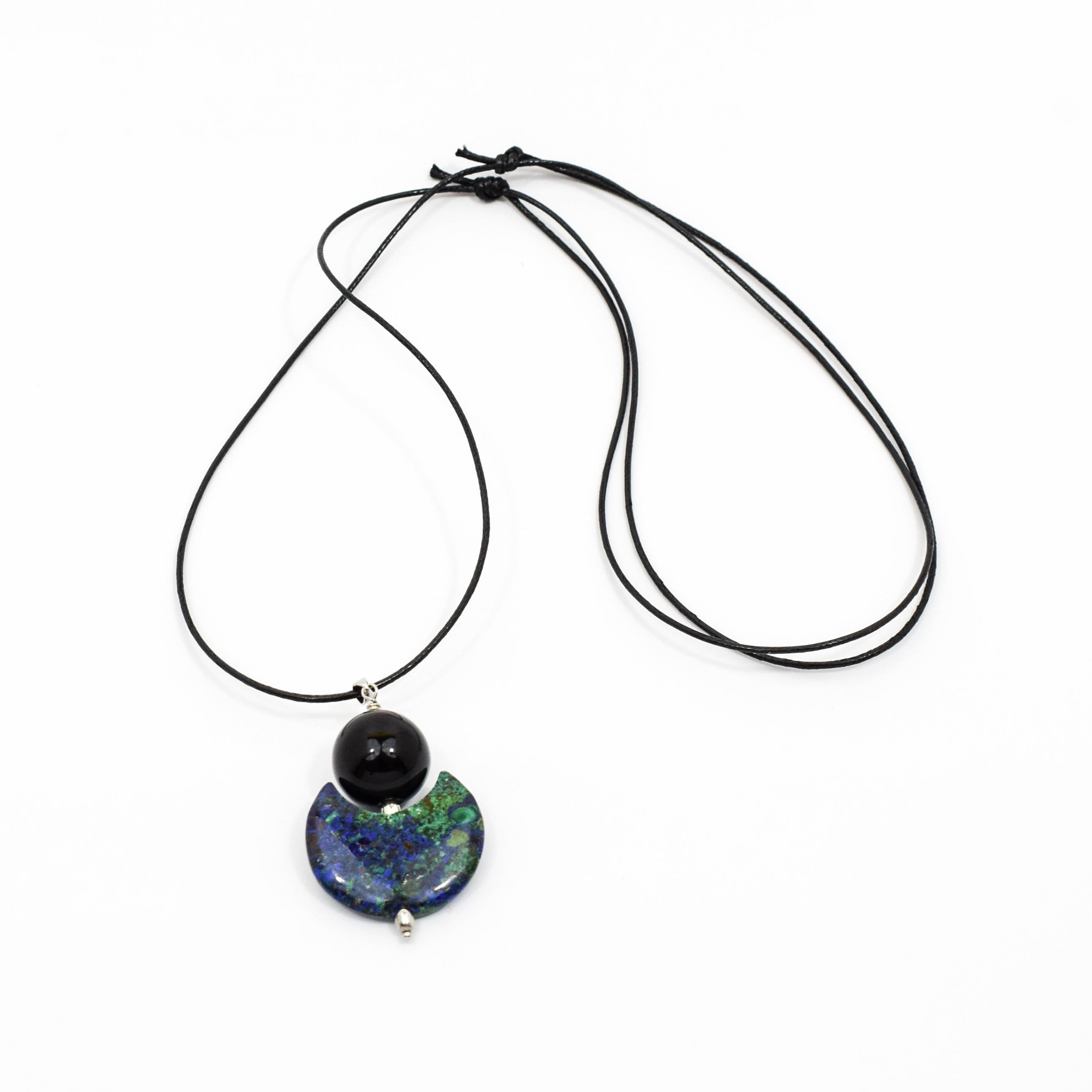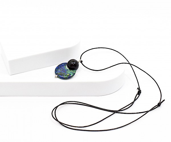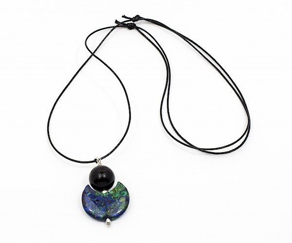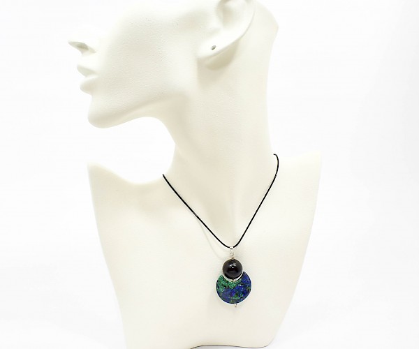 Pandantiv din argint 925 cu azurit-malachit si onix, pe snur negru reglabil.