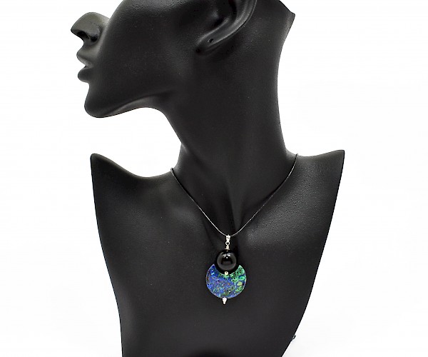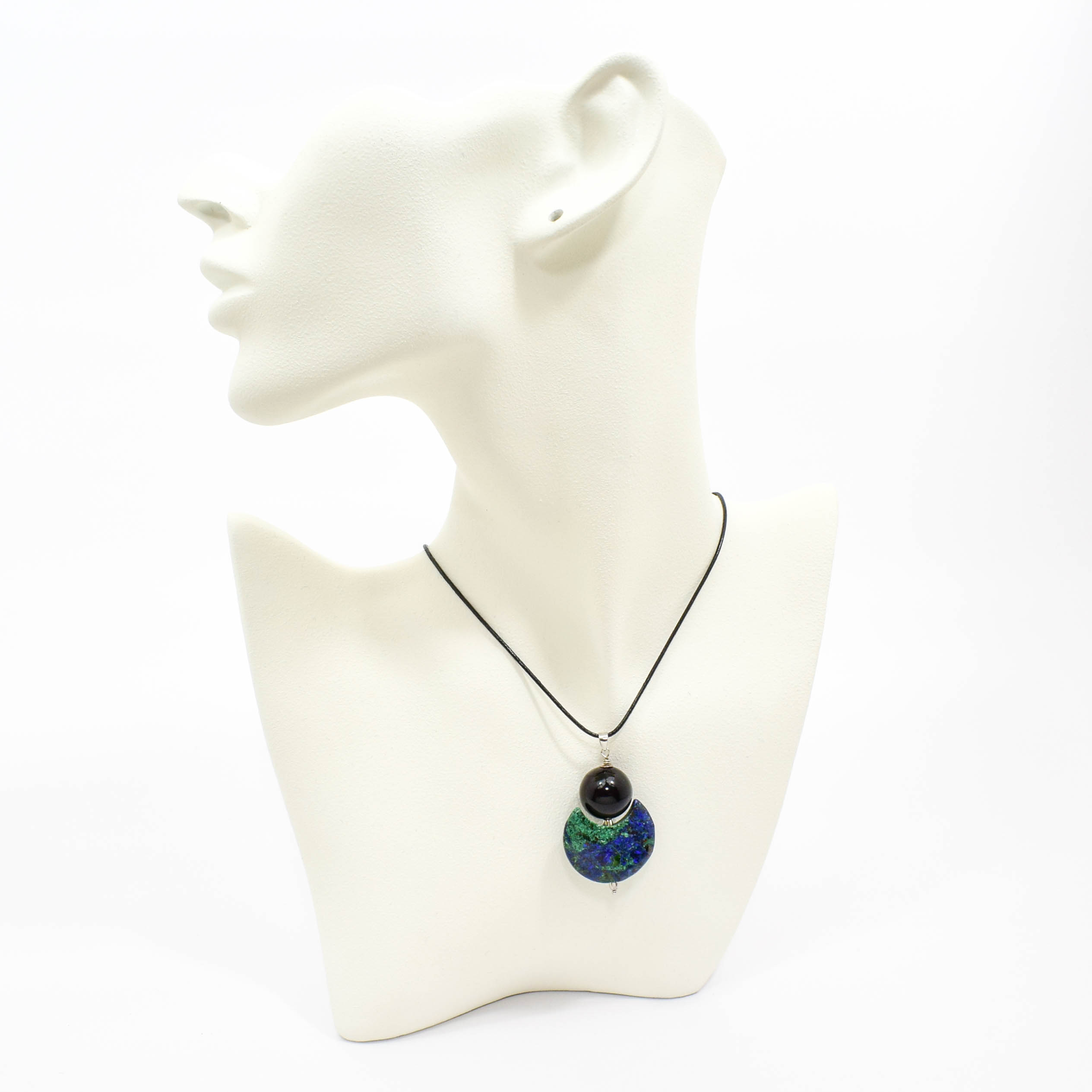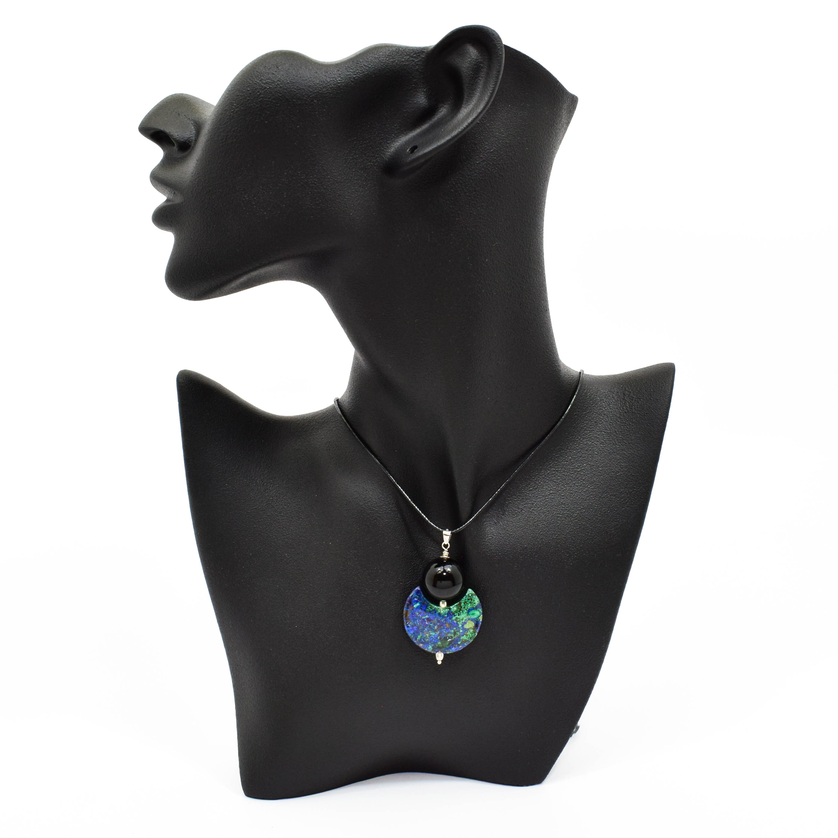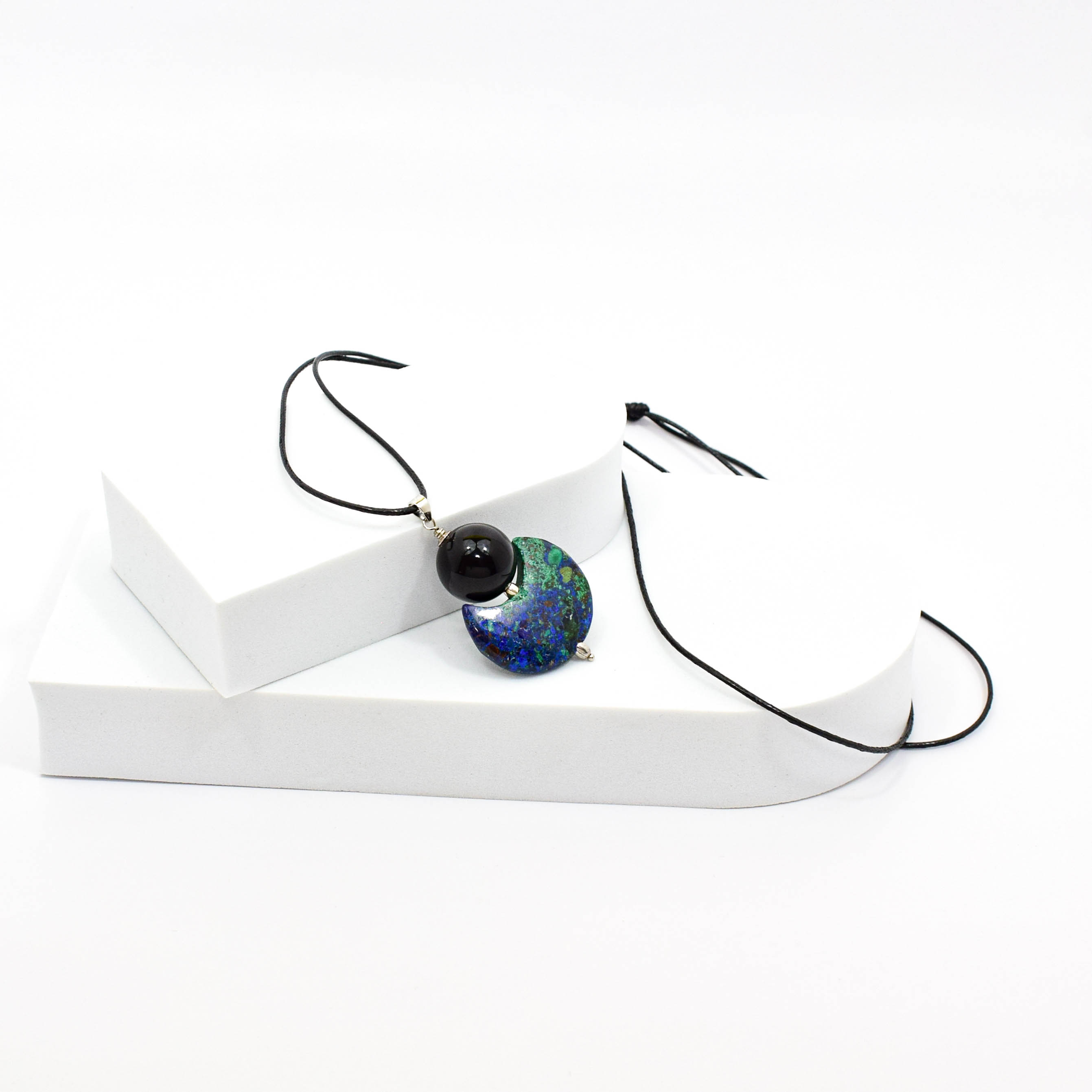 Pandantiv din argint 925 cu azurit-malachit si onix, pe snur negru reglabil.