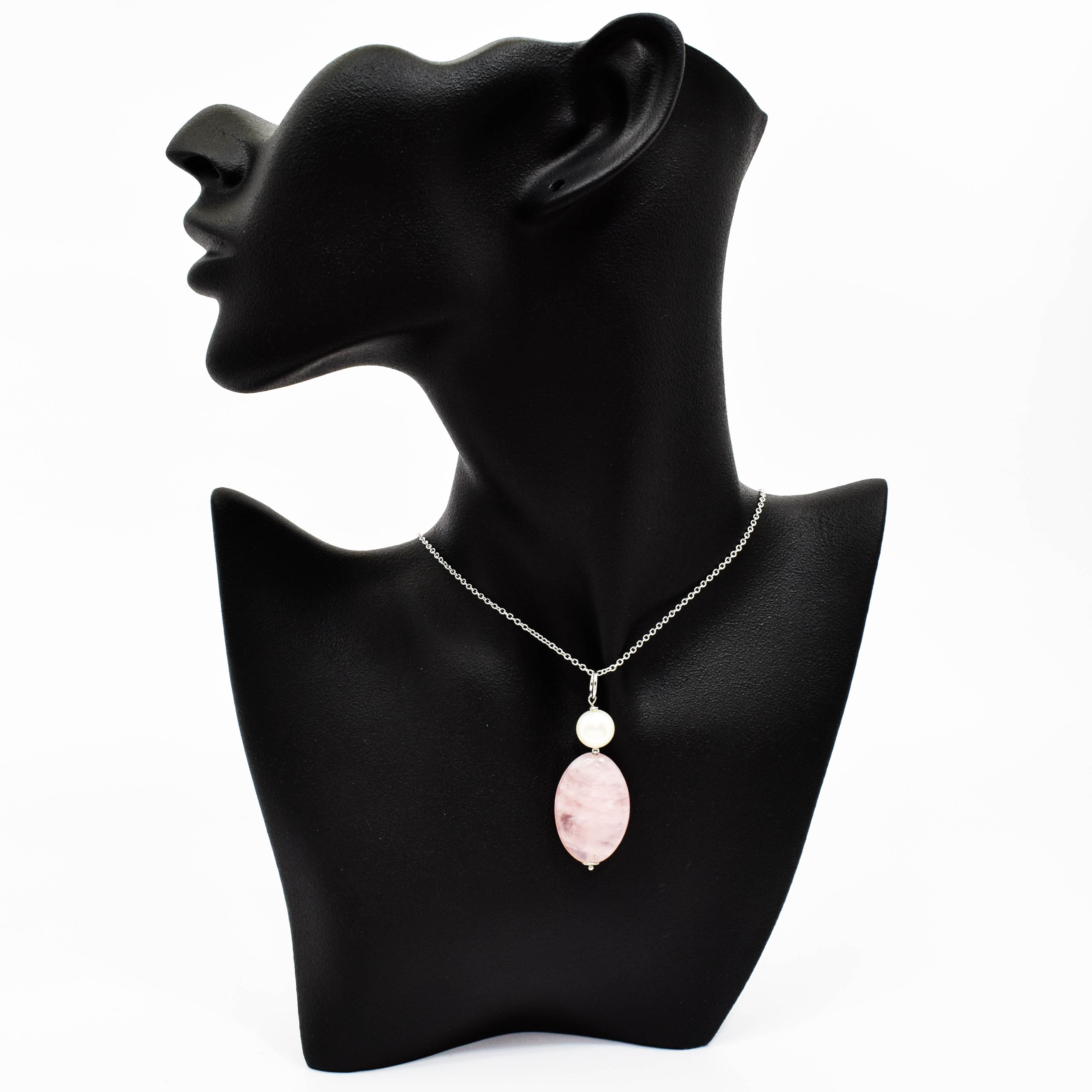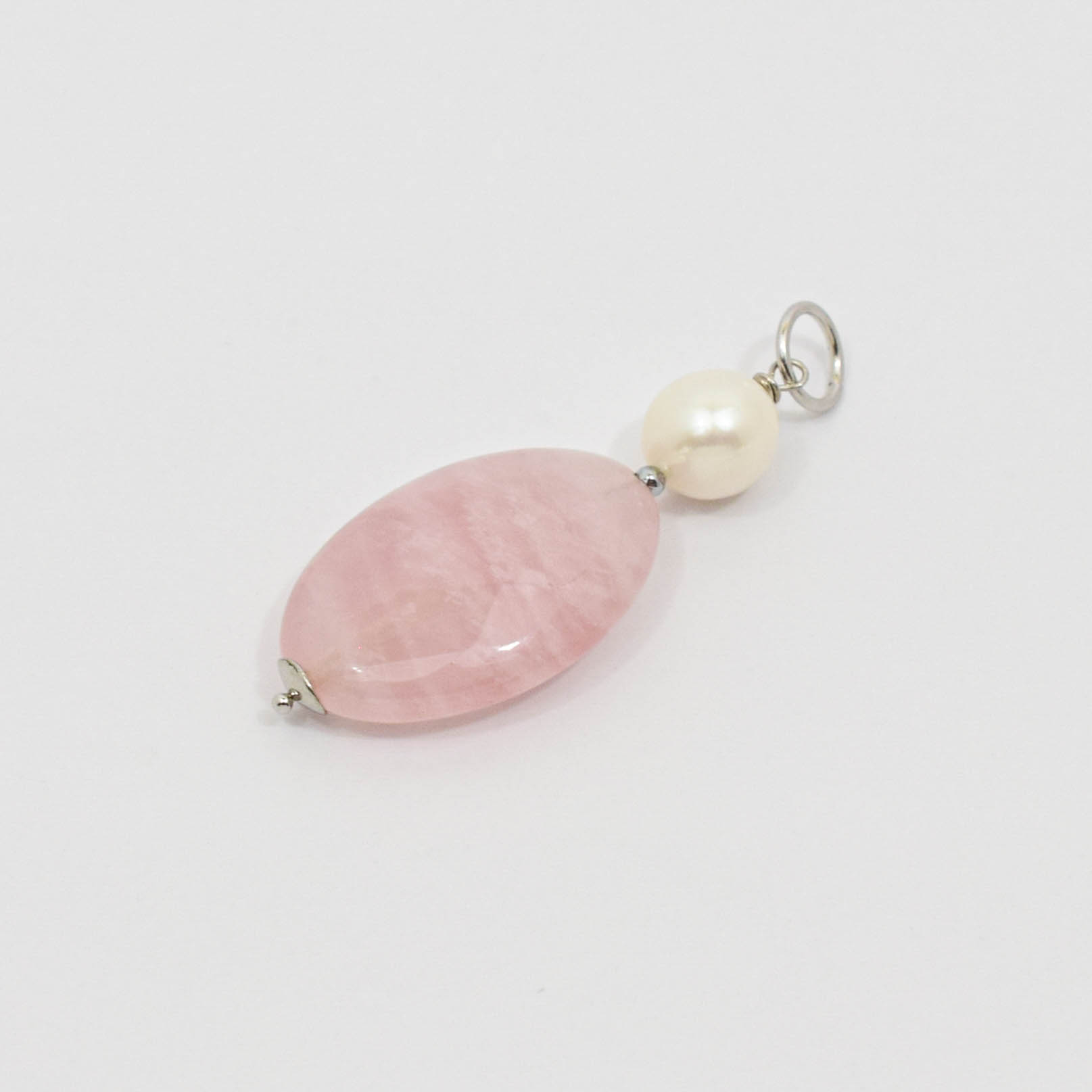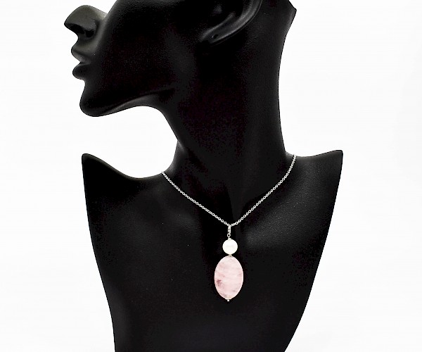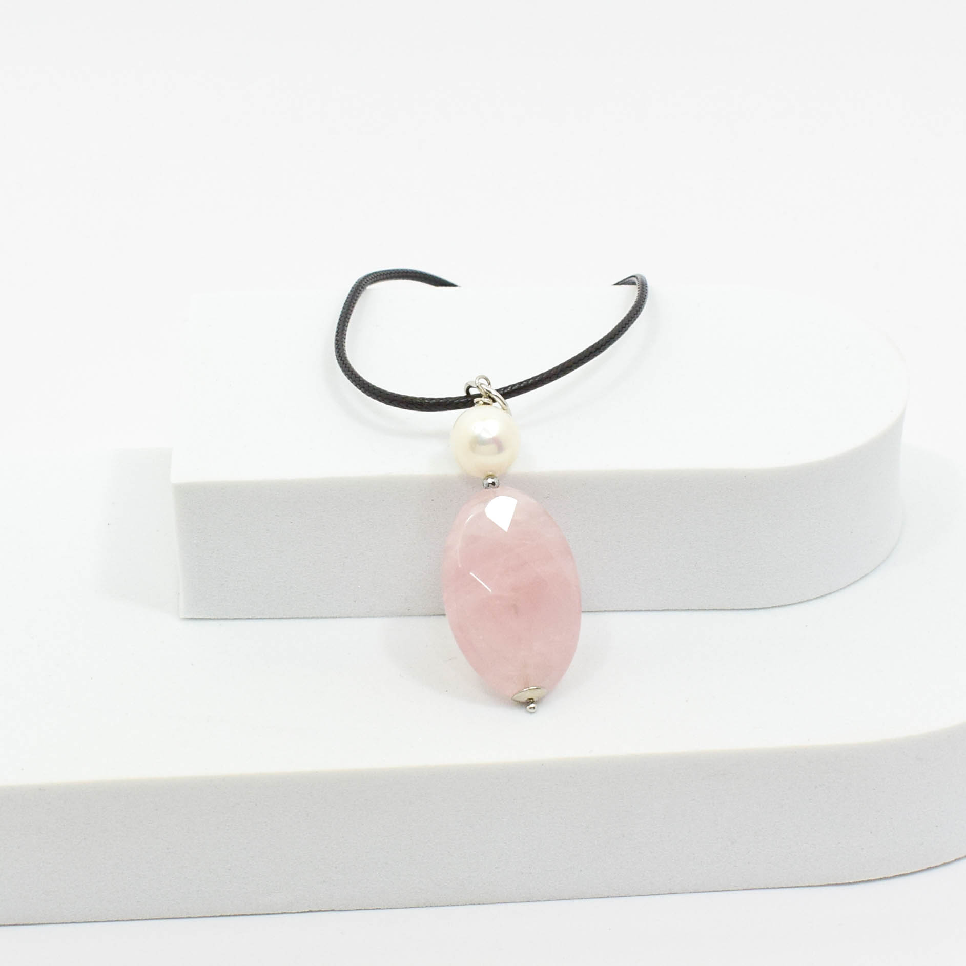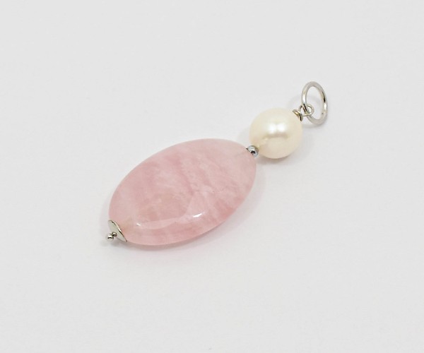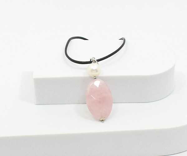 Pandantiv din cuart roz, perla de cultura, hematit electroplacat si argint 925. Fiecare piatra semipretioasa (perla de cultura), este unica si exista posibilitatea sa apara mici diferente fata de modelul prototip din imagine.