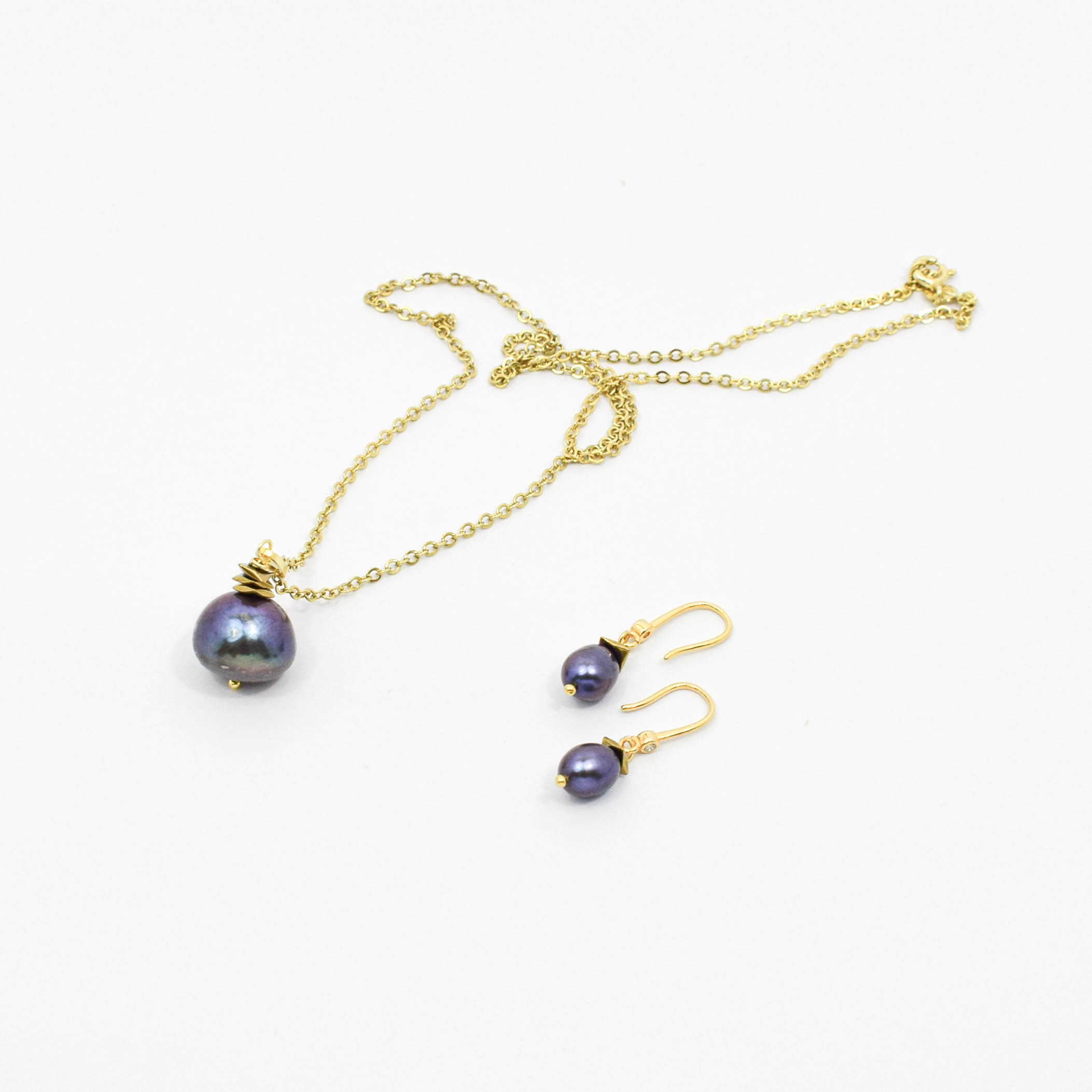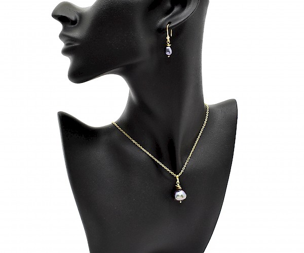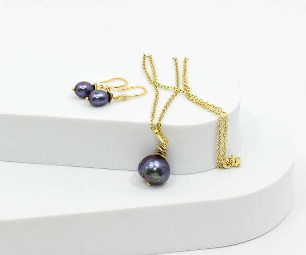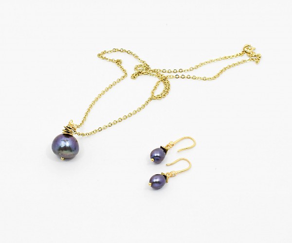Cercei si pandantiv pe lantisor din argint 925 aurit cu perle de cultura mov si hematit electroplacat.