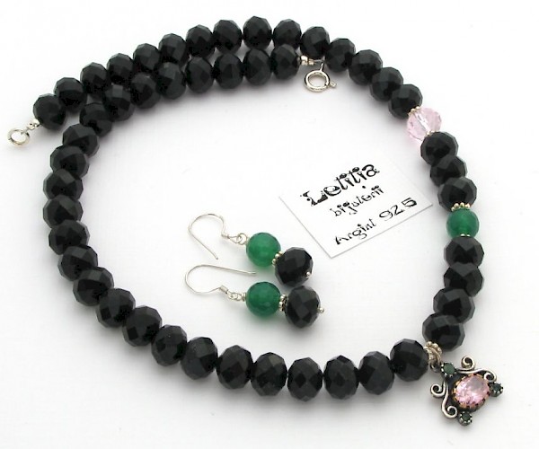 Cercei si colier (42 cm) - jad, margele din sticla fatetata si argint 925.
