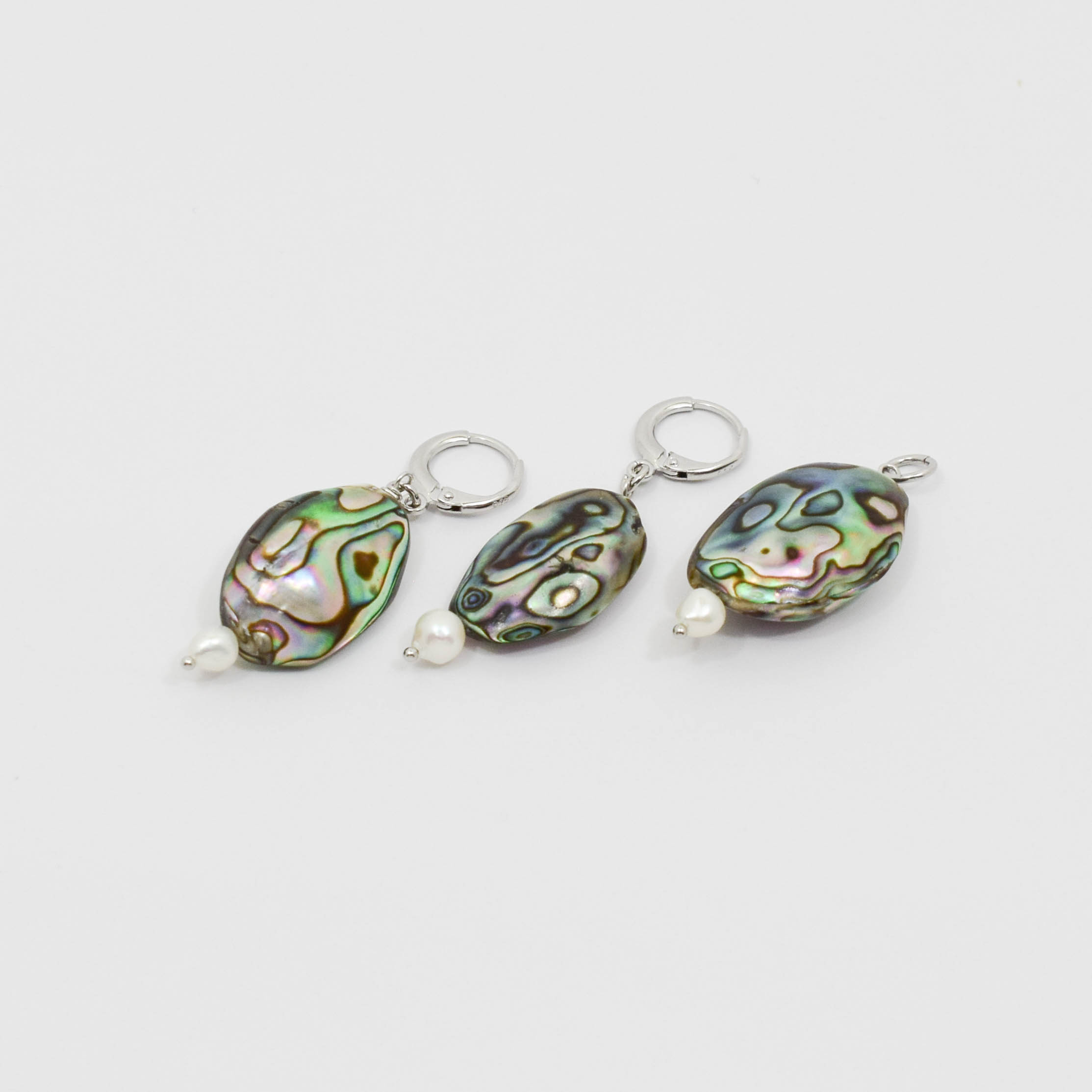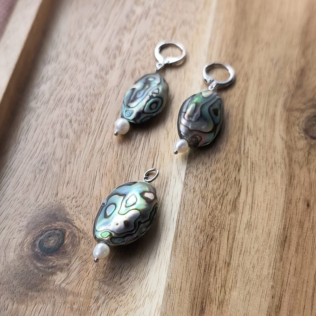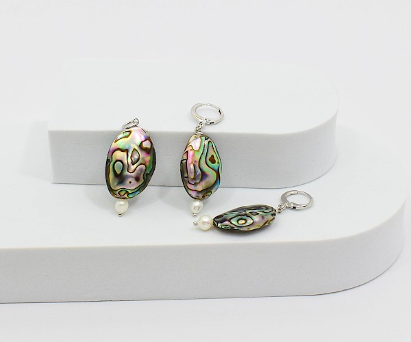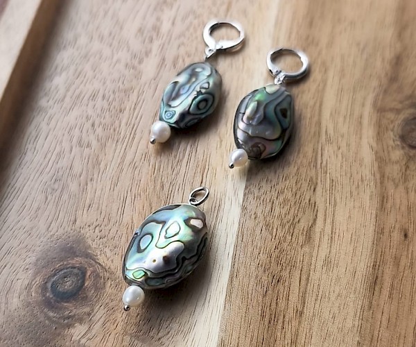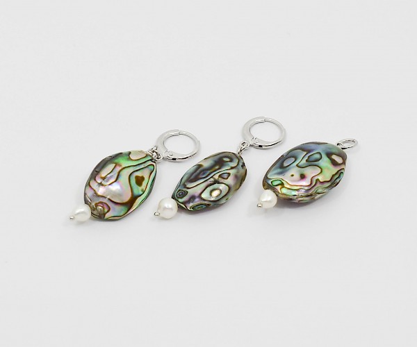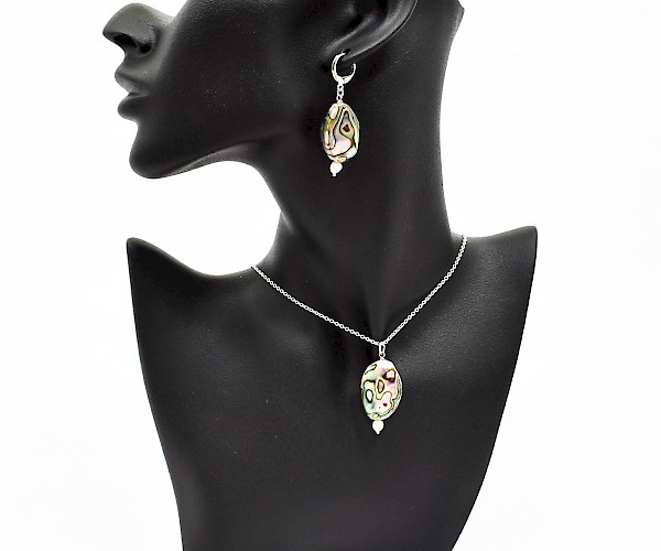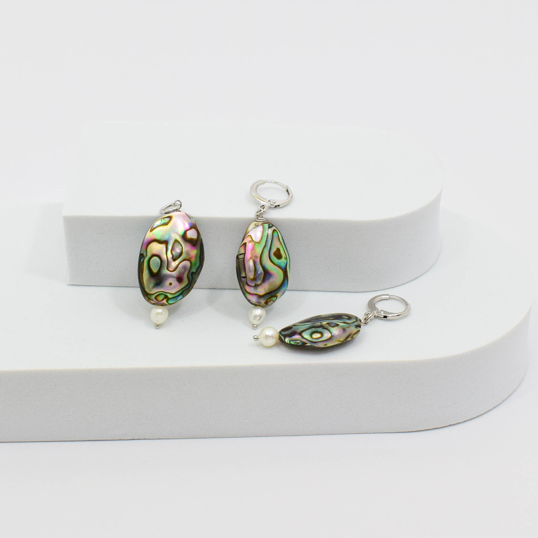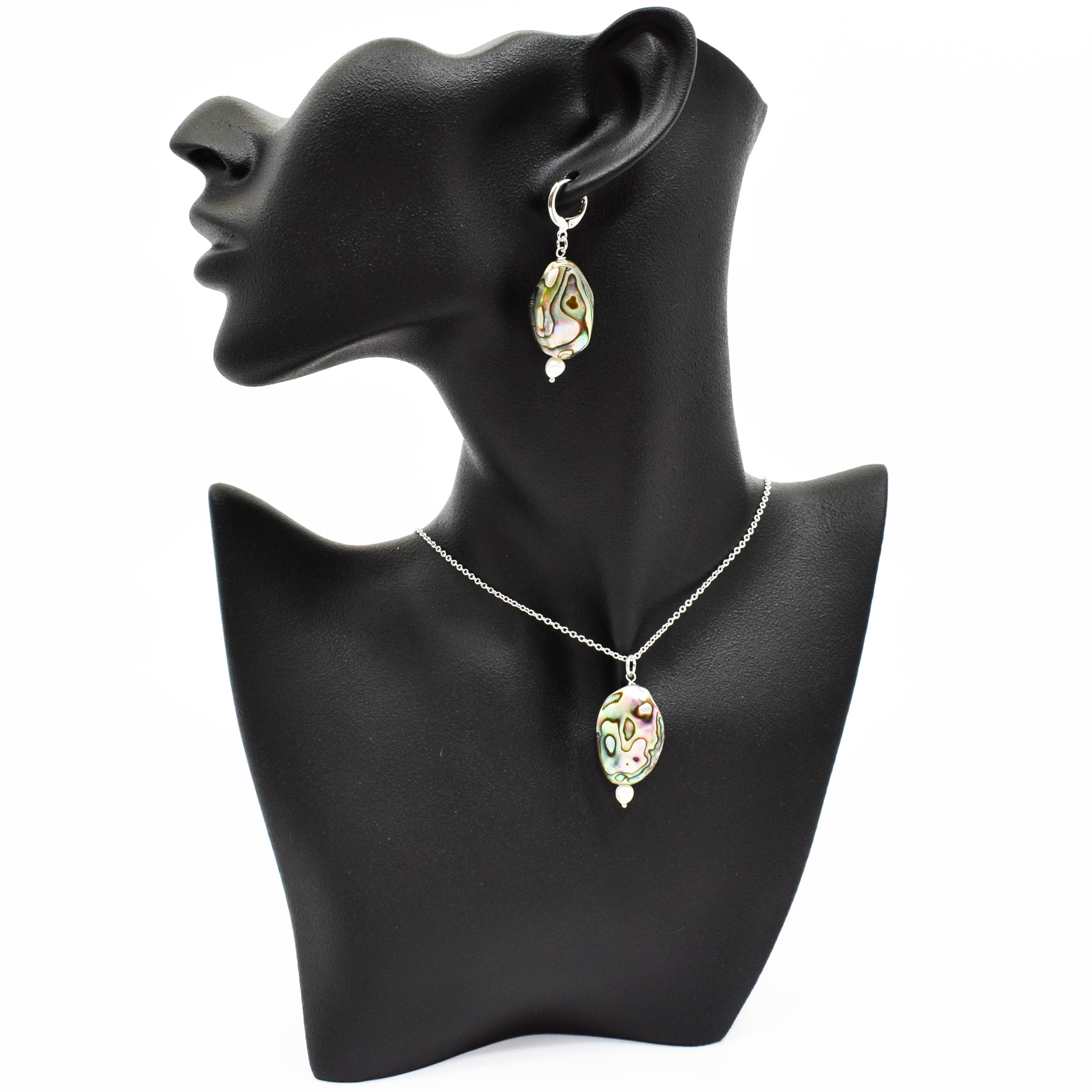 Cercei si pandantiv cu sidef paua/abalone, perle de cultura albe si argint 925.